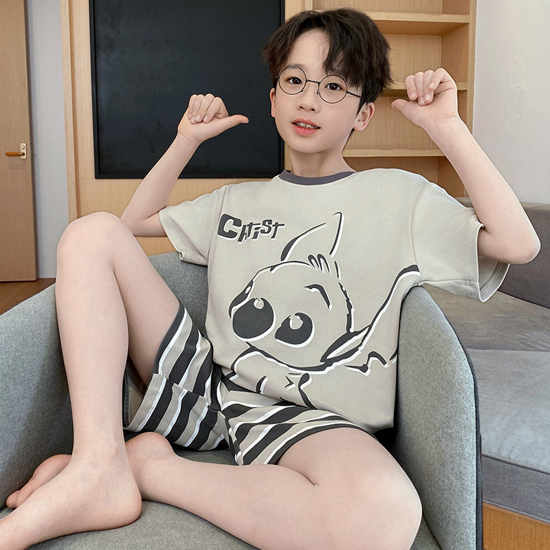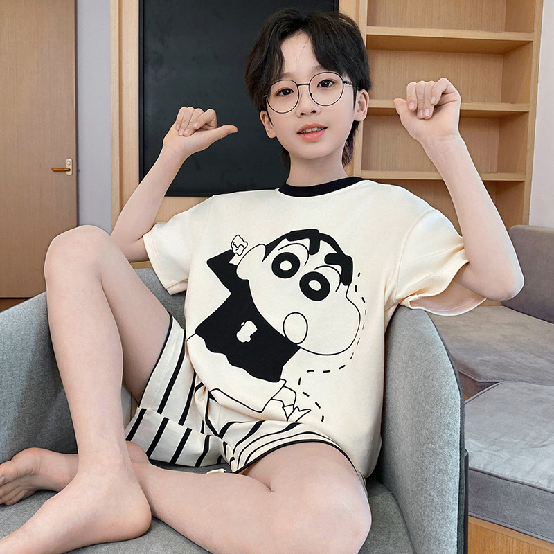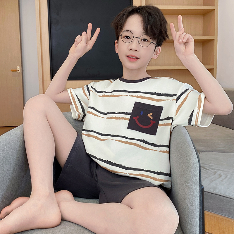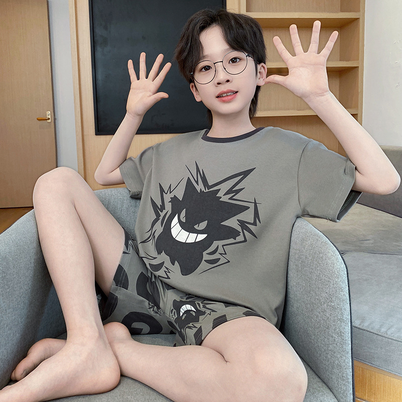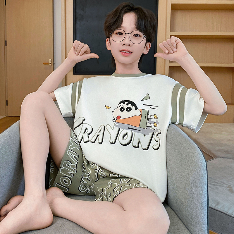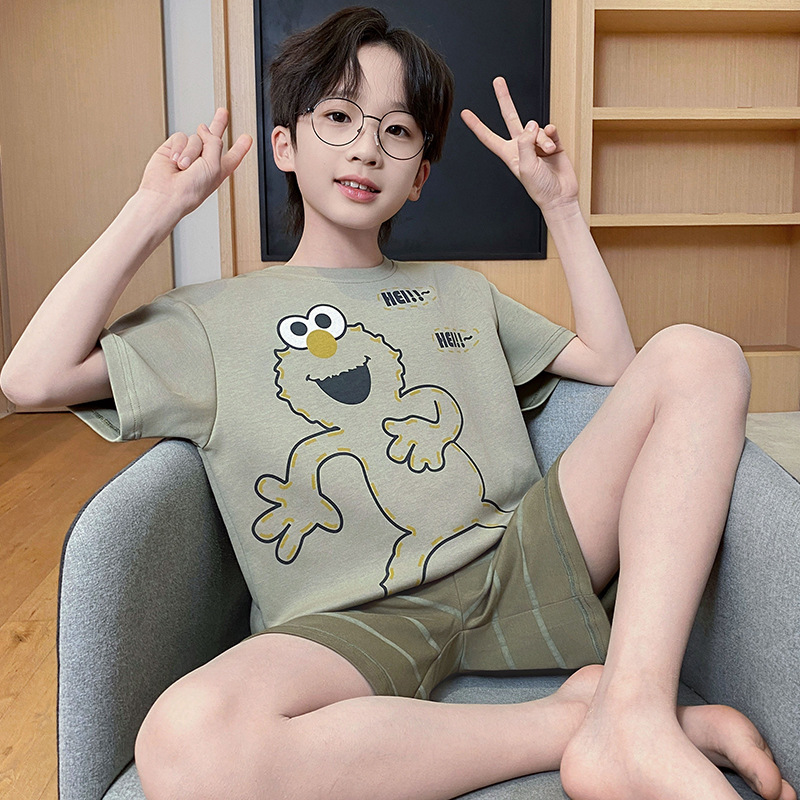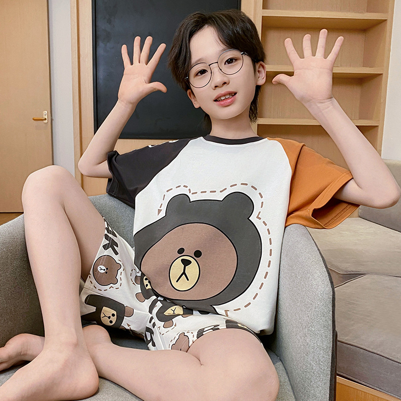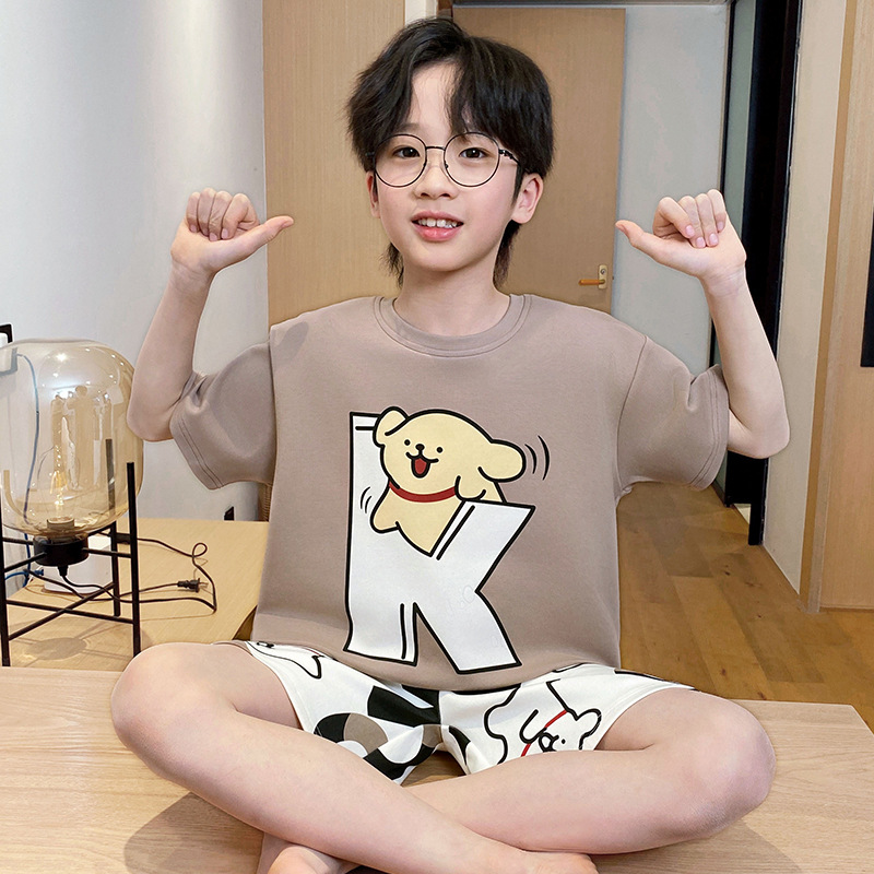2025 새로운 소년 잠옷 어린이 순수 코튼 여름 얇은 반팔 소년 청소년 큰 어린이 가정 의류 세트