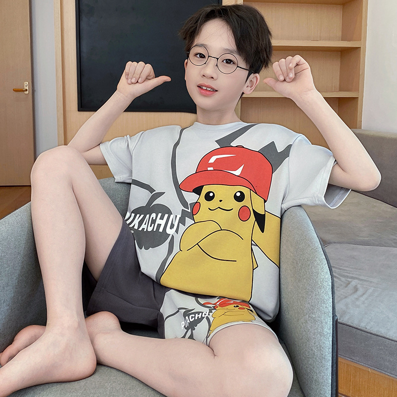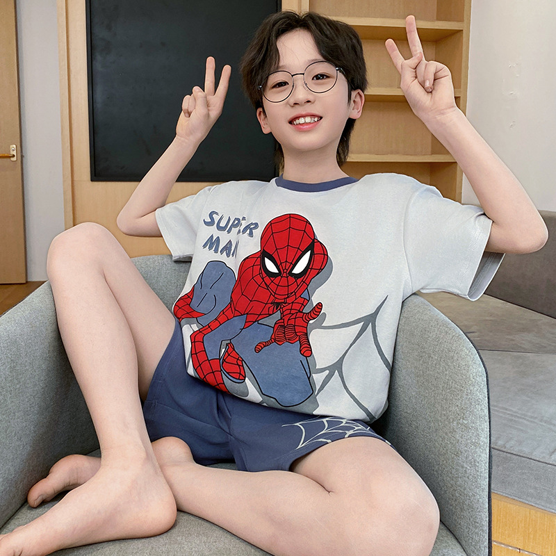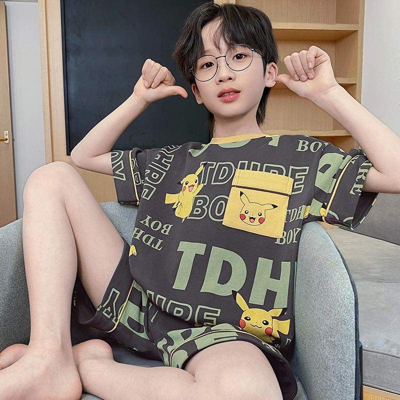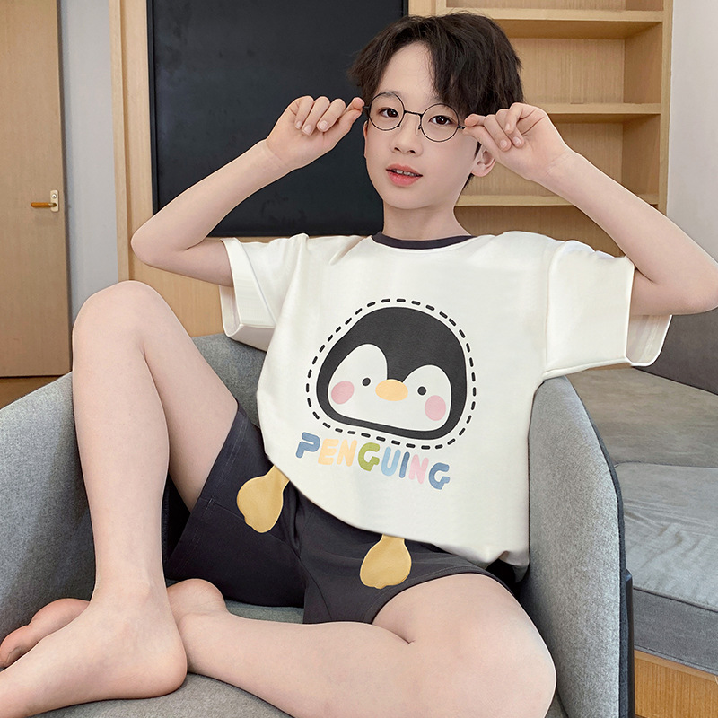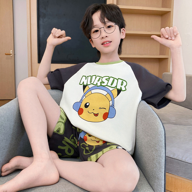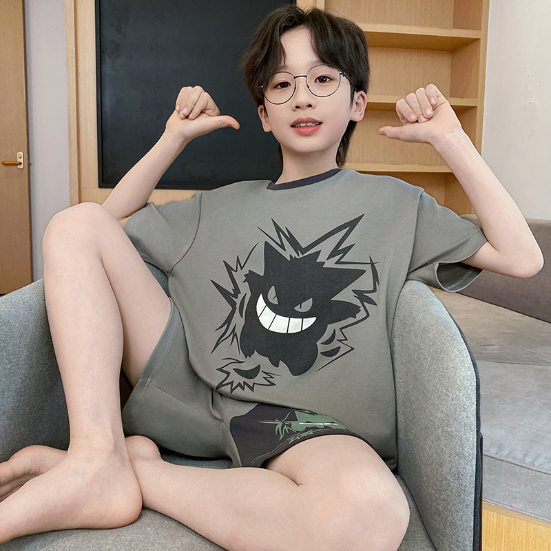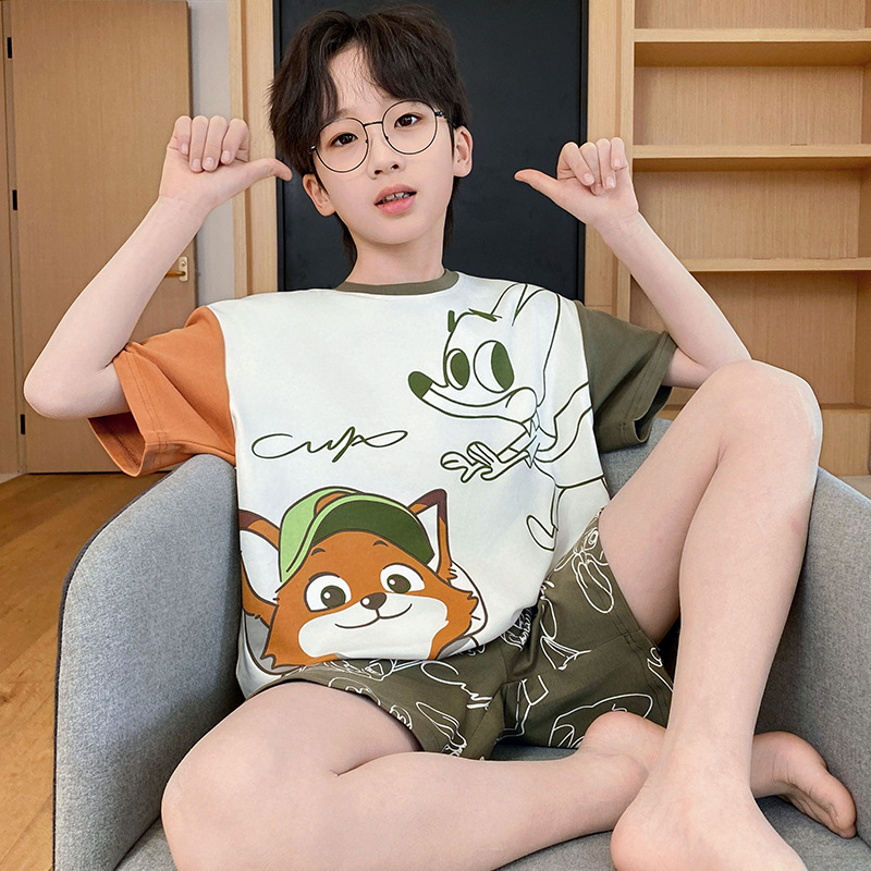 2025 새로운 소년 잠옷 어린이 순수 코튼 여름 얇은 반팔 소년 청소년 큰 어린이 가정 의류 세트