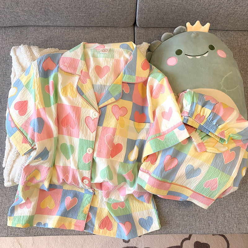 구름 코튼 파자마 여성용 반팔 여름 도파민 다채로운 사랑 달콤한 샤넬 스타일 홈 의류 세트 착용 가능