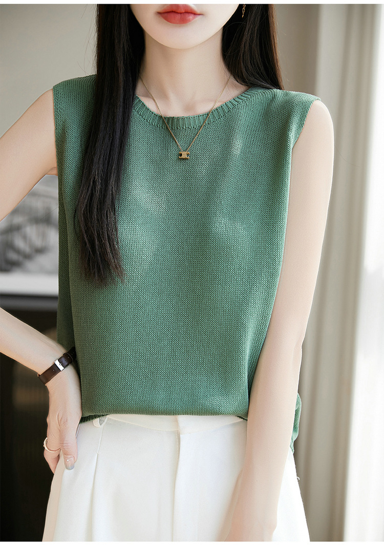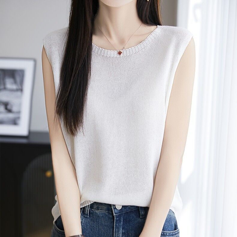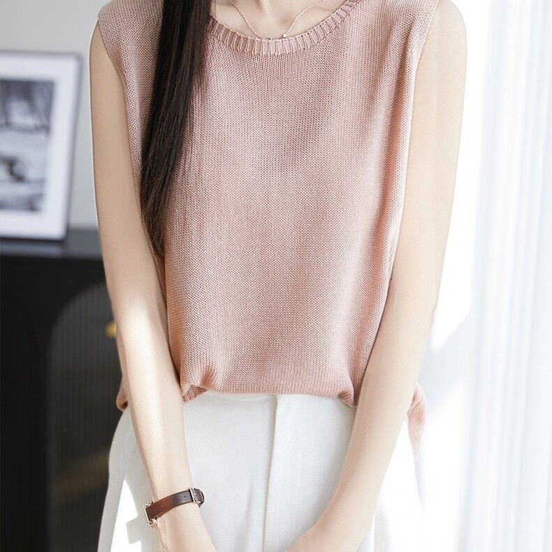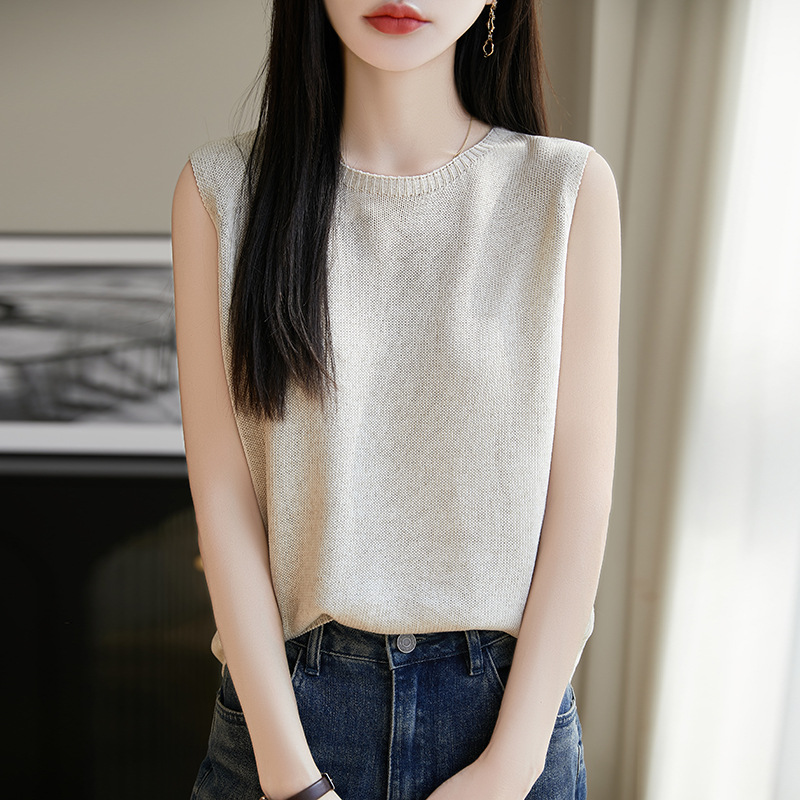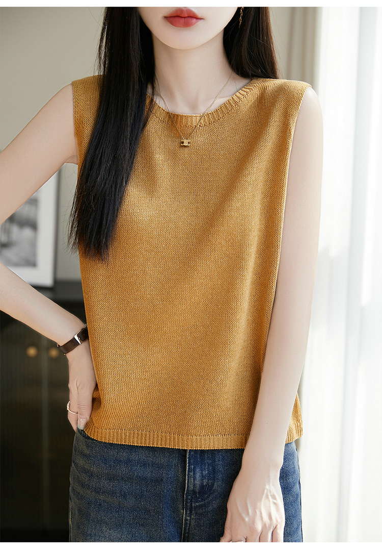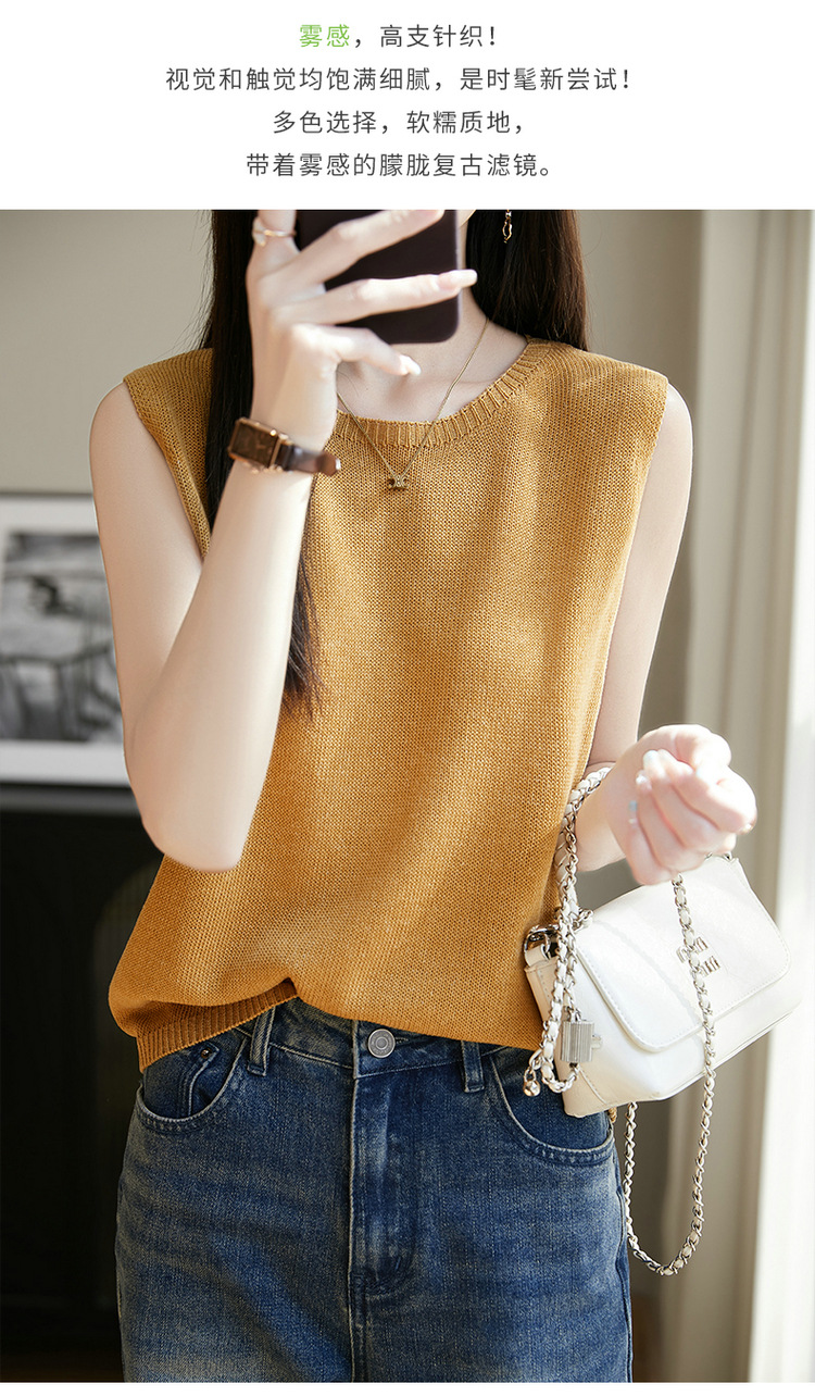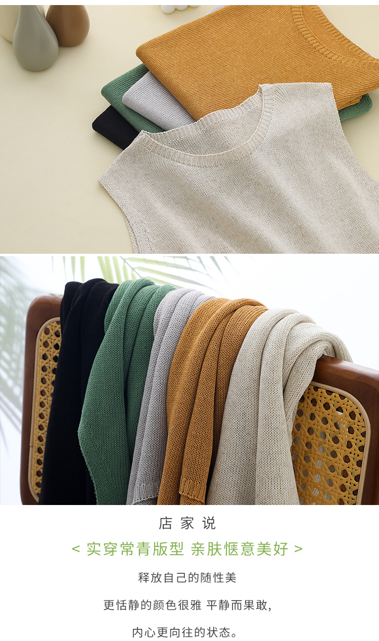 리넨 니트 조끼 뉴 2025 여름 아우터웨어 솔리드 컬러 풀오버 드래핑 크루 넥 여성용 민소매 스웨터스토어 가기