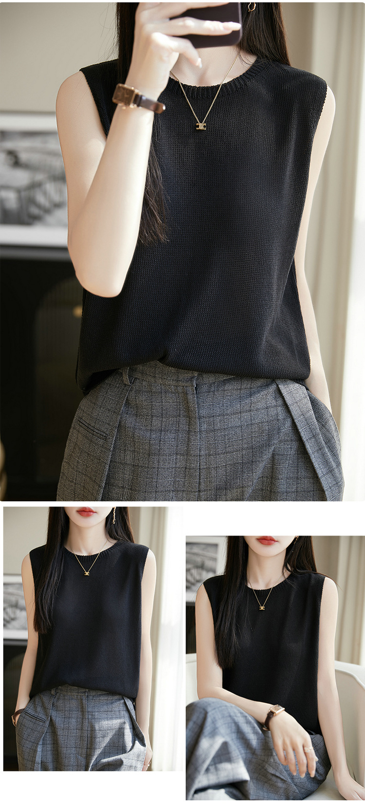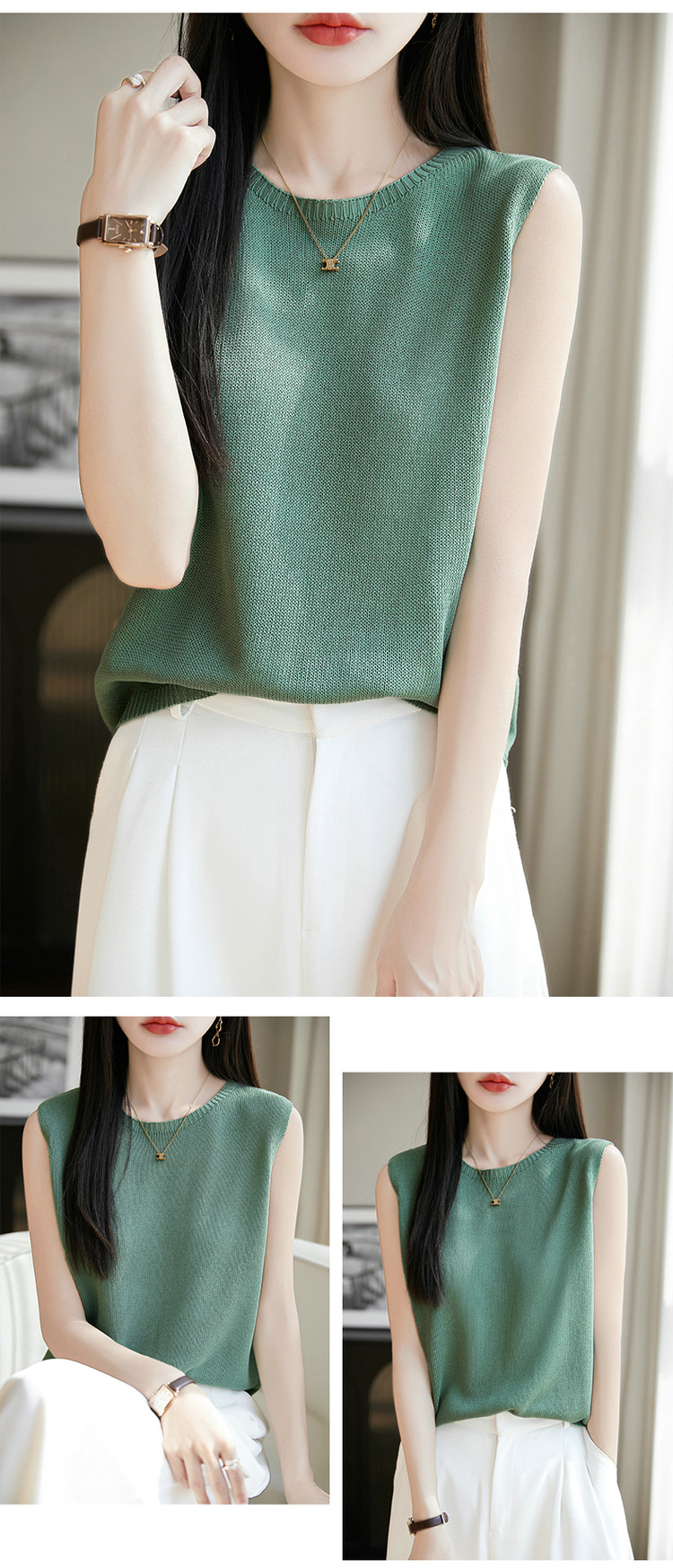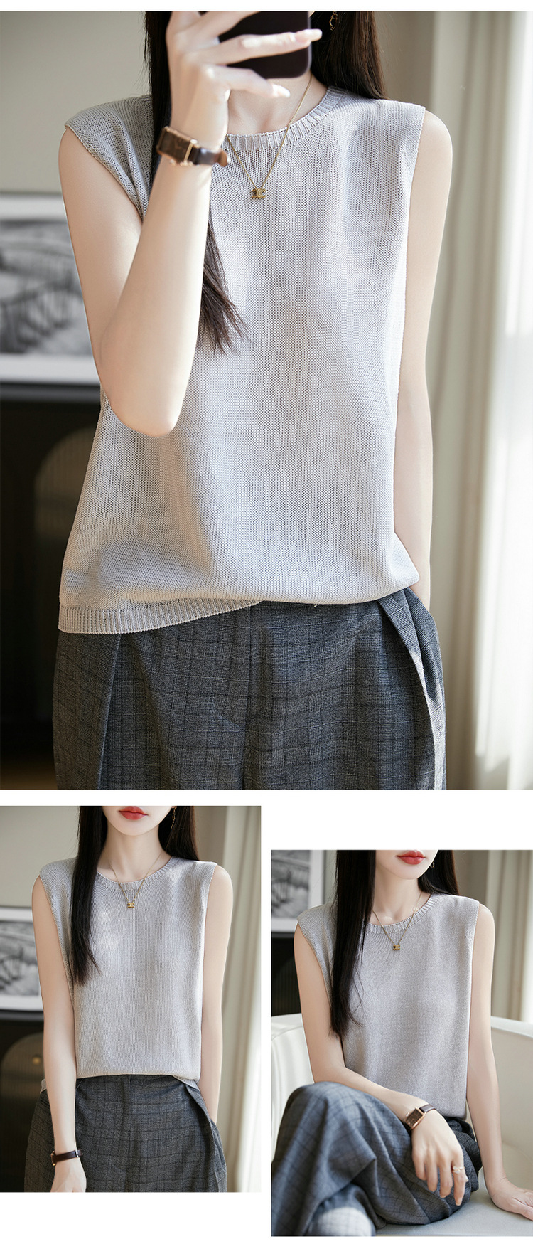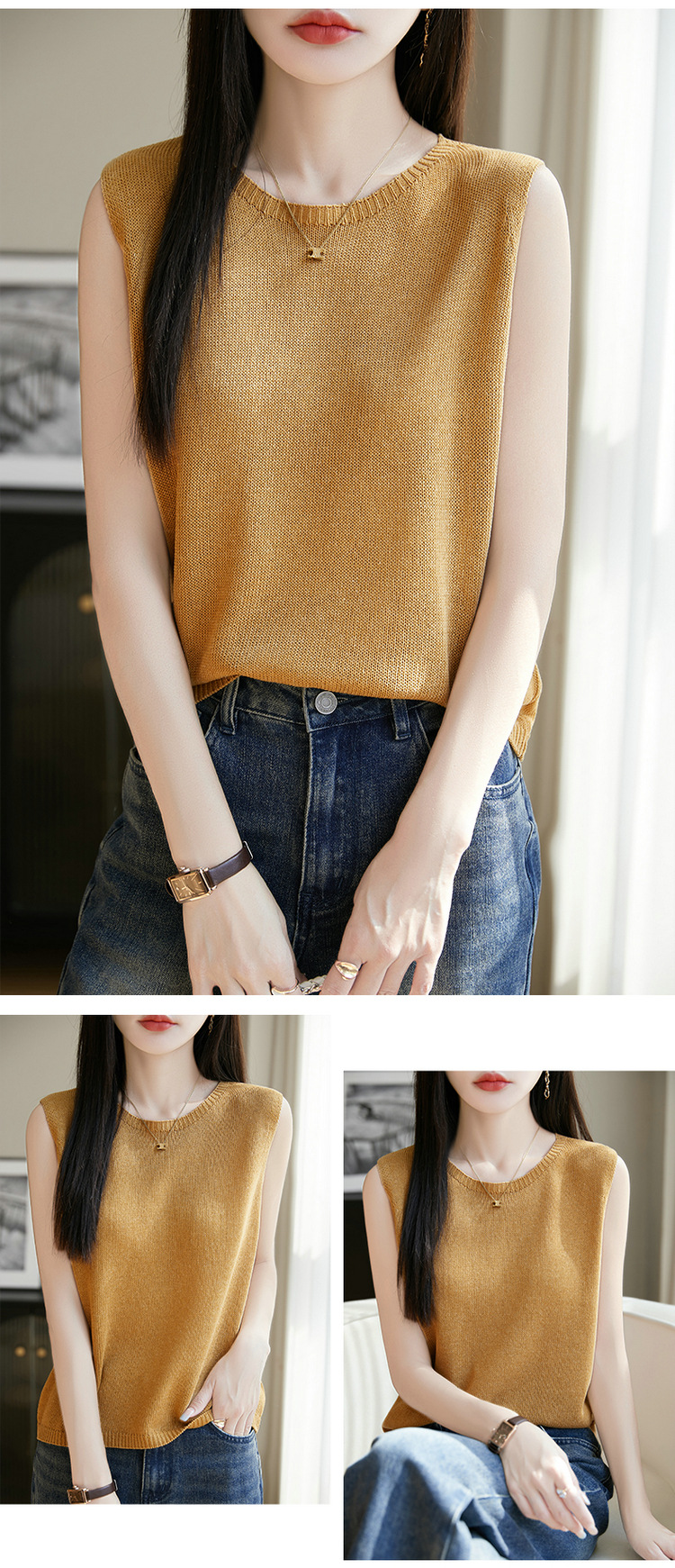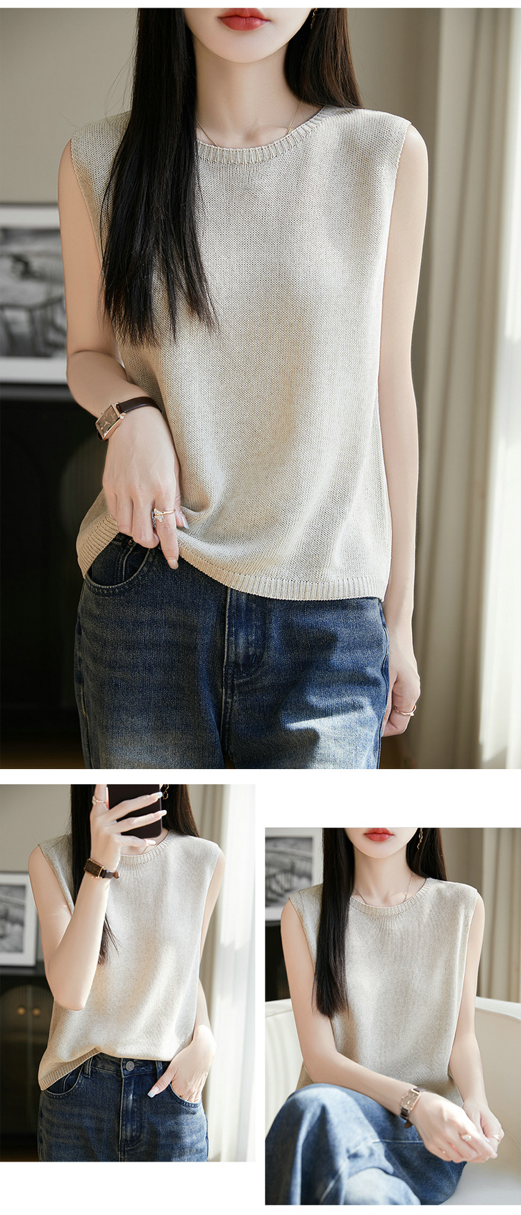 리넨 니트 조끼 뉴 2025 여름 아우터웨어 솔리드 컬러 풀오버 드래핑 크루 넥 여성용 민소매 스웨터스토어 가기