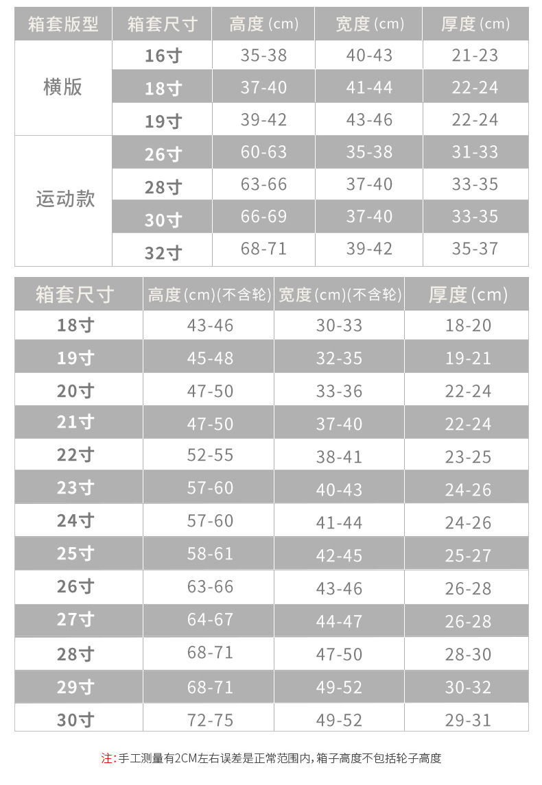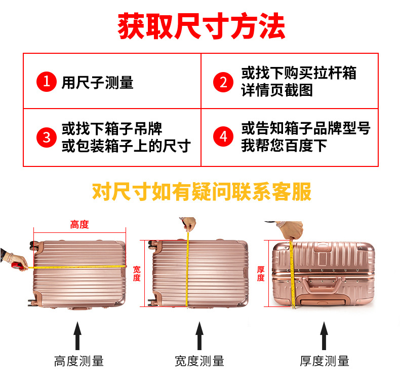 购买本商品前,请核对拉杆箱尺寸及本店的尺寸表。或咨询客服