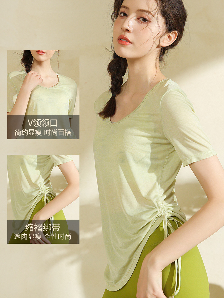 요가 의류 스포츠 반팔 여성 하이 엔드 패션 그린 슬리밍 빠른 건조 통기성 드로스트링 피트니스 탑 여름 얇은