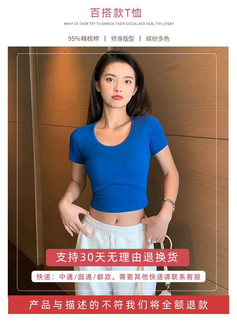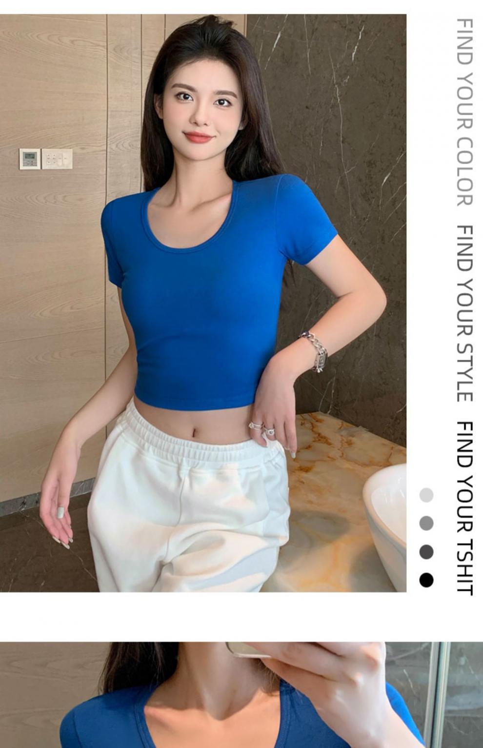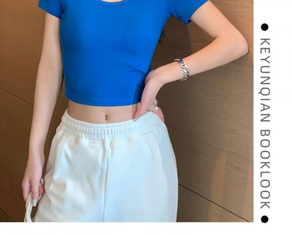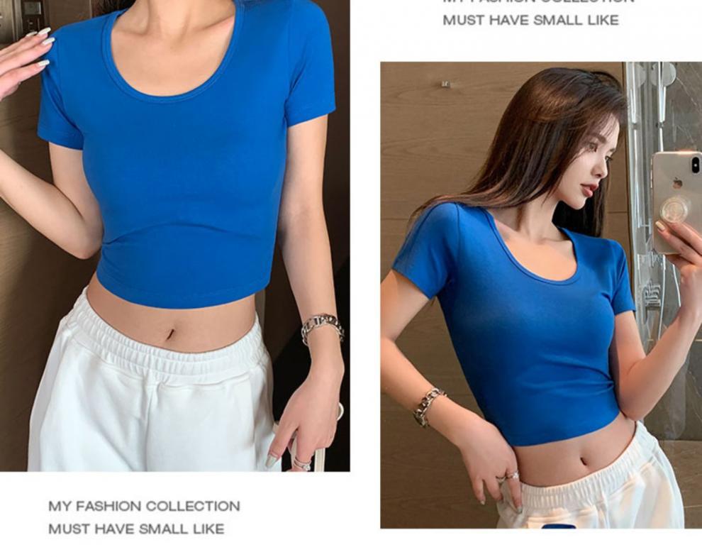 클라인 블루 퓨어 코튼 반팔 티셔츠 여성용 반바지 크롭 탑 봄 여름 배꼽 노출 슬림핏 이너 티셔츠 트렌디스토어 가기