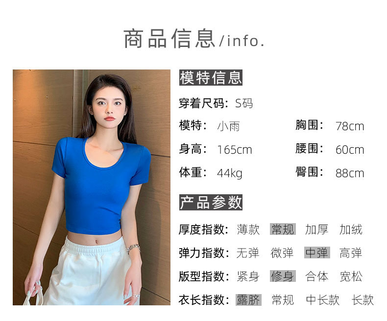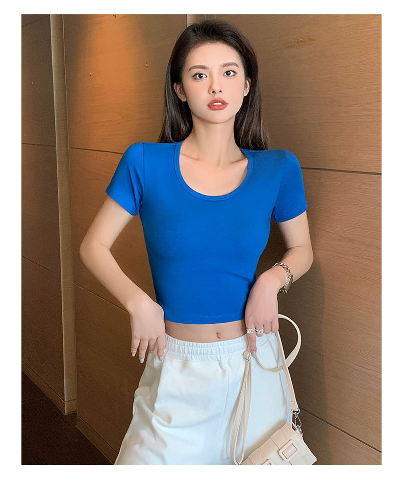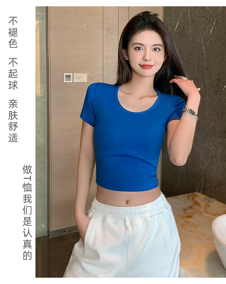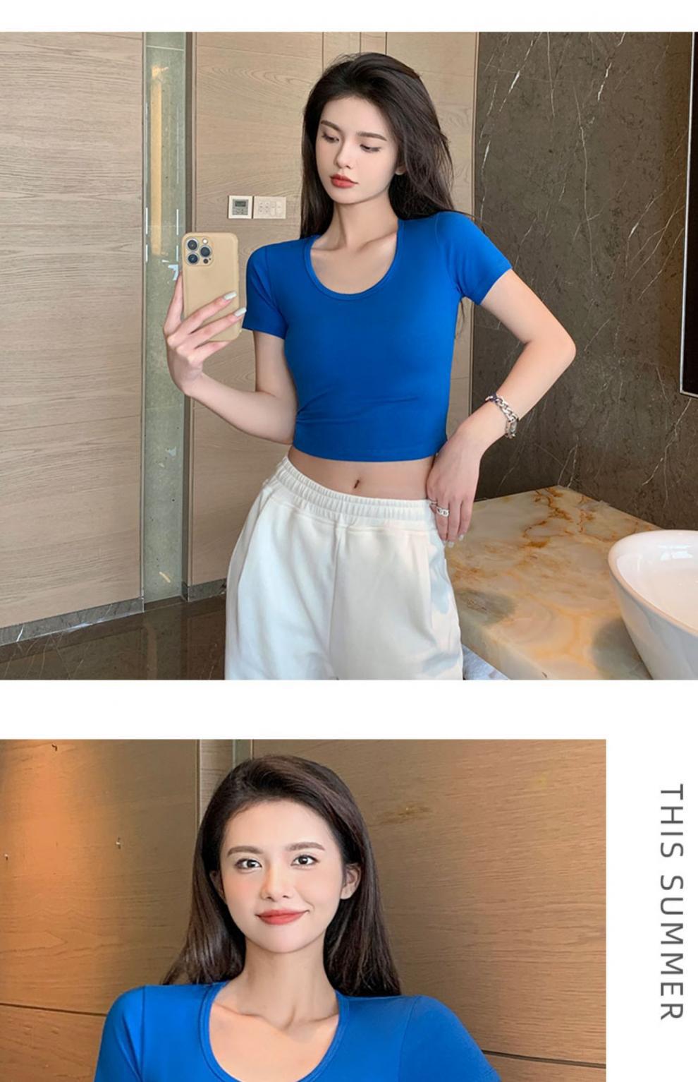 클라인 블루 퓨어 코튼 반팔 티셔츠 여성용 반바지 크롭 탑 봄 여름 배꼽 노출 슬림핏 이너 티셔츠 트렌디스토어 가기