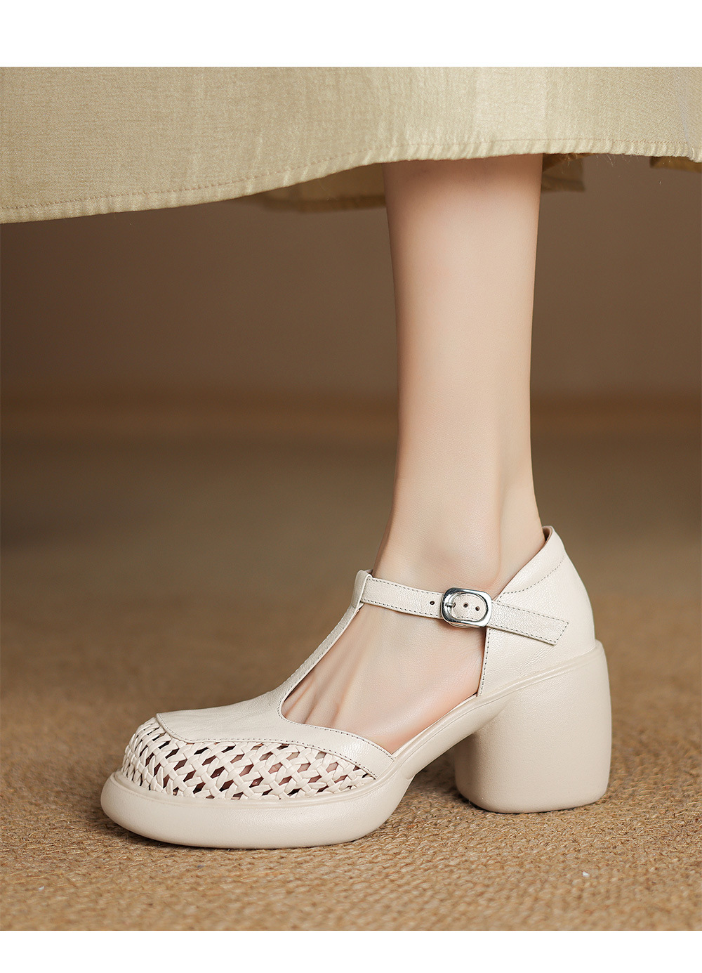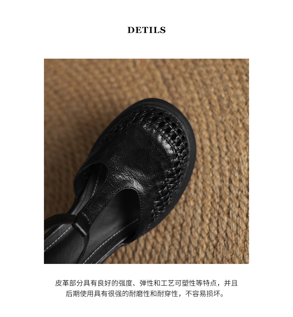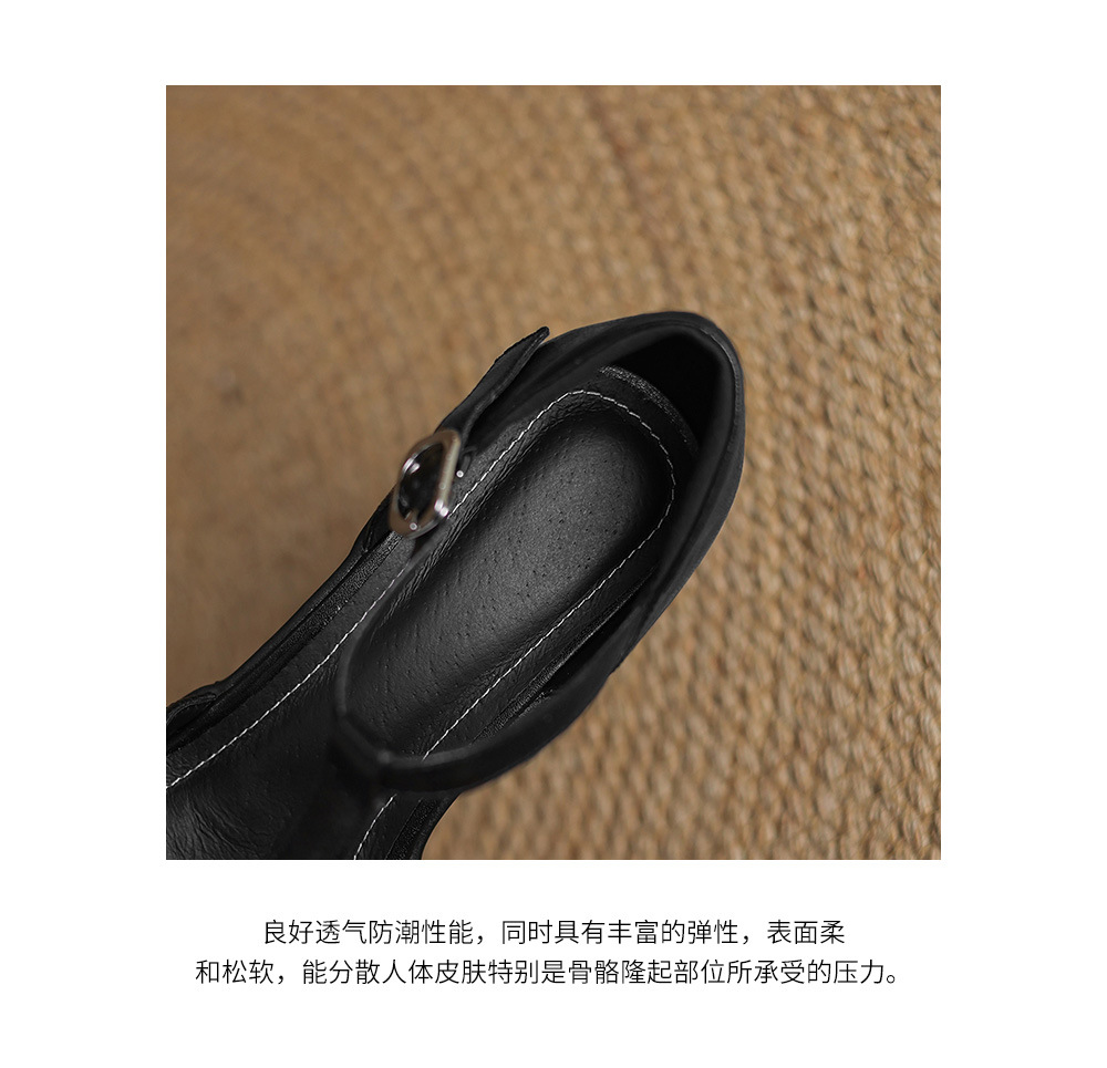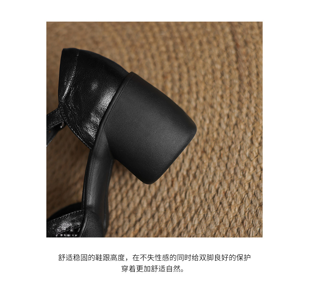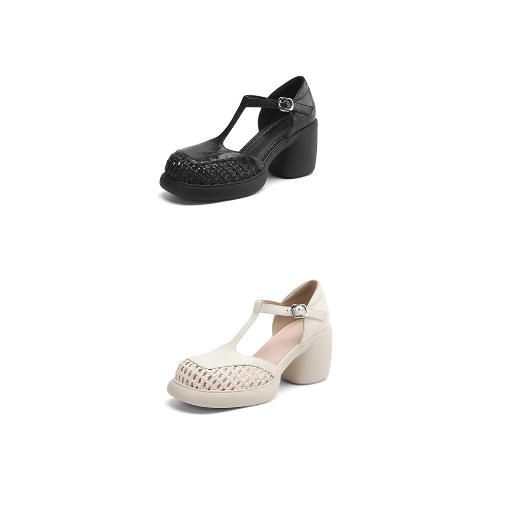 정품 가죽 하이힐 할로우 오픈 발가락 샌들 2025 여름 새 라운드 발가락 두꺼운 바닥 두꺼운 힐 T 스트랩 하이힐스토어 가기