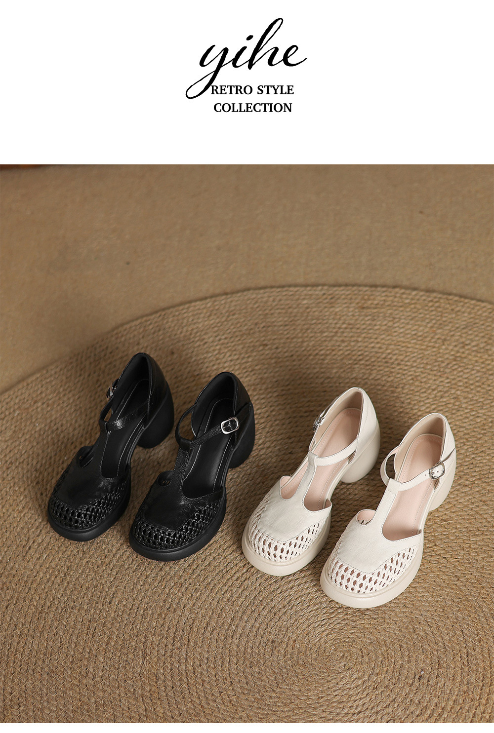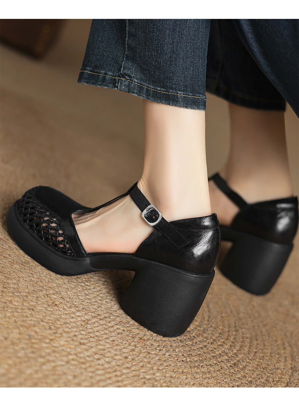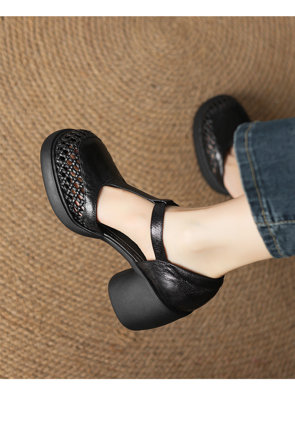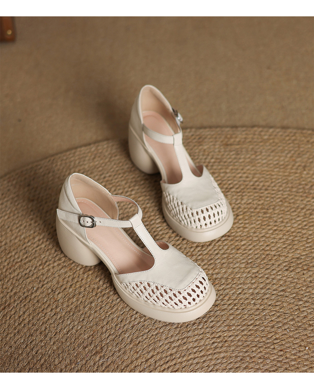 정품 가죽 하이힐 할로우 오픈 발가락 샌들 2025 여름 새 라운드 발가락 두꺼운 바닥 두꺼운 힐 T 스트랩 하이힐스토어 가기