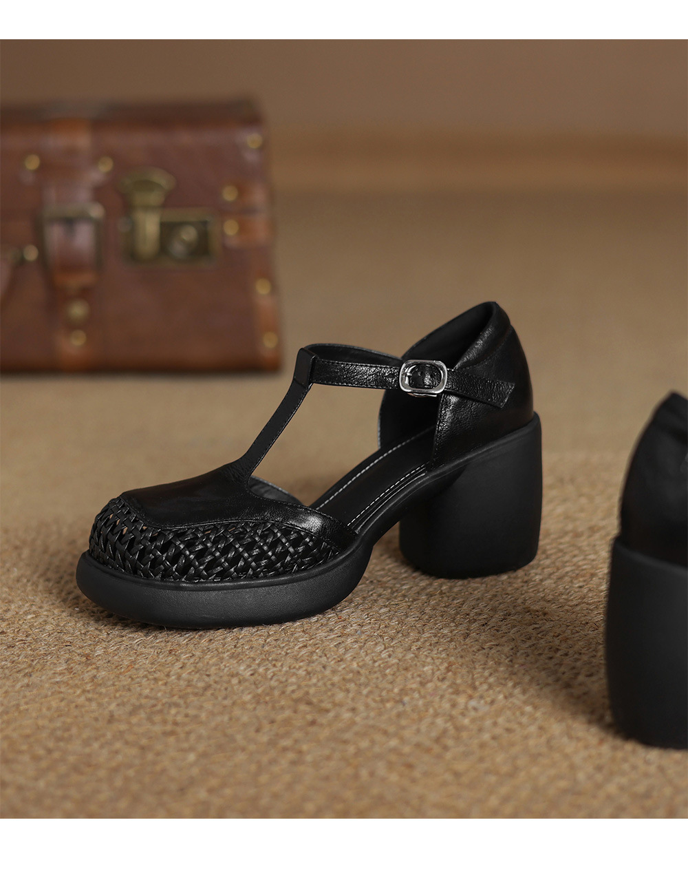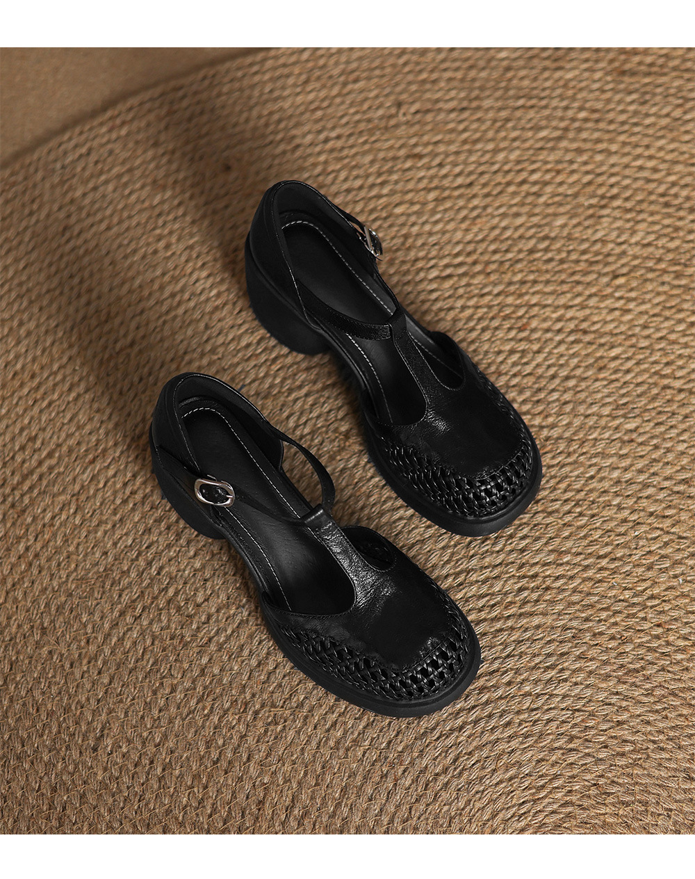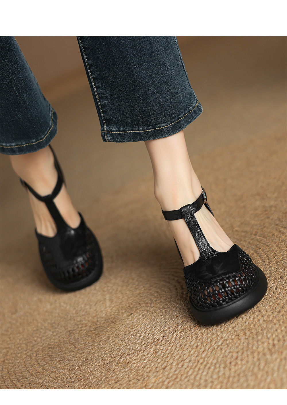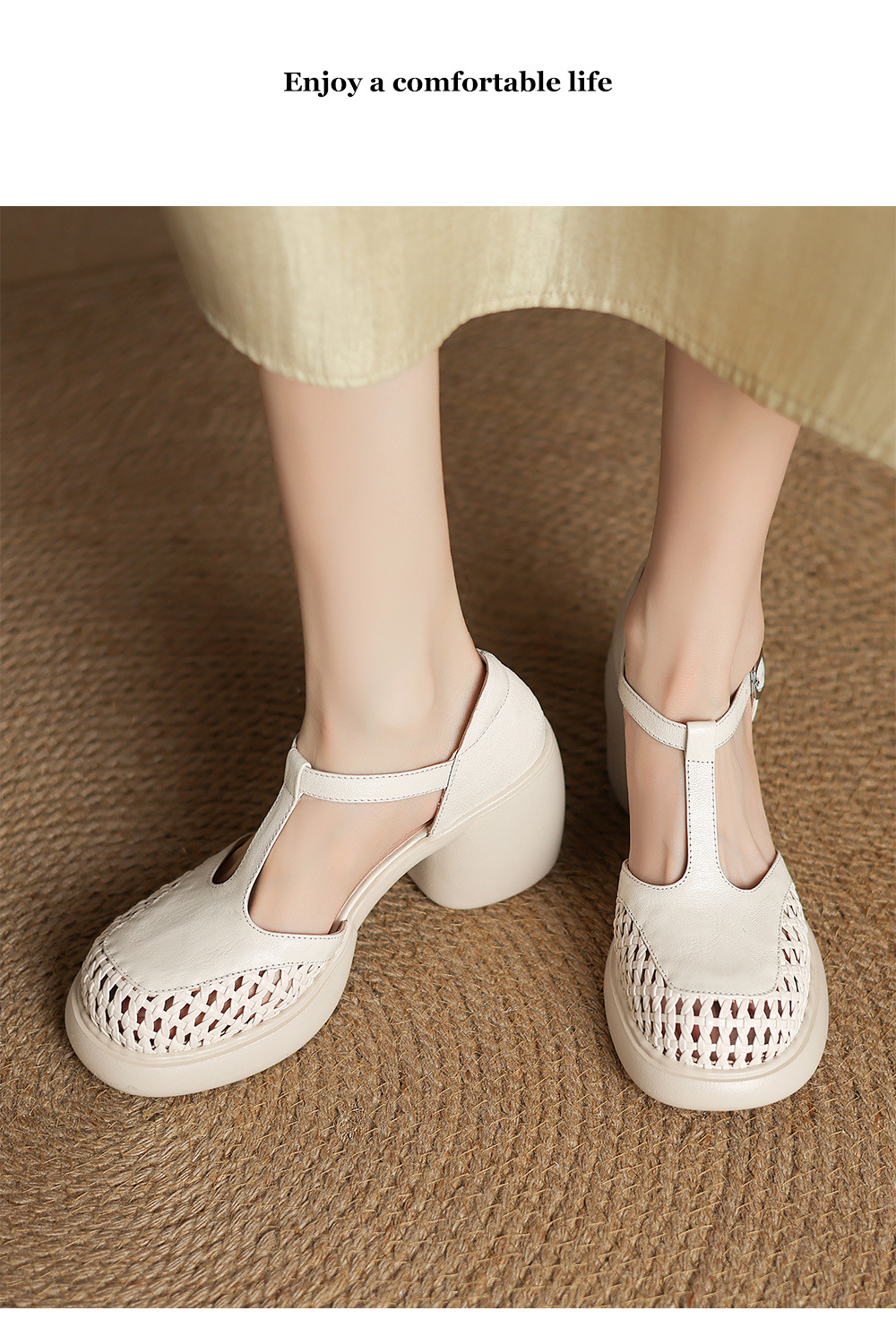 정품 가죽 하이힐 할로우 오픈 발가락 샌들 2025 여름 새 라운드 발가락 두꺼운 바닥 두꺼운 힐 T 스트랩 하이힐스토어 가기