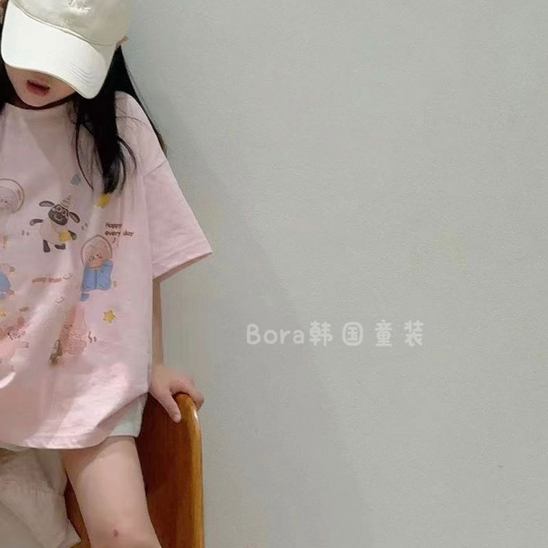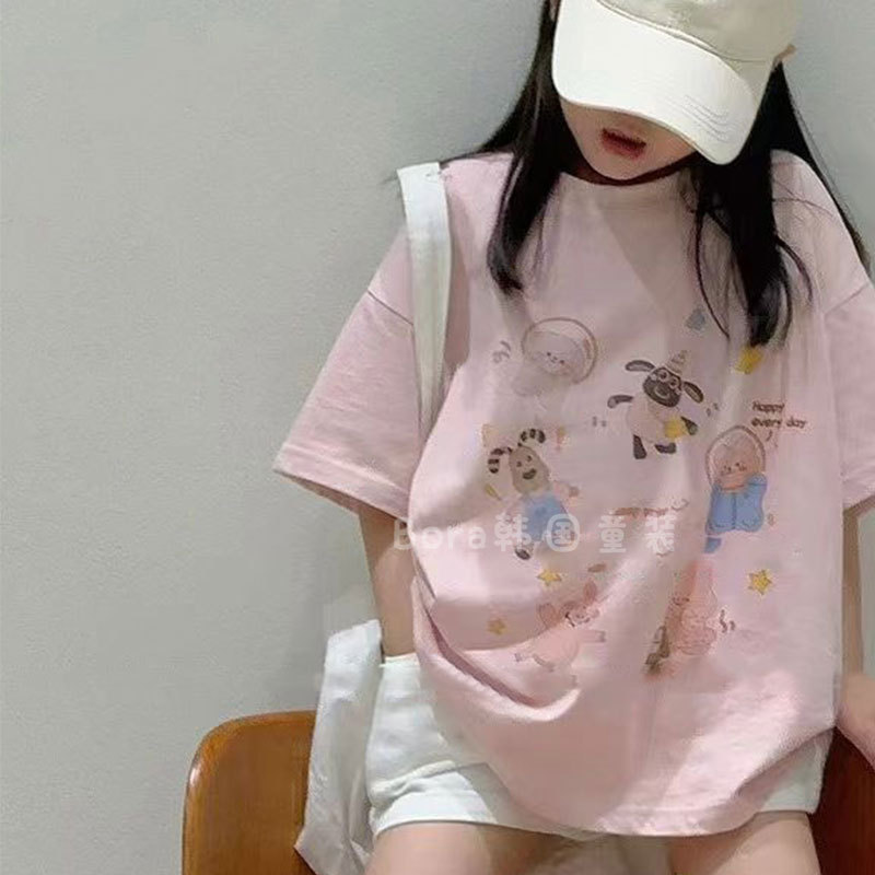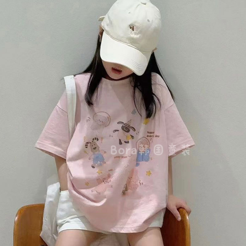 소녀 반팔 티셔츠 어린이 최고 봄과 여름 2025 새로운 큰 아동베이스 셔츠 소녀 핑크 느슨한 옷 1스토어 가기