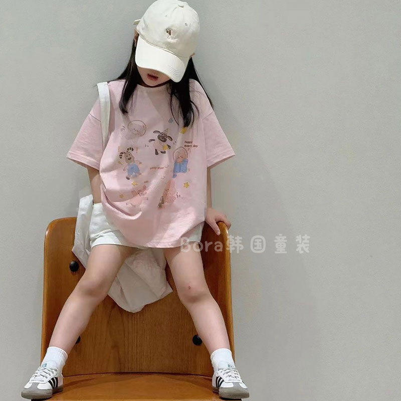 여아 반팔 티셔츠 아동상의 봄 여름 2025 새로운 큰 아동용 셔츠 여아 핑크색 느슨한 옷 1스토어 가기