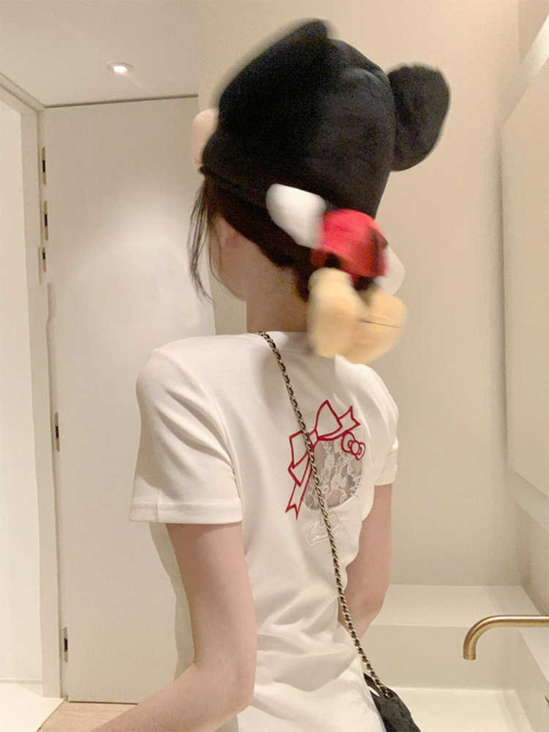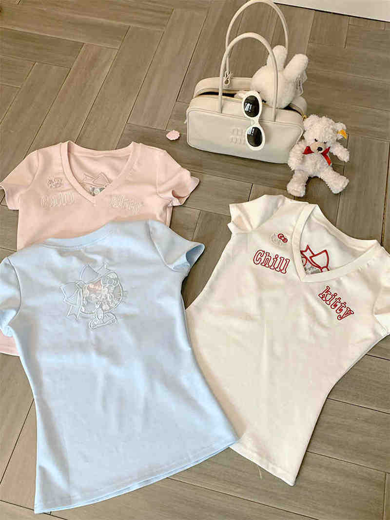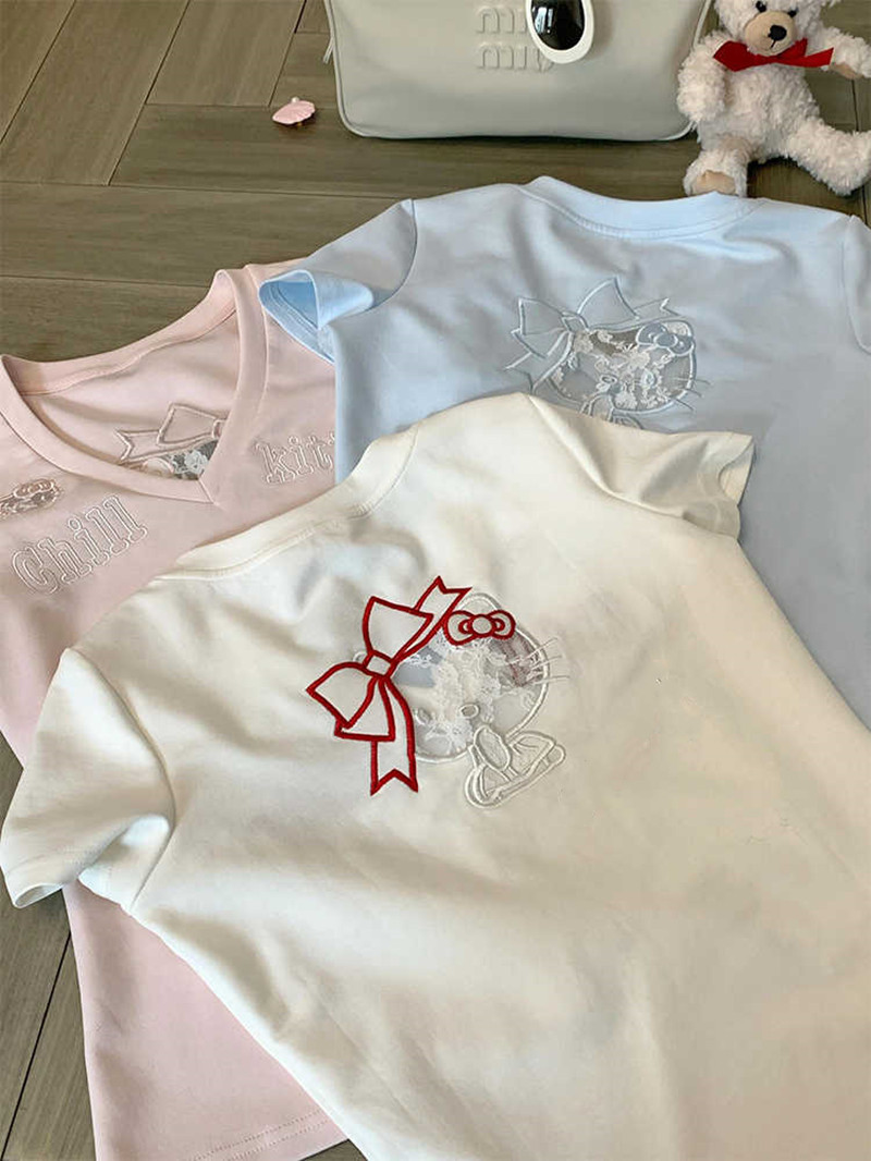 아메리칸 스타일 레트로 할로우 레이스 키티 반팔 티셔츠 여성용 여름 슬림핏 슬리밍 V 넥 스파이스 소녀 쇼트 탑 옷