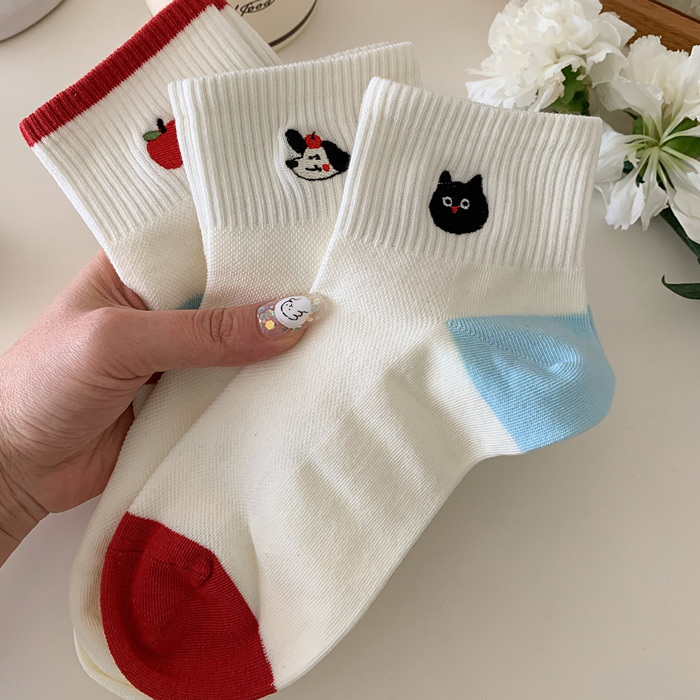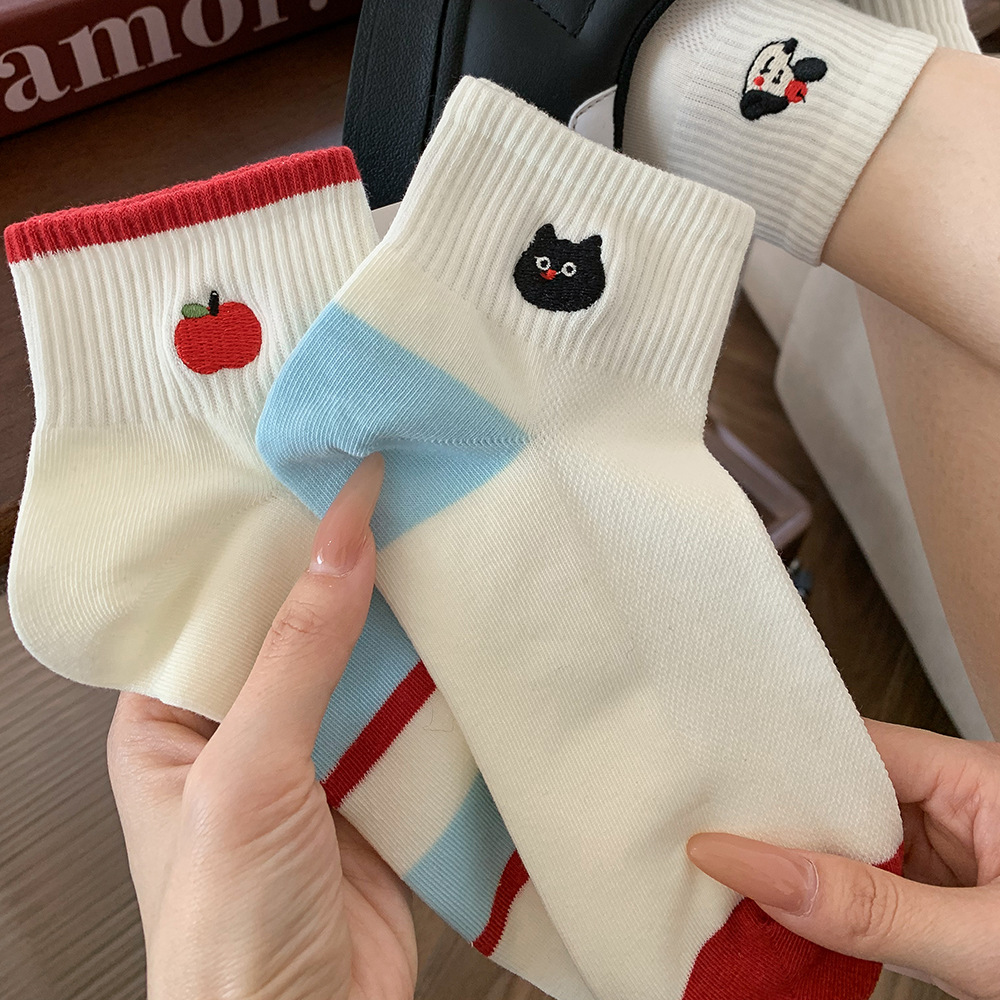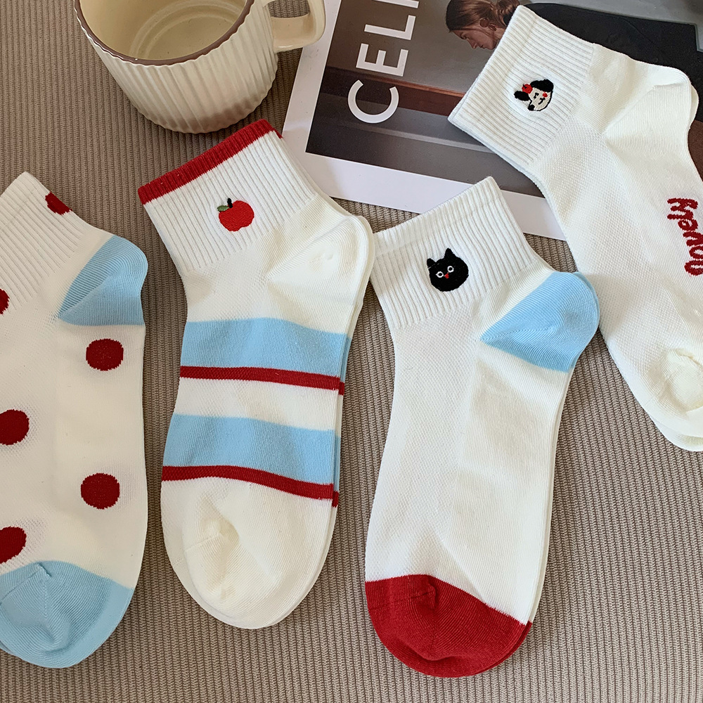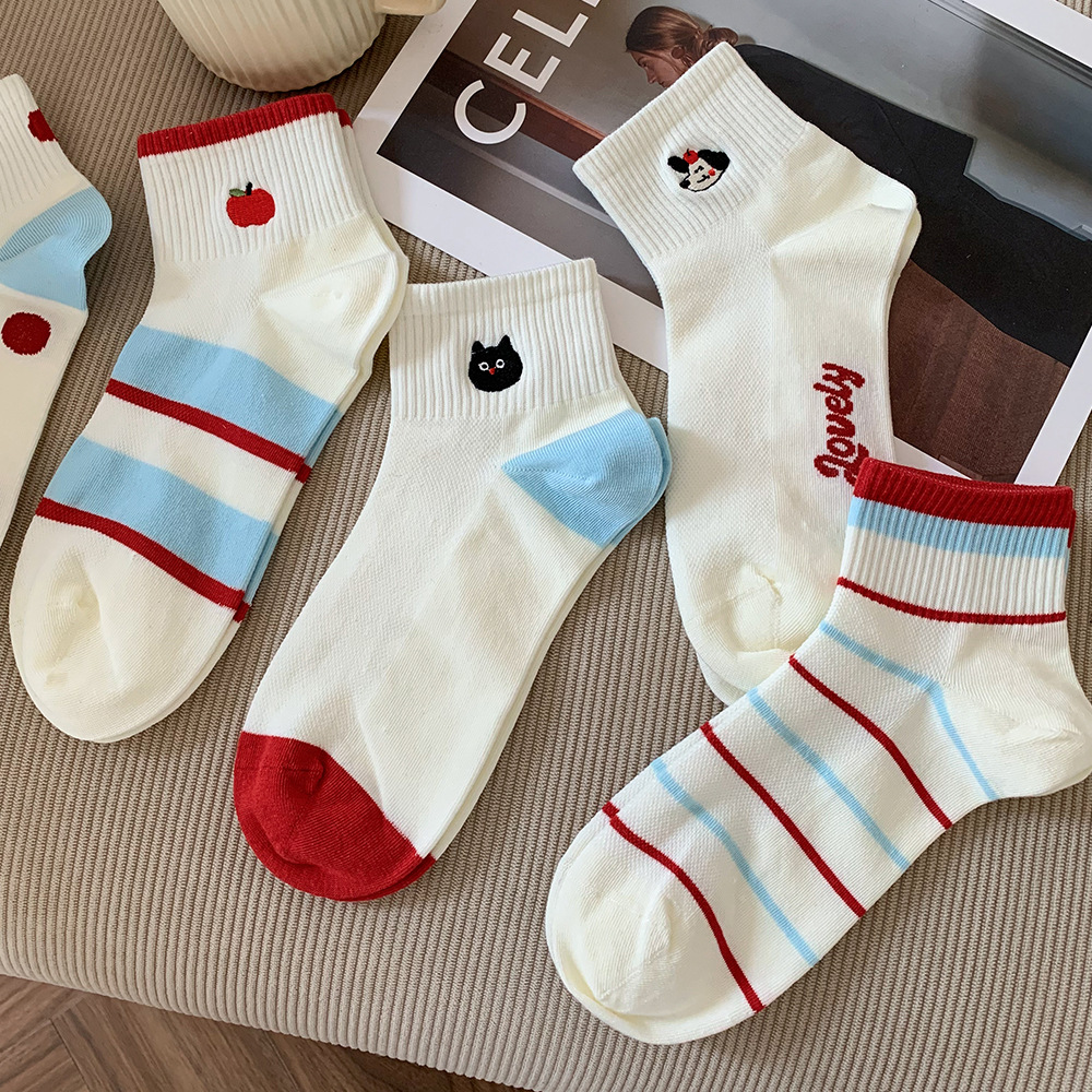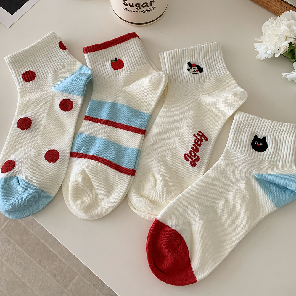 양말 여성 짧은 튜브 여름 얇은 만화 귀여운 자수 여성 봄과 여름 일본 스타일 흰색 소녀 줄무늬 웨이브 도트 중형 튜브스토어 가기