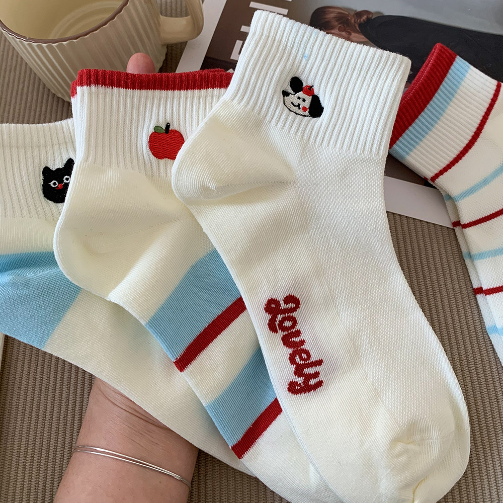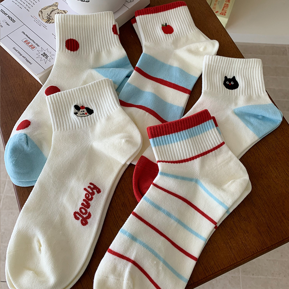 양말 여성 짧은 튜브 여름 얇은 만화 귀여운 자수 여성 봄과 여름 일본 스타일 흰색 소녀 줄무늬 웨이브 도트 중형 튜브