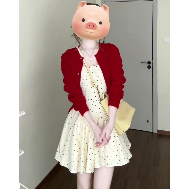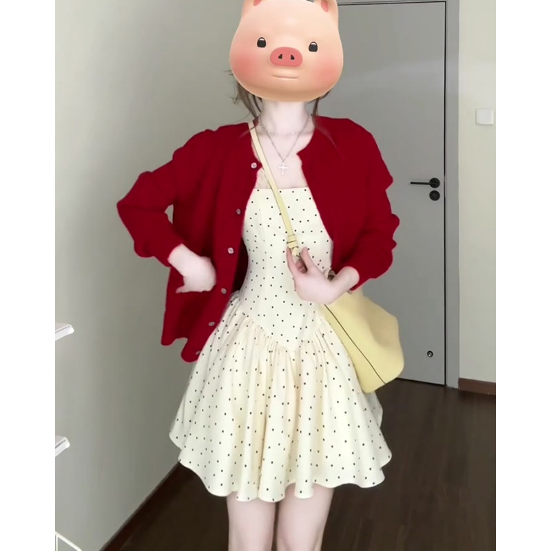 한국 스타일 부드러운 우아한 빨간 니트 카디건 재킷 폴카 스퀘어 칼라 슬링 원피스 여성의 봄과 여름 새 세트