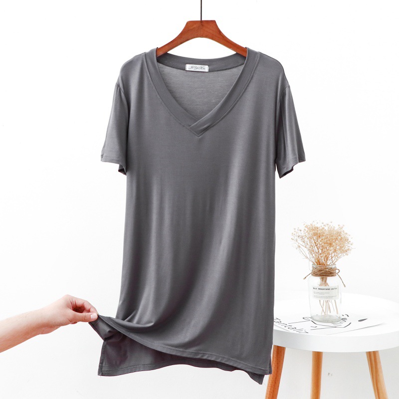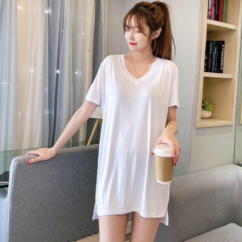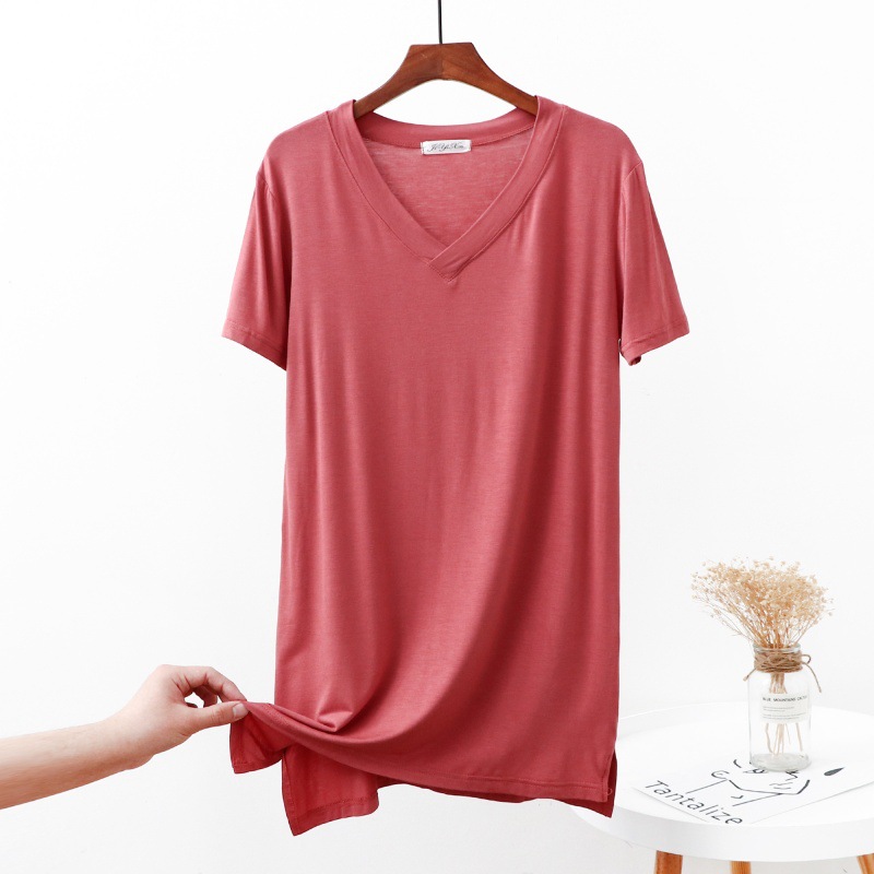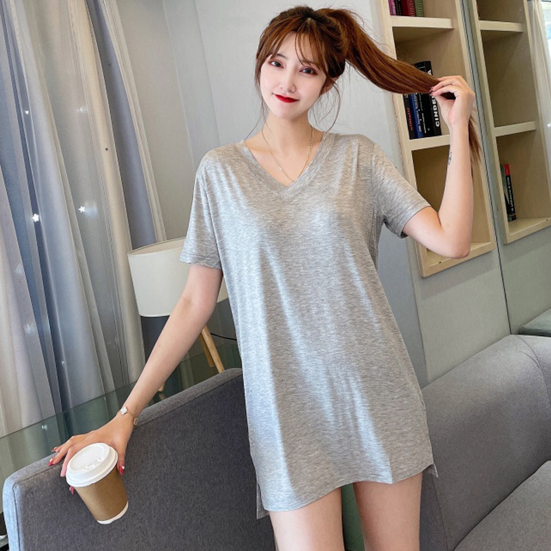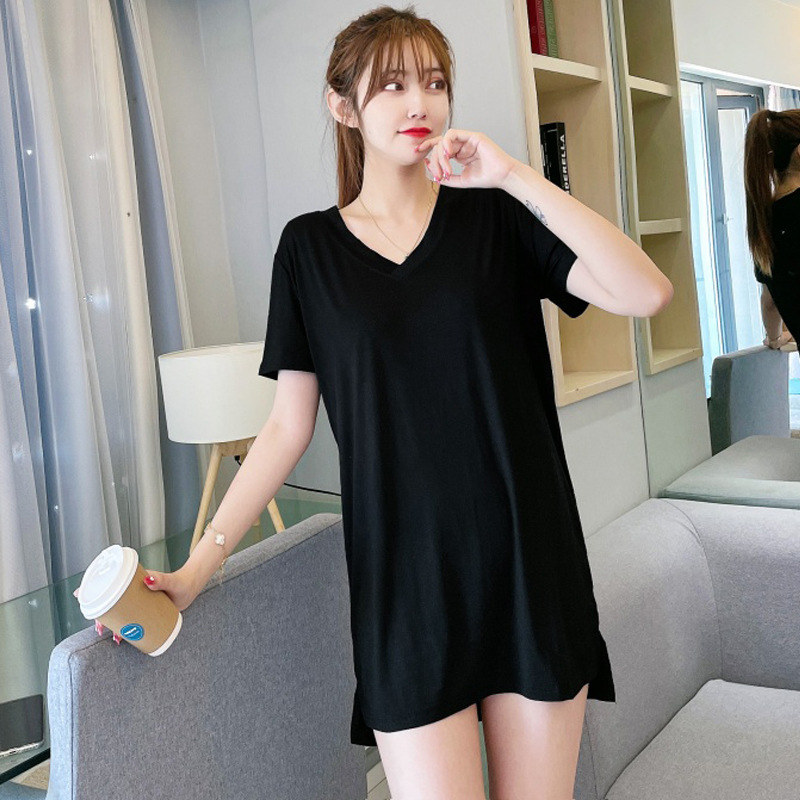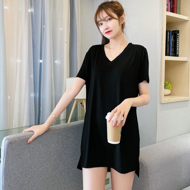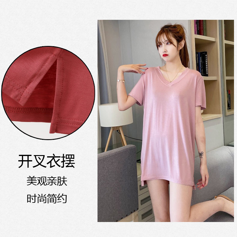 모달 반팔 티셔츠 여성 여름 외국인 우아한 V-넥 탑 중장베이스 느슨한 분할 엉덩이 티셔츠 스커트스토어 가기