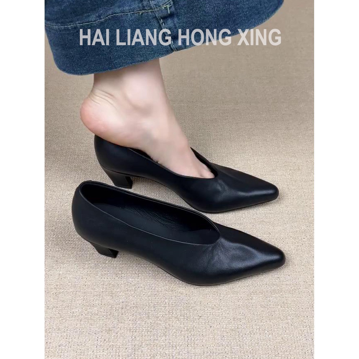 여성용 양가죽 프렌치 포인티드 토 슈즈, 깔끔한 디자인, 활용도 높은 통근용 신발, 레트로 블랙 두꺼운 굽 하이힐스토어 가기