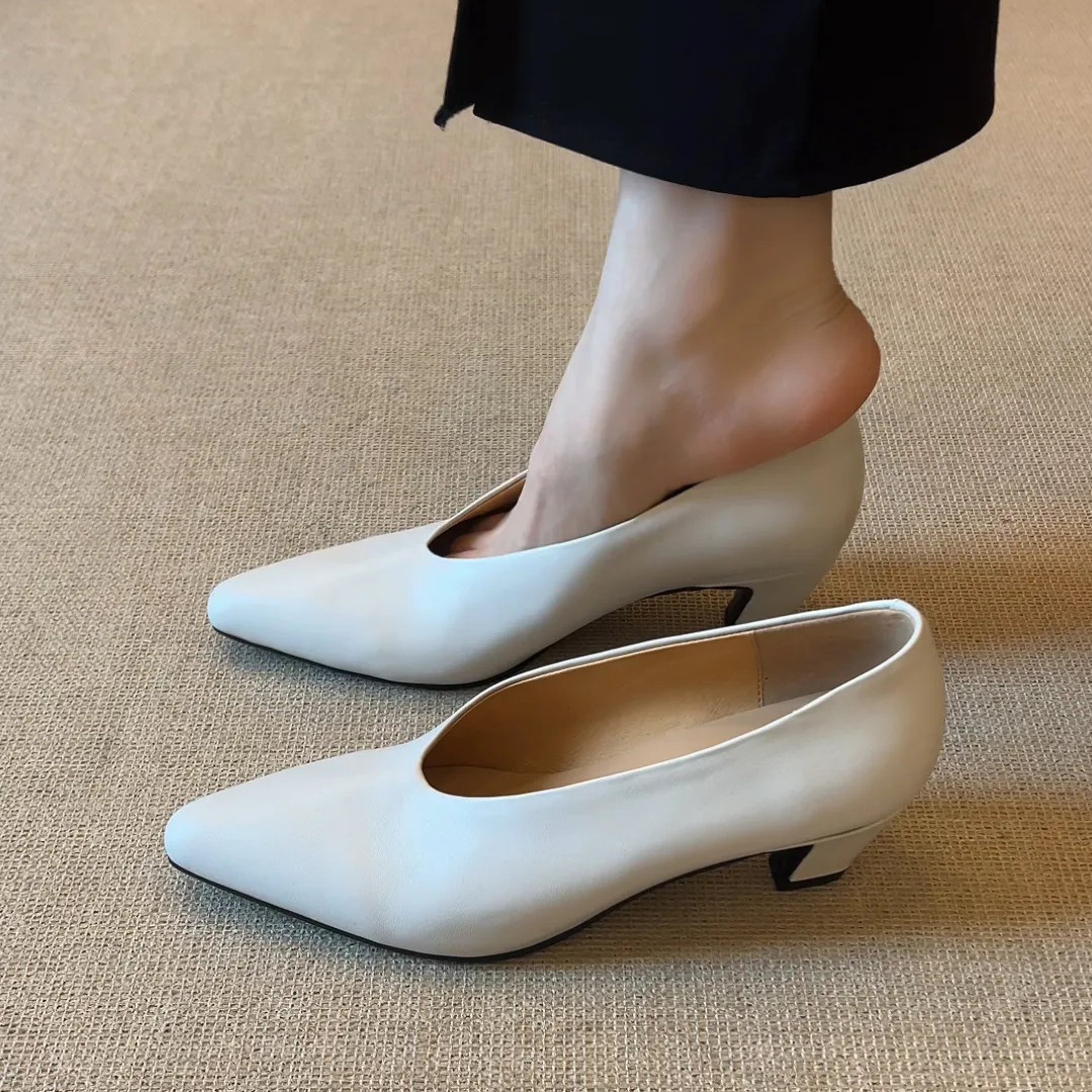 여성용 양가죽 프렌치 포인티드 토 슈즈, 깔끔한 디자인, 활용도 높은 통근용 신발, 레트로 블랙 두꺼운 굽 하이힐