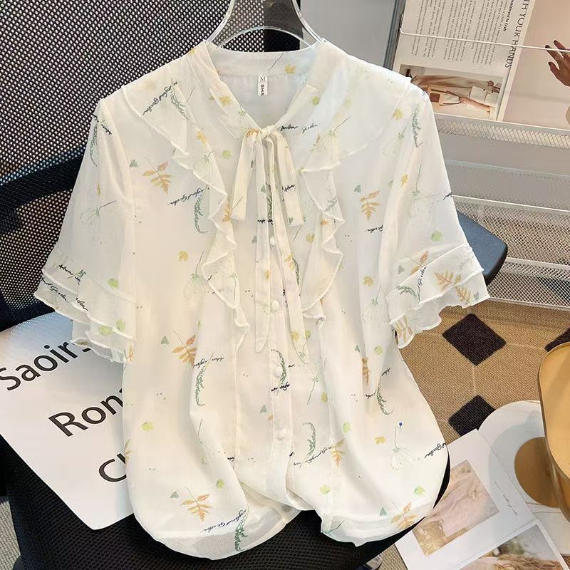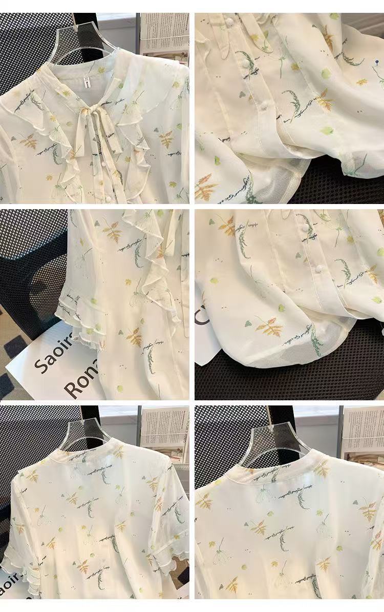 여름 프랑스 새 스타일 달콤하고 신선한 V 넥 스타일 꽃 반팔 셔츠 여성용 느슨한 슬리밍 쉬폰 탑