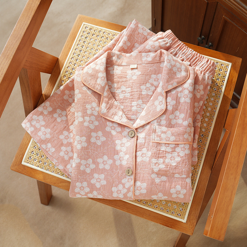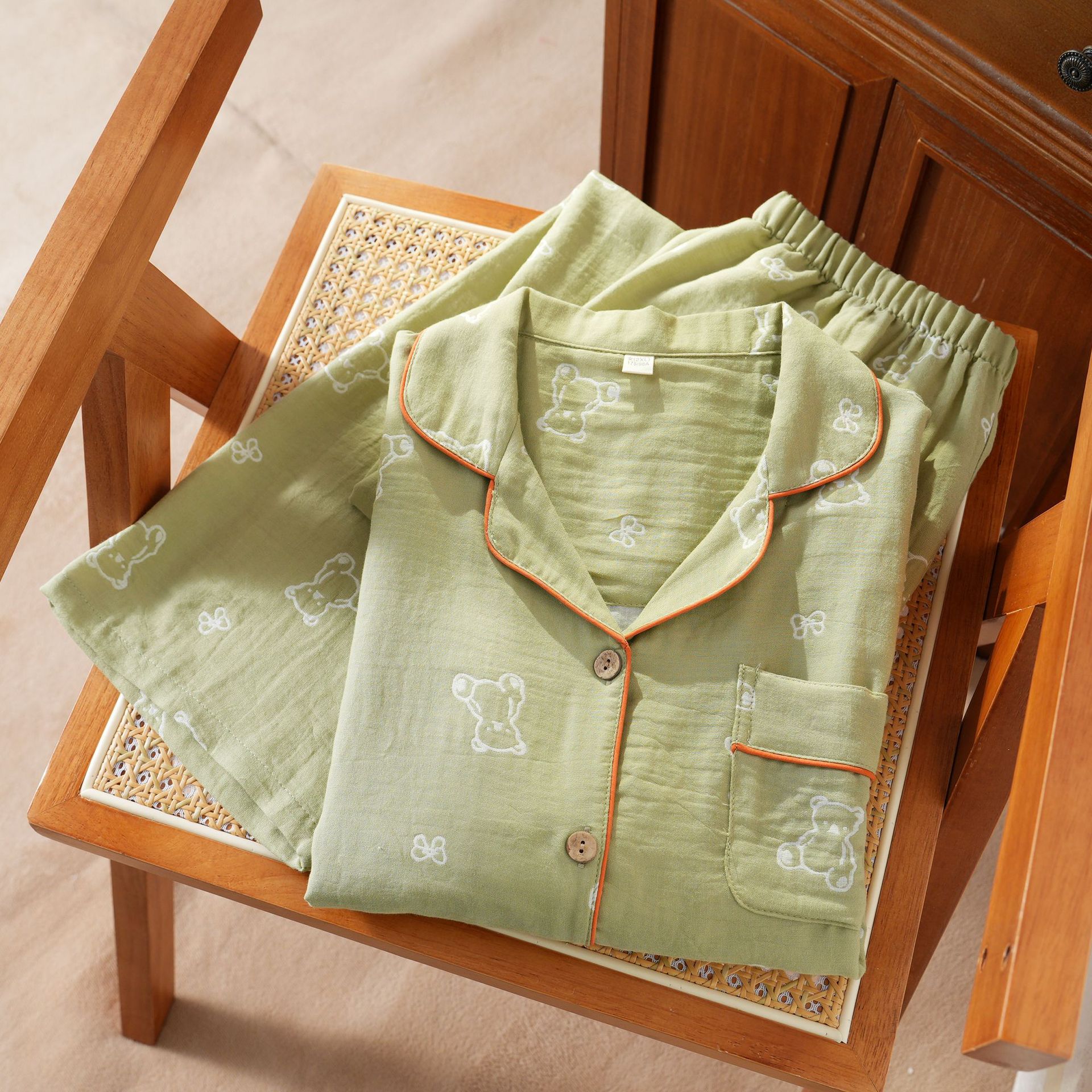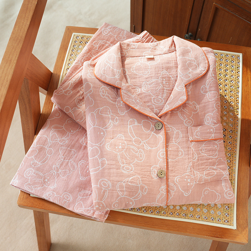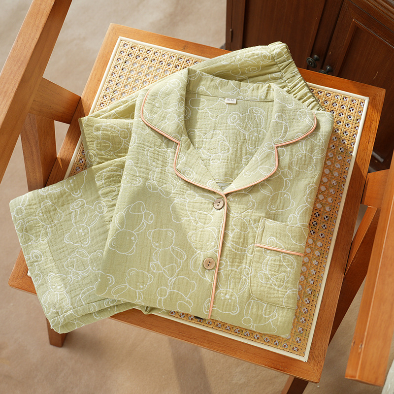 면 대형 자카드 더블 레이어 원사 여성용 홈 의류 파자마 긴팔 바지 세트 사계절 원사 염색 턴 오버 칼라스토어 가기
