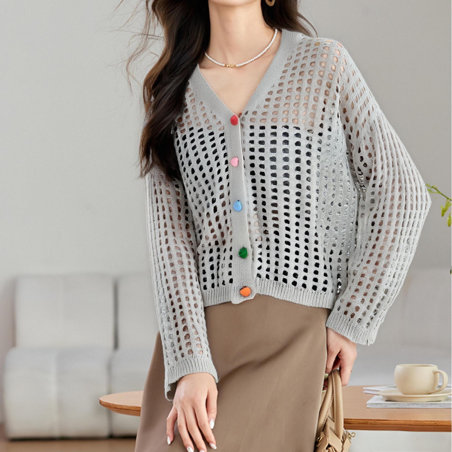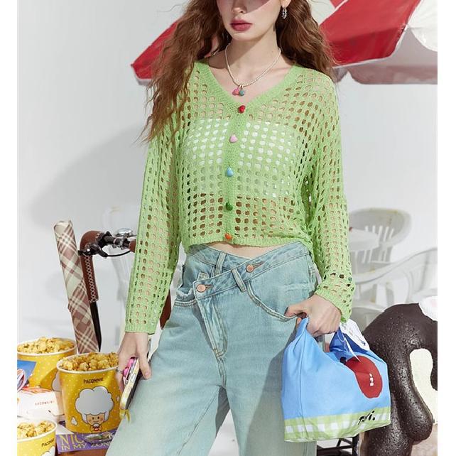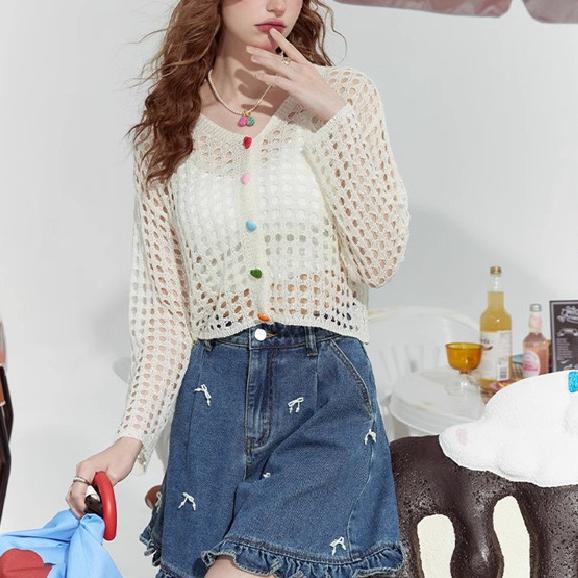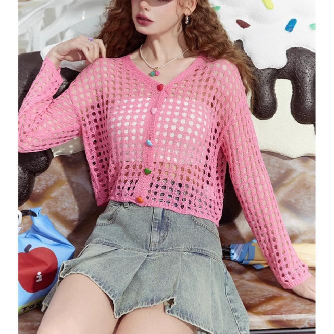 V 넥 중공 짧은 긴팔 니트 카디건 여성 초가을 새로운 컬러 러브 버튼 자외선 차단제 긴팔 탑