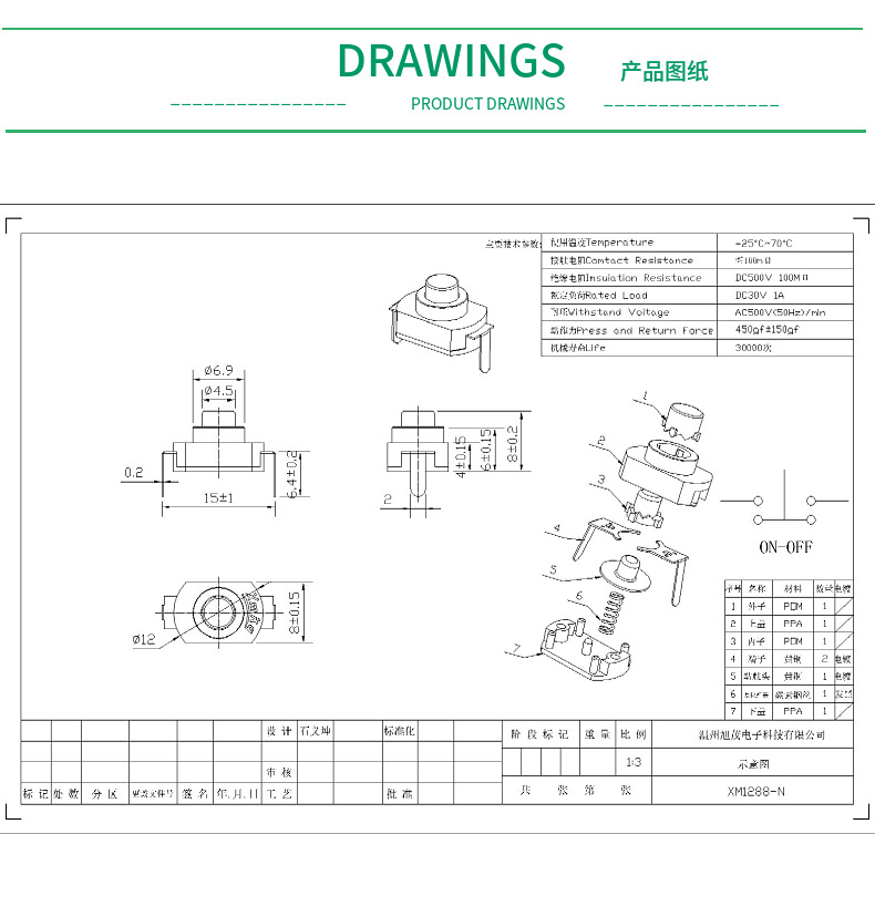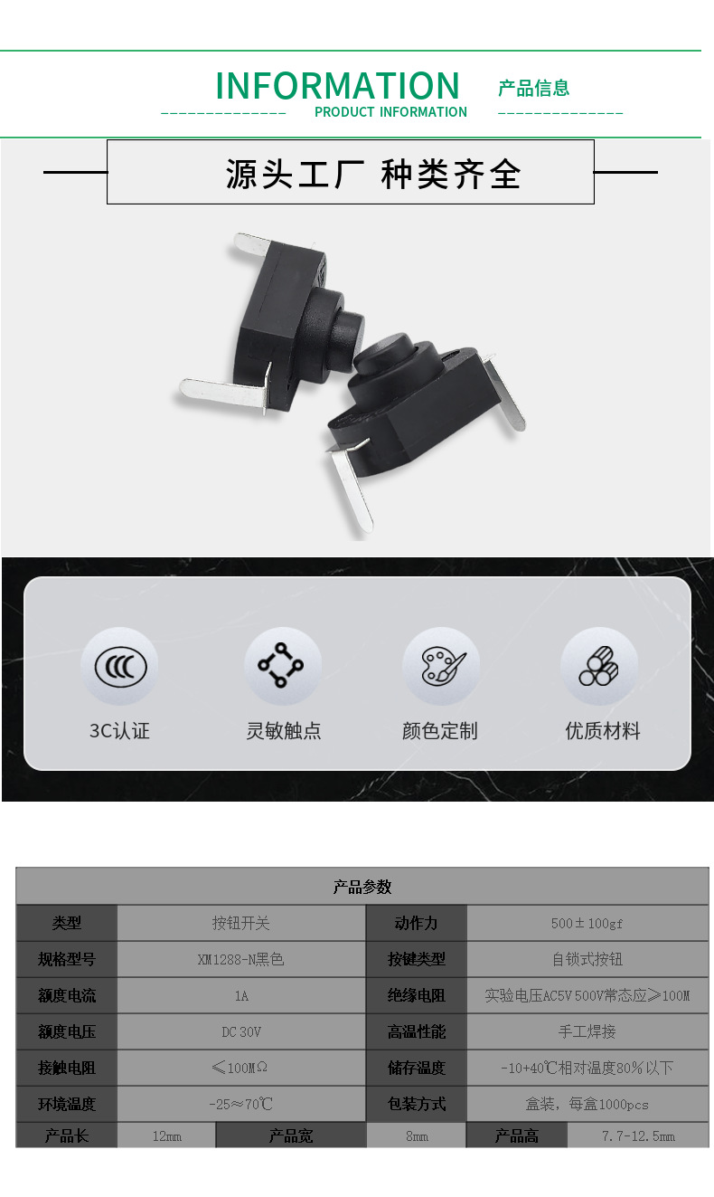 고온 방지 XM1208YD1288BM 소형 LED 손전등 스위치 2피트 자동 잠금 스위치 칫솔 스위치