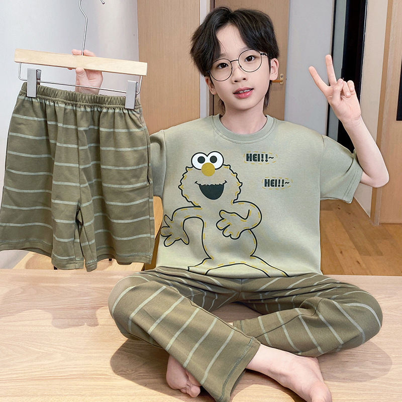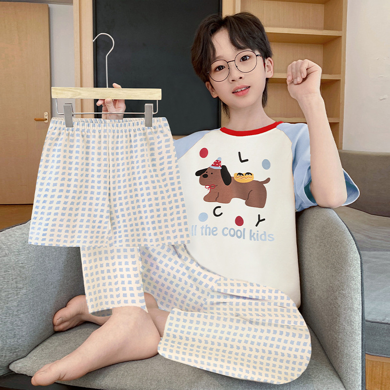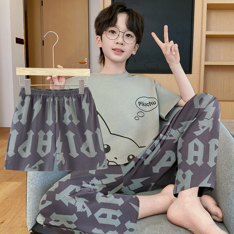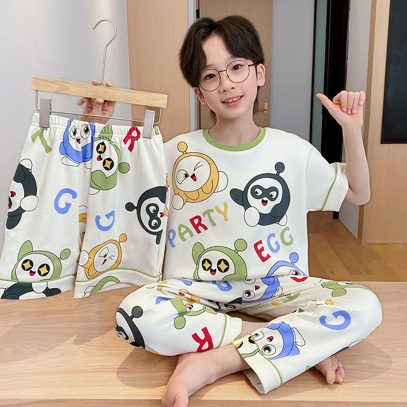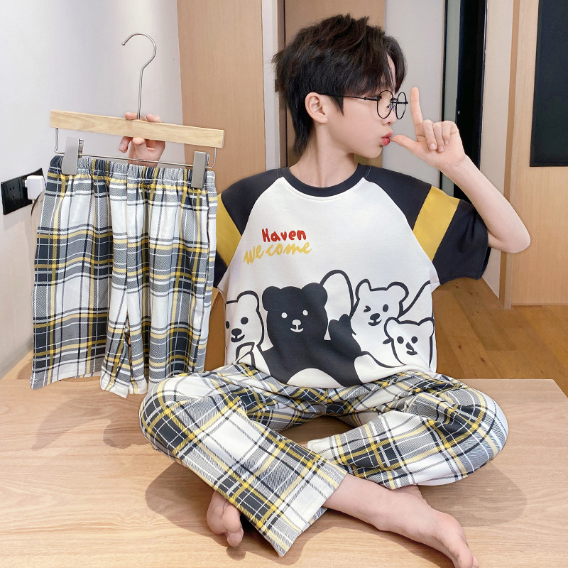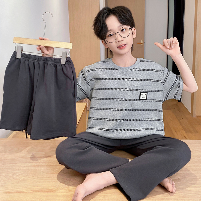 어린이 잠옷 소년 2025 새로운 여름 순수 코튼 소년 3 피스 세트 반팔 바지 큰 어린이 가정 의류 여름 스타일스토어 가기