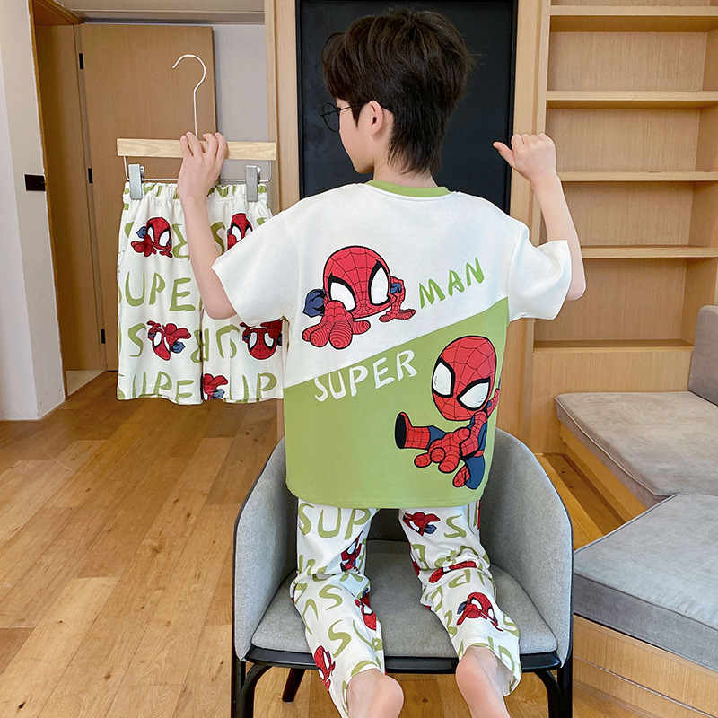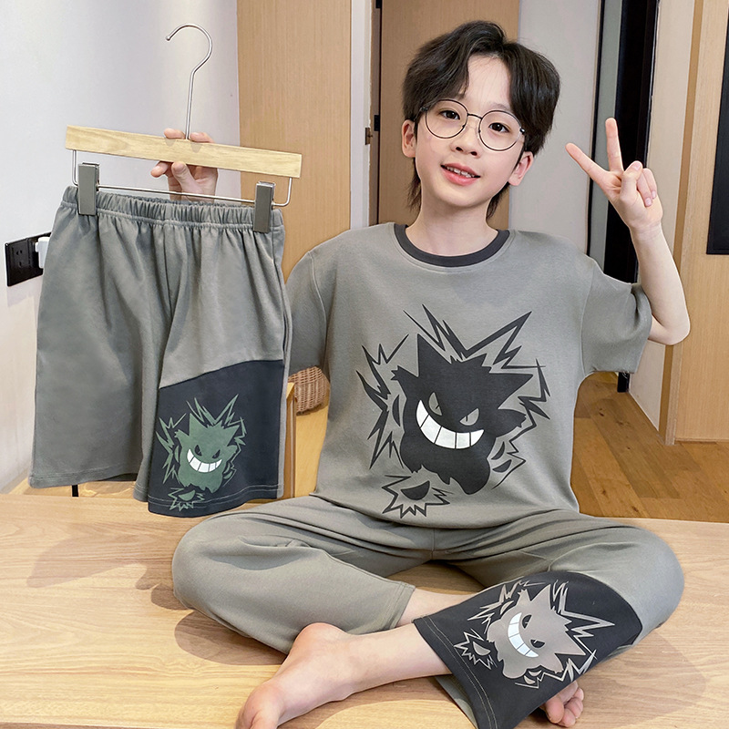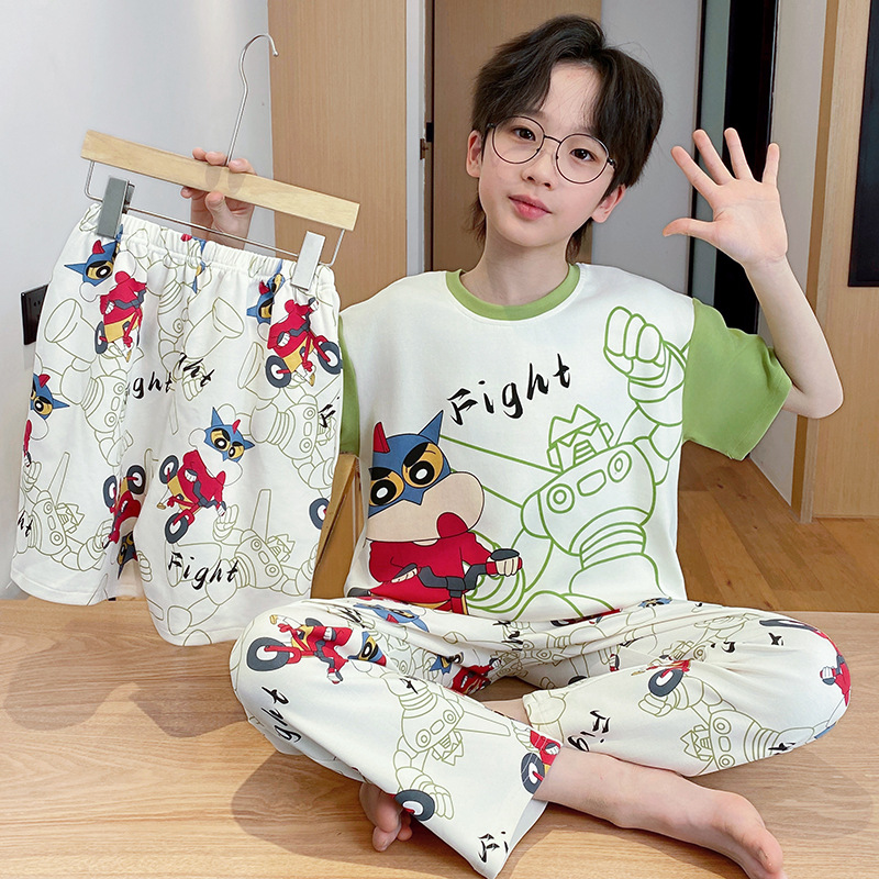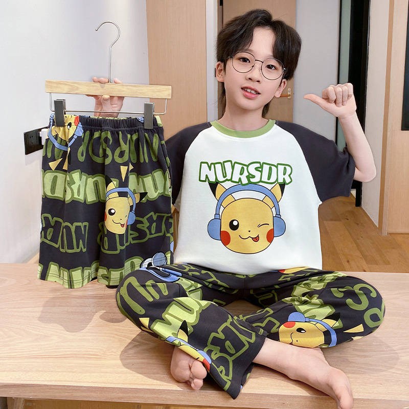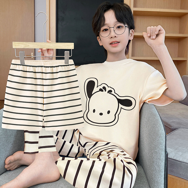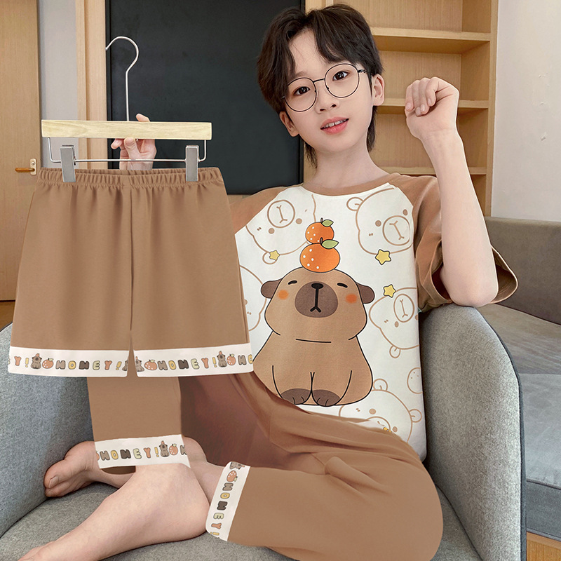 어린이 잠옷 소년 2025 새로운 여름 순수 코튼 소년 3 피스 세트 반팔 바지 큰 어린이 가정 의류 여름 스타일스토어 가기