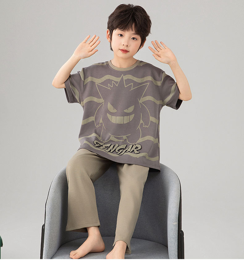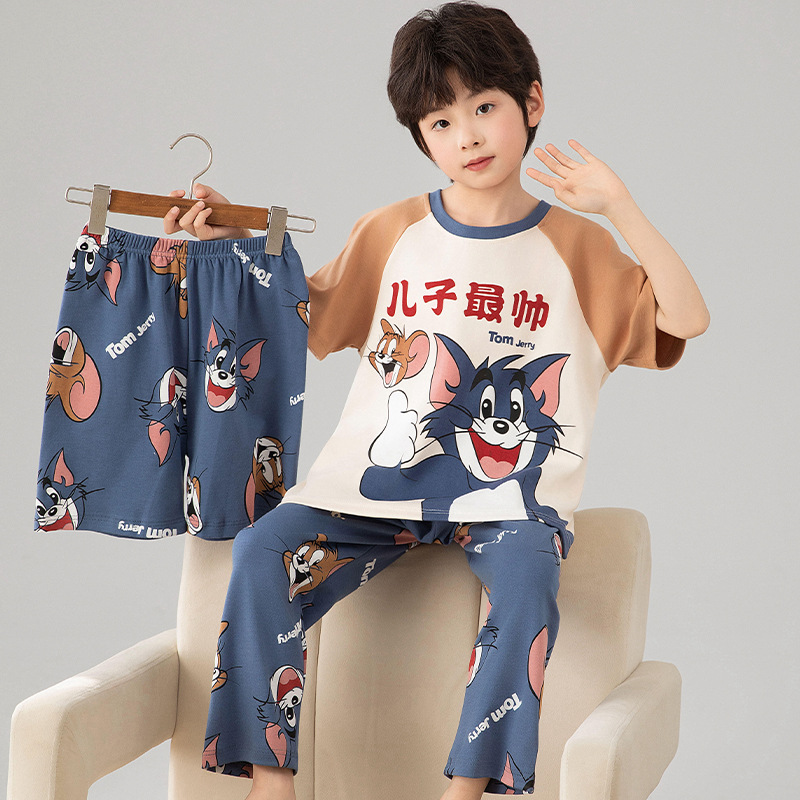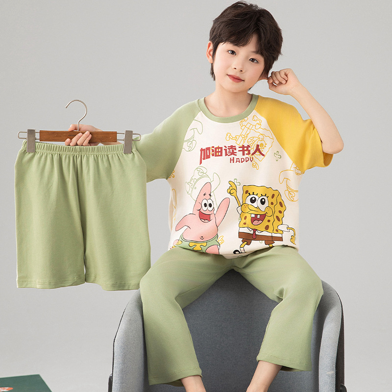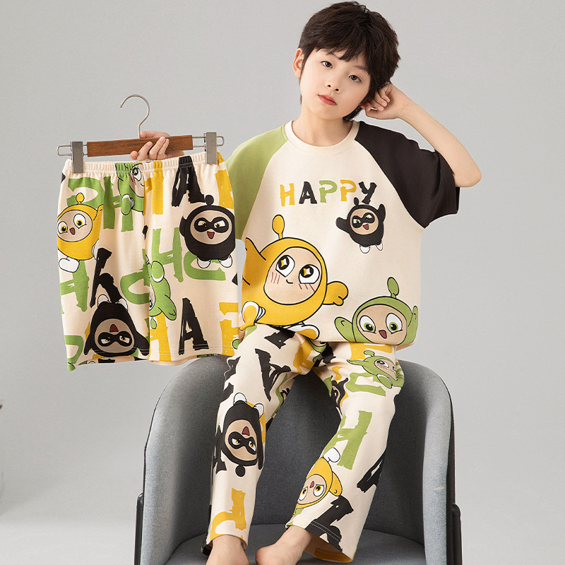 소년 잠옷 여름 얇은 순면 어린이 반팔 소년 중대형 어린이 2025 새로운 봄, 가을 면 3 피스 세트