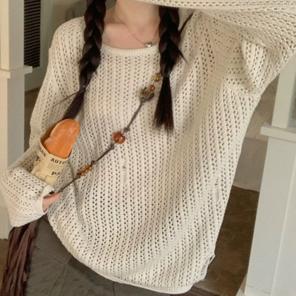 달콤한 스타일 느슨한 빈 스웨터 여성 25 년 여름 새 긴 소매 랩 스키니 썬 스크린 니트 블라우스 탑