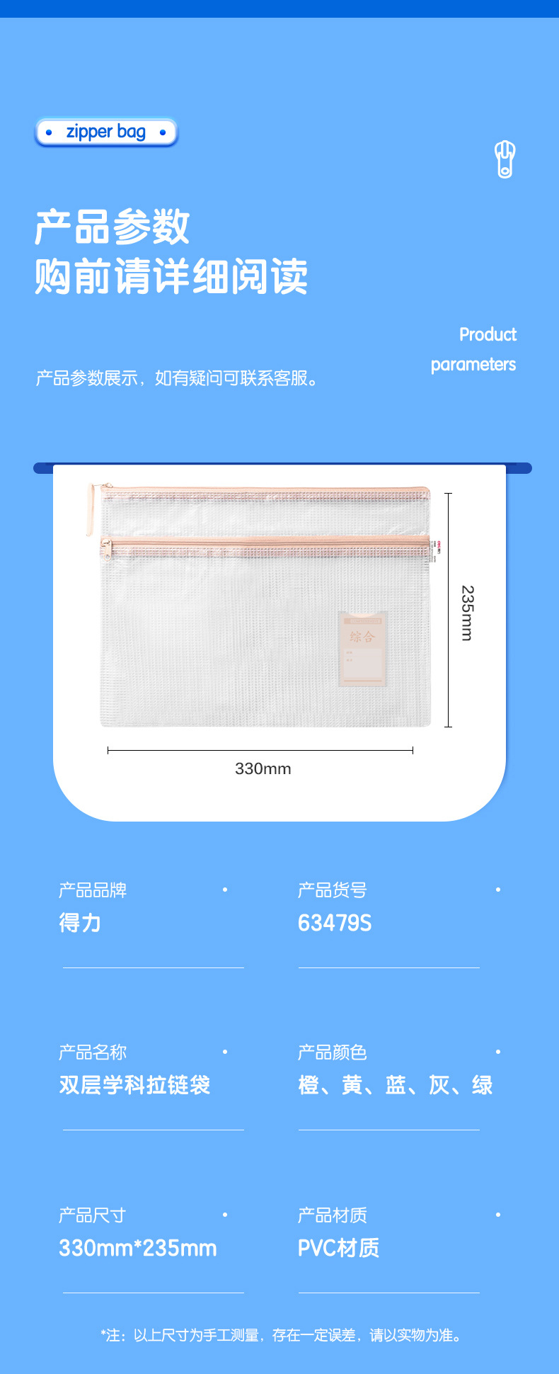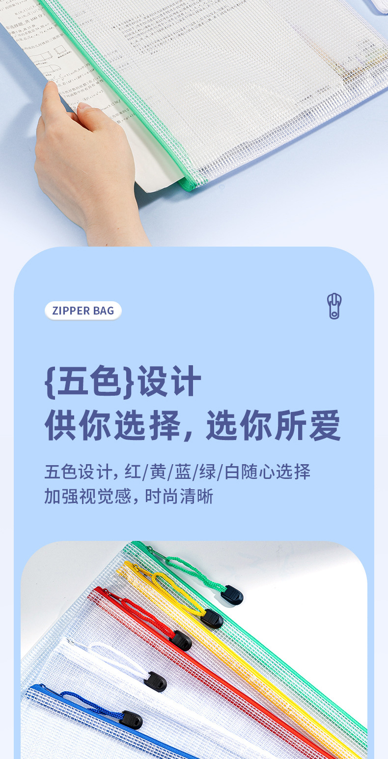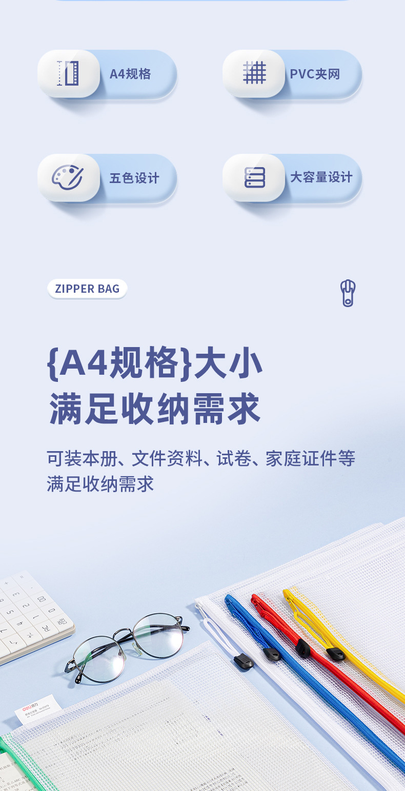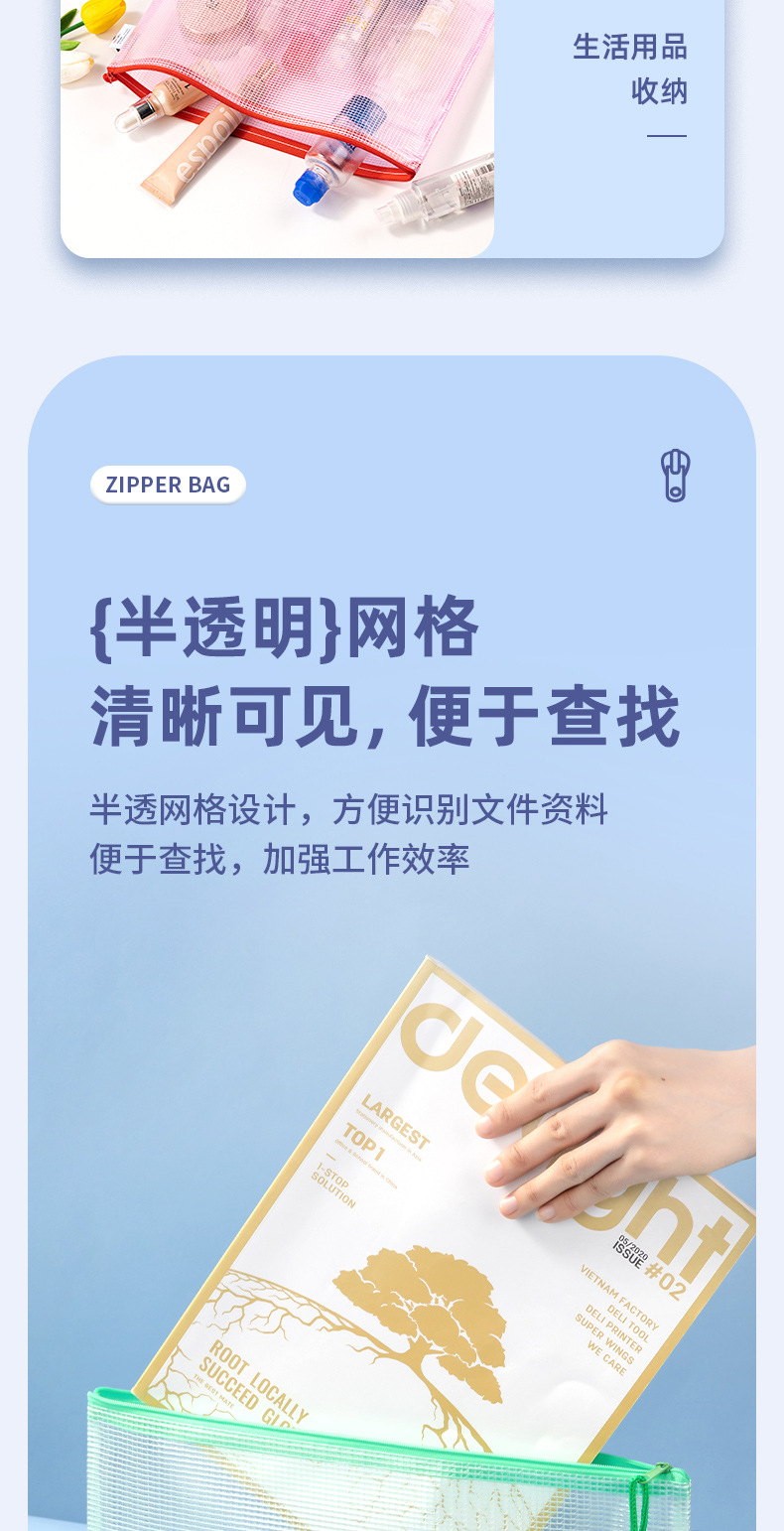 델리 63469/63479 메쉬 지퍼 백 A4 투명 PVC 학생 시험지 사무실 문서 보관 가방스토어 가기