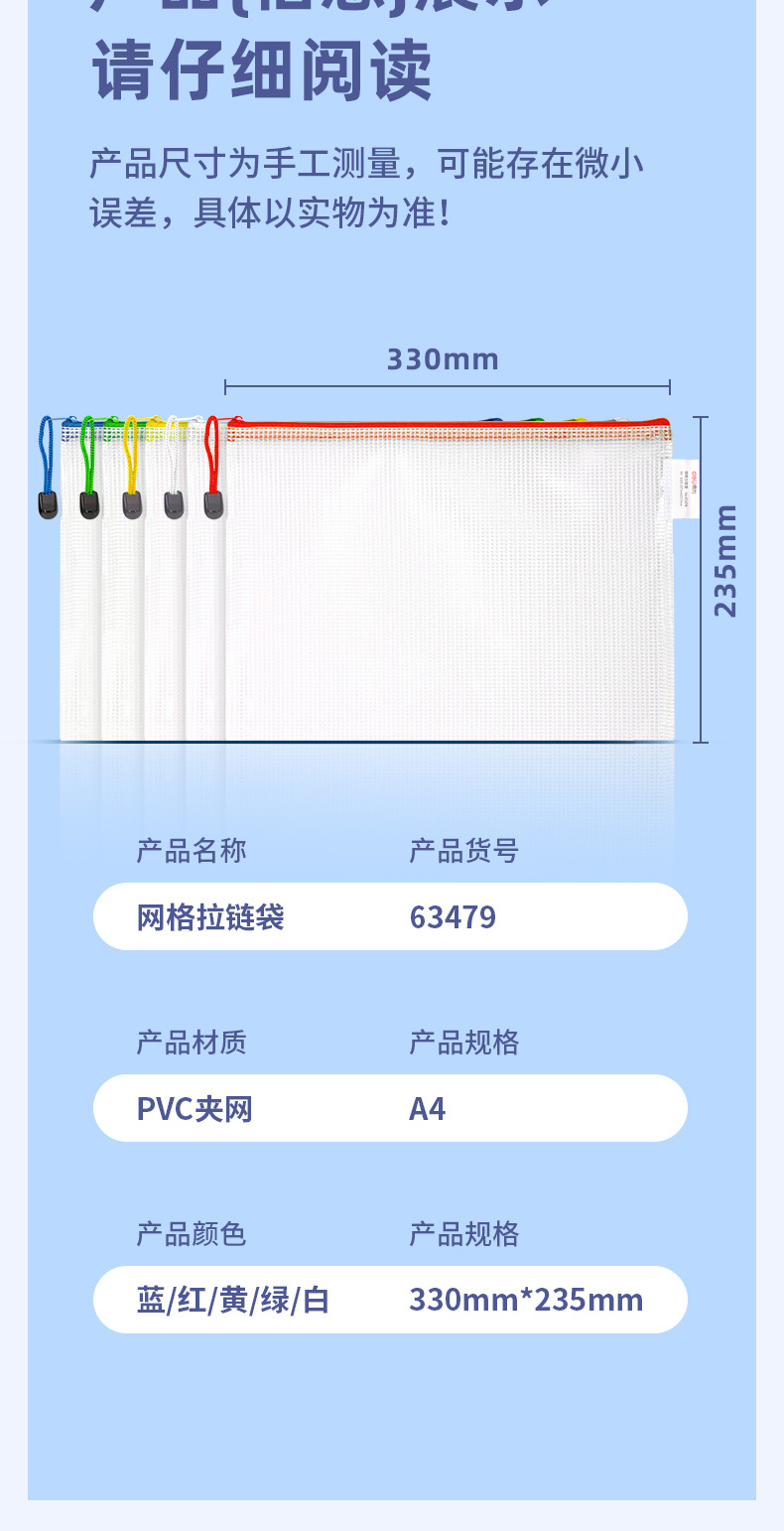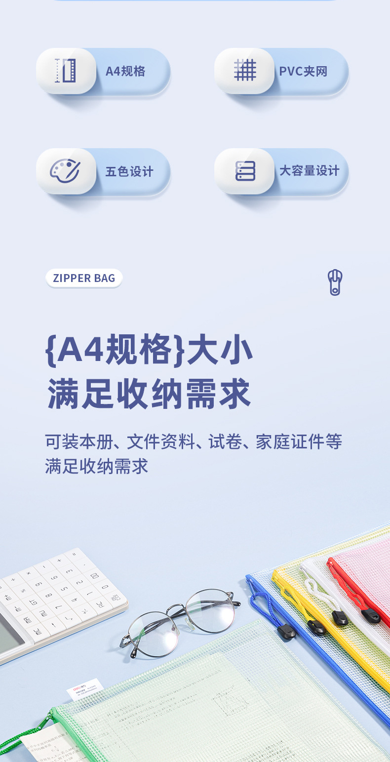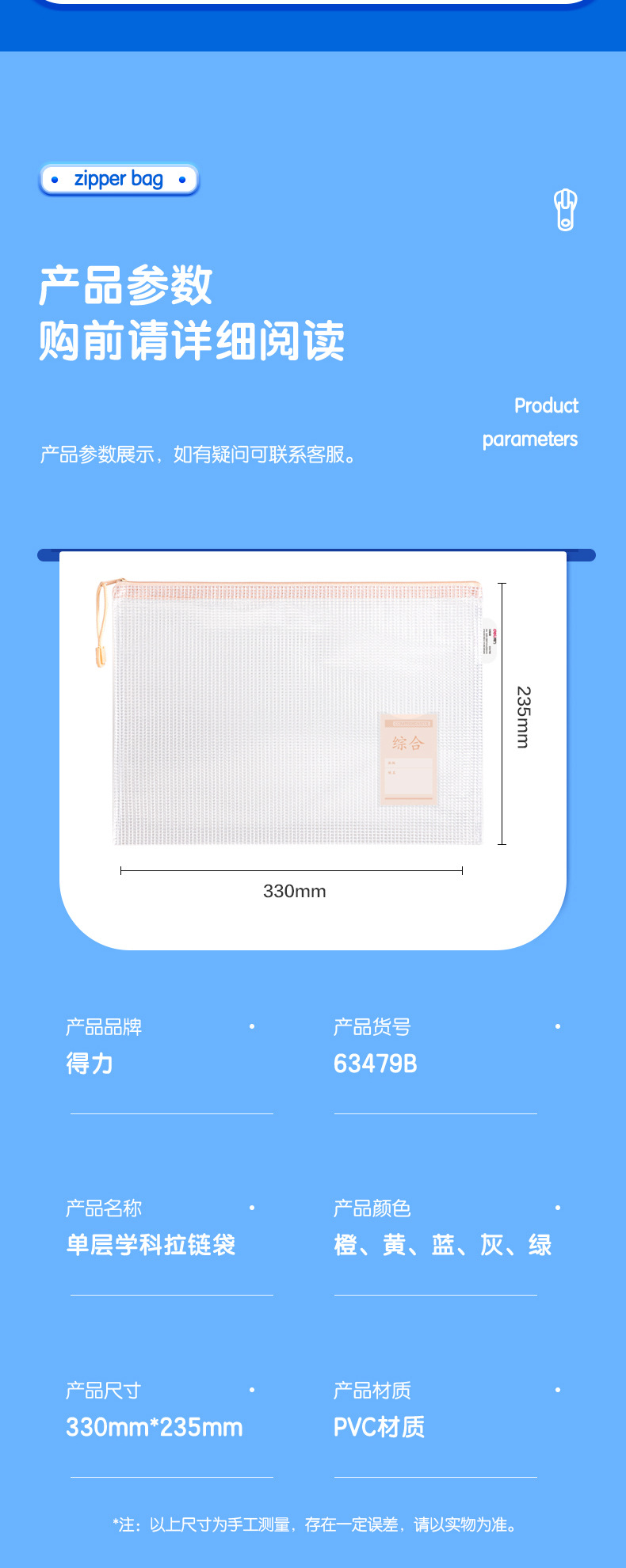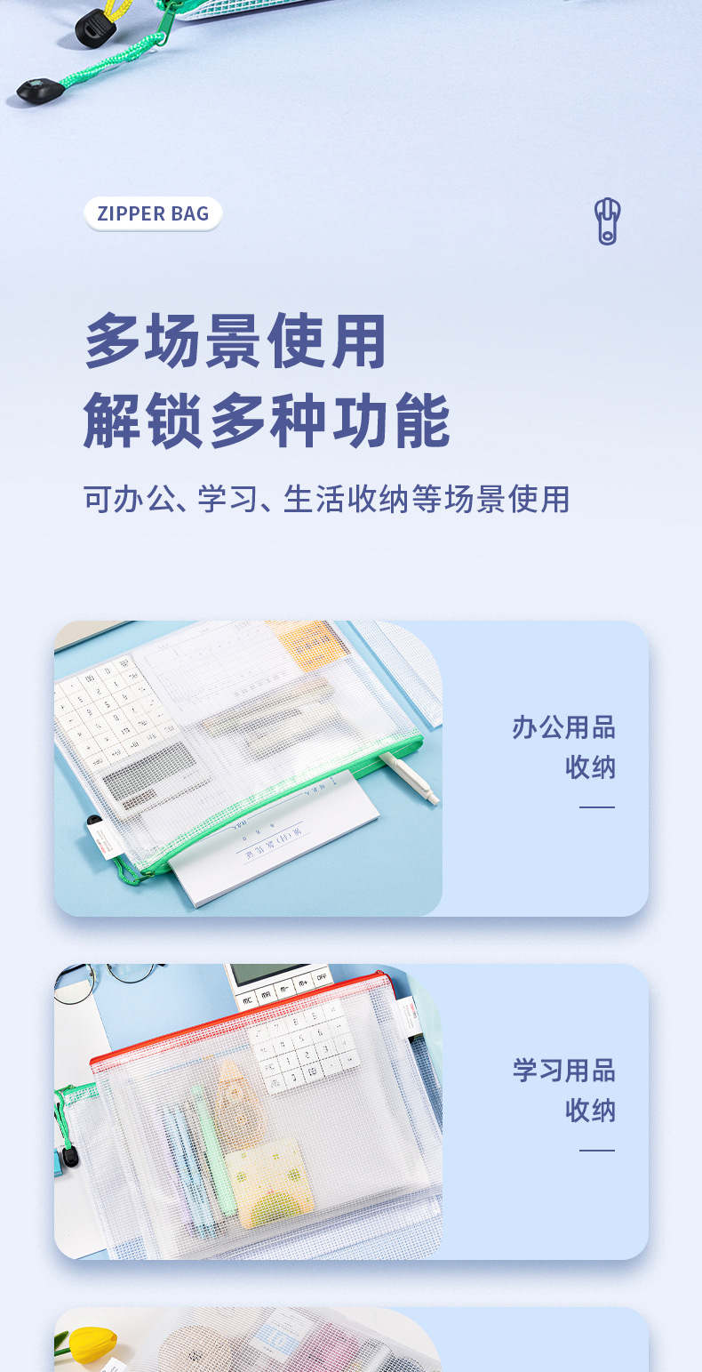 델리 63469/63479 메쉬 지퍼 백 A4 투명 PVC 학생 시험지 사무실 문서 보관 가방스토어 가기