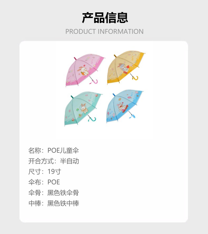 외국 무역 품질 19inch 만화 어린이 우산 귀여운 양산 곡선형 어린이 토끼 자동 우산 친환경 POE 우산