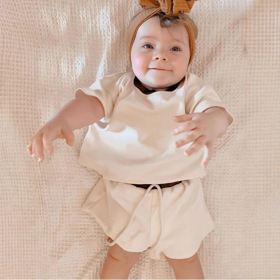인즈 한국식 아기 반팔 세트 크로스 보더 아동복 여름 루즈 소프트 라운드 넥 티셔츠 스포츠 반바지 투피스 세트