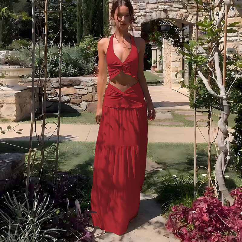 크로스보더 2026 봄/여름 신상 유럽 및 미국 여성복 섹시 플리츠 홀터넥 탑과 러플 롱 스커트 투피스 세트스토어 가기