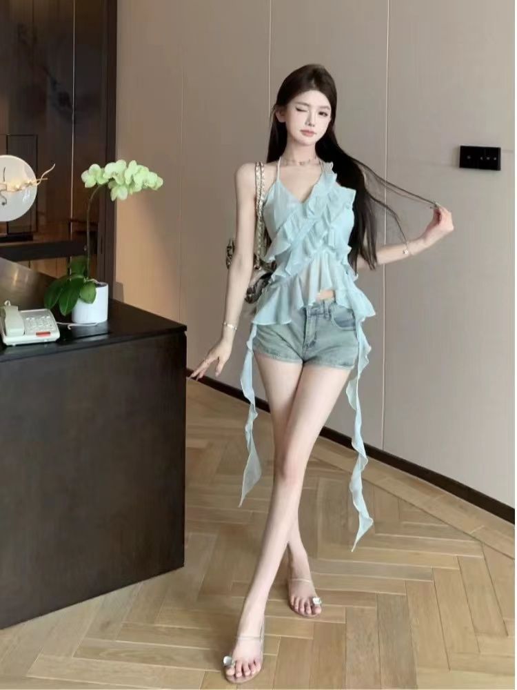 크로스보더 도매 러플 홀터넥 슬리브리스 여성 슬림핏 불규칙한 디자인의 짧은 탑 외출용스토어 가기