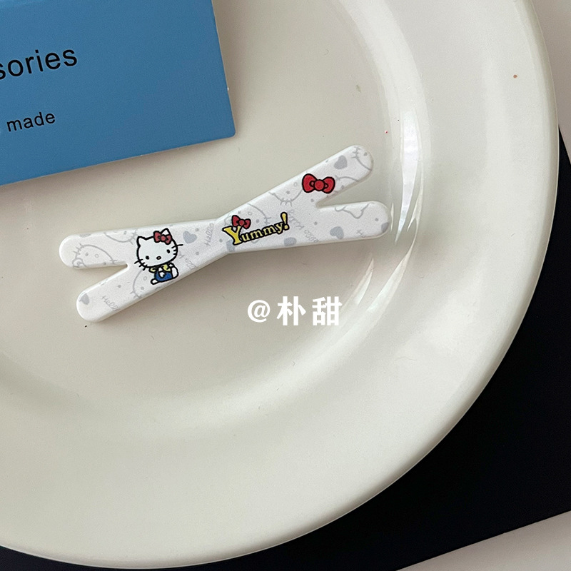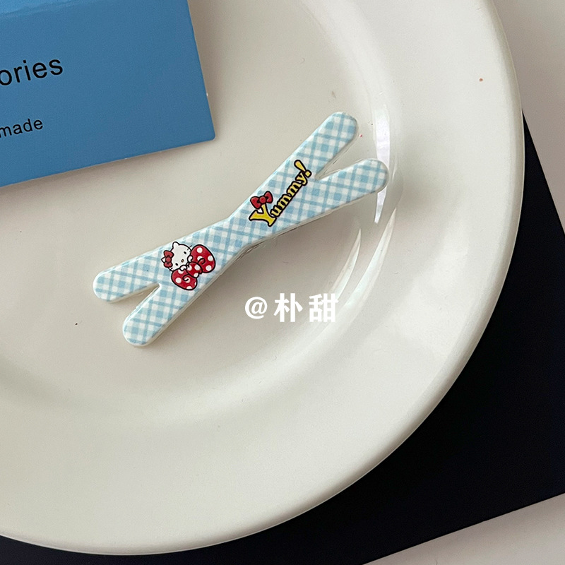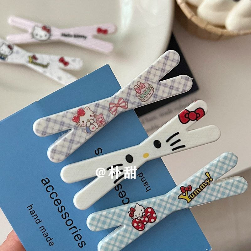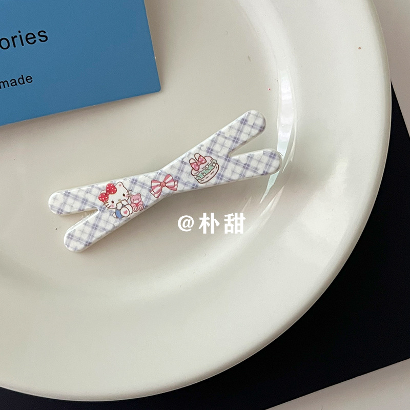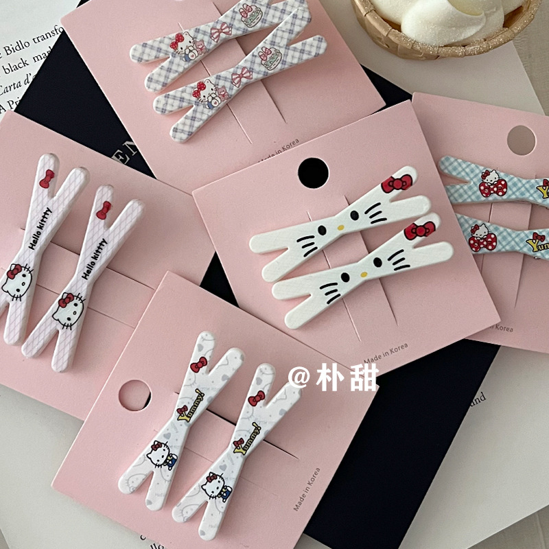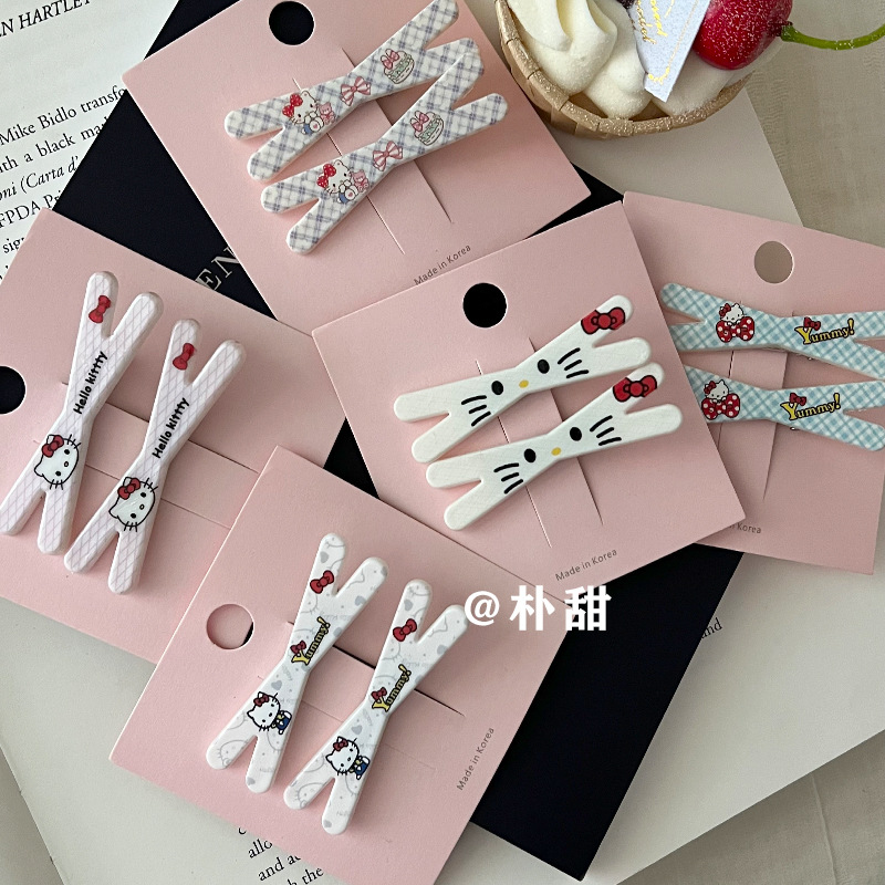 KT 만화 크로스 클립 소녀 하트 고양이 체크 무늬 머리핀 체리 부드러운 자매 달콤한 언니 앞머리 사이드 클립 어린이 머리핀스토어 가기
