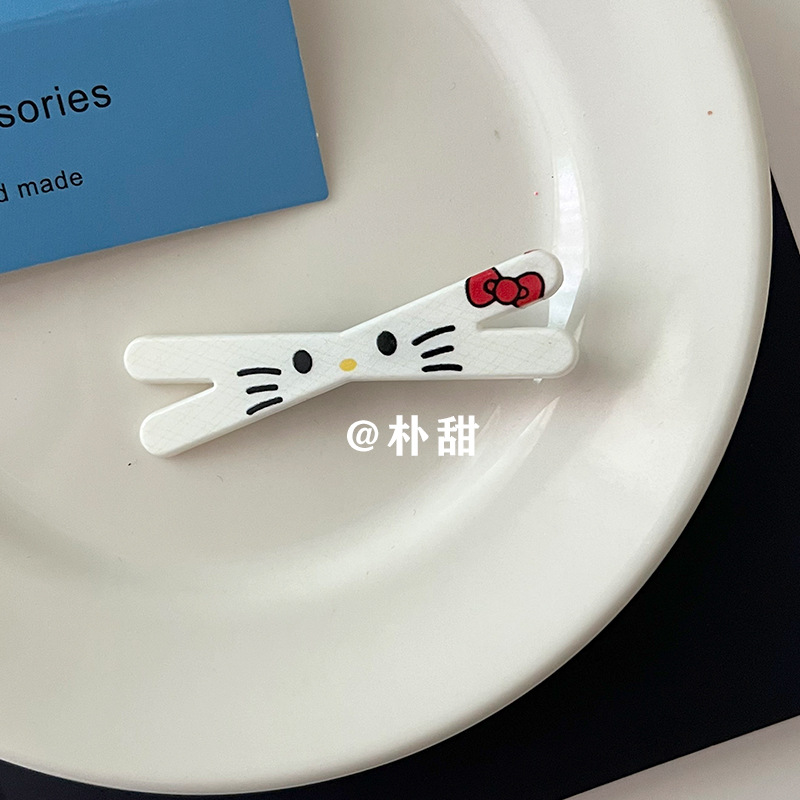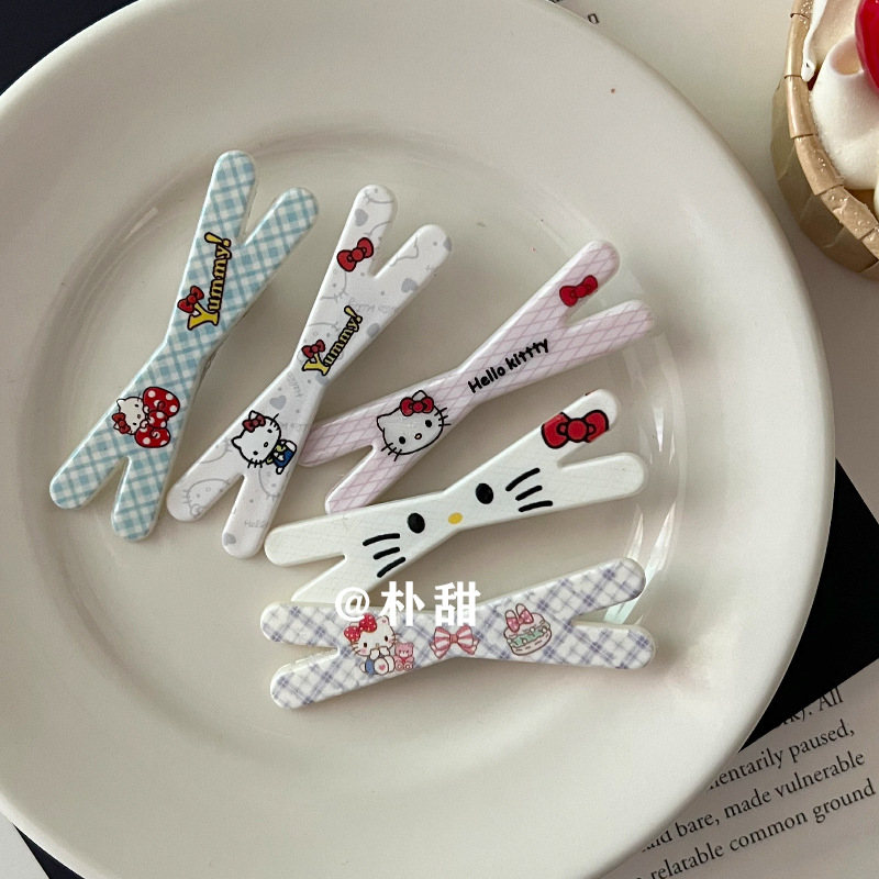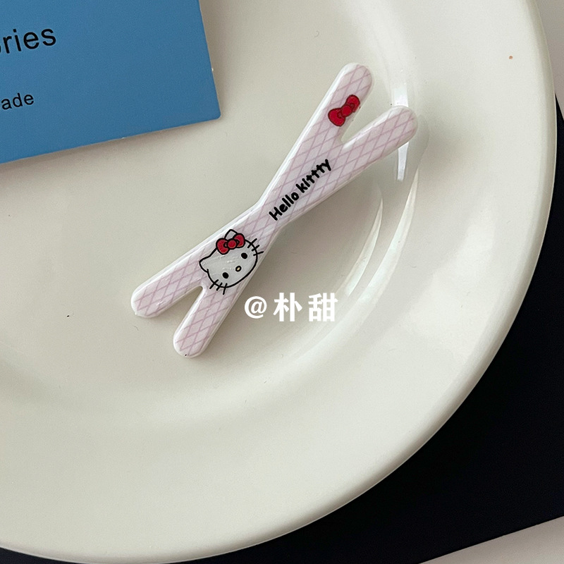 KT 만화 크로스 클립 소녀 하트 고양이 체크 무늬 머리핀 체리 부드러운 자매 달콤한 언니 앞머리 사이드 클립 어린이 머리핀