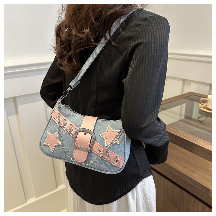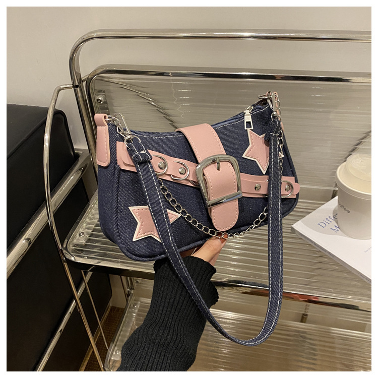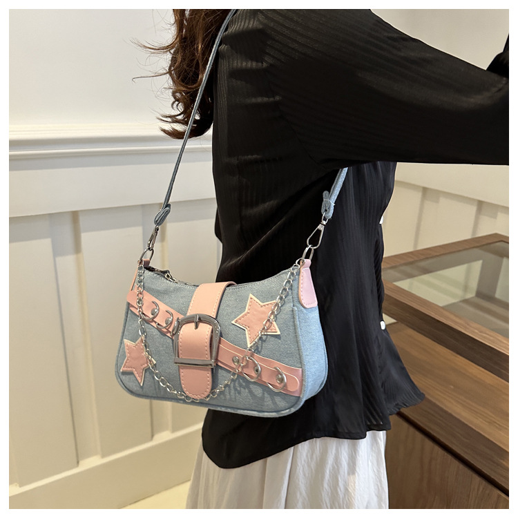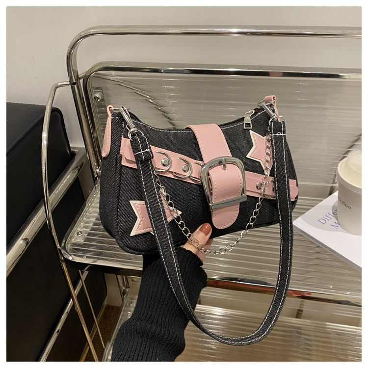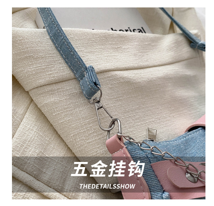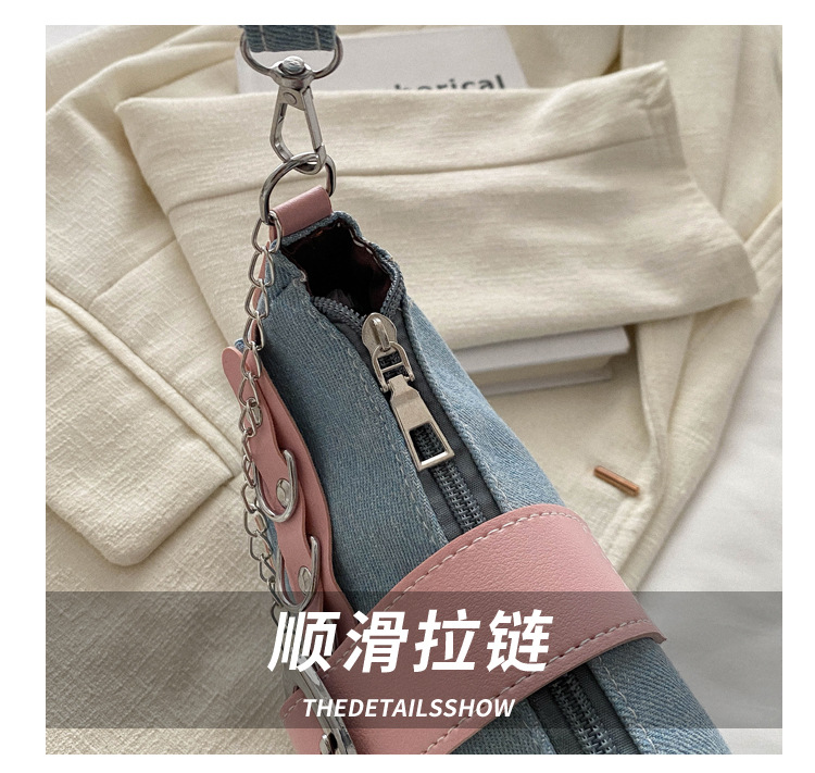 2025 새로운 한국식 언더암 가방 여성 봄 서양식 콘트라스트 컬러 숄더백 캐주얼 독특한 체인 데님 여성용 가방스토어 가기
