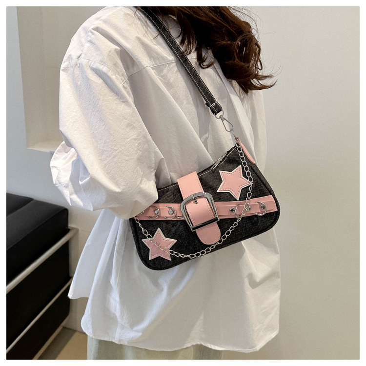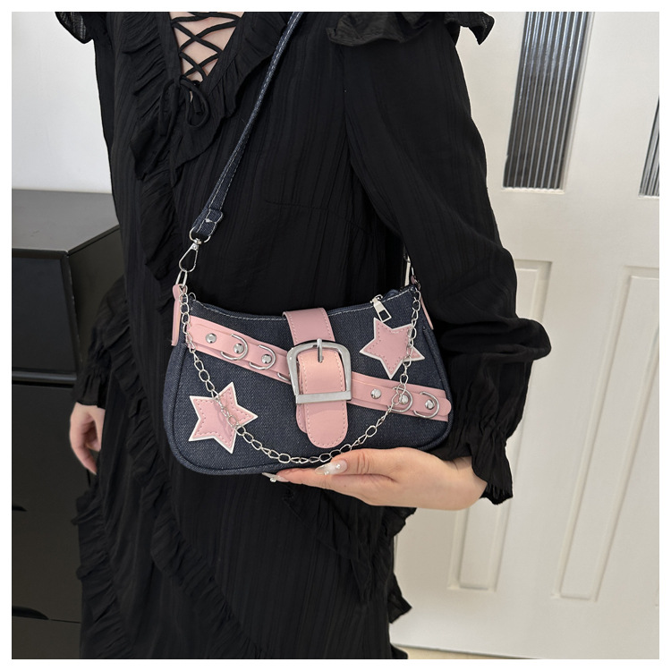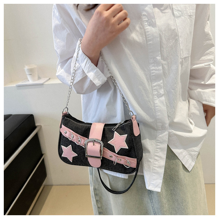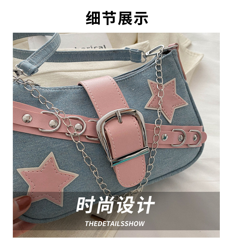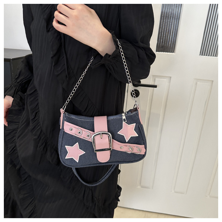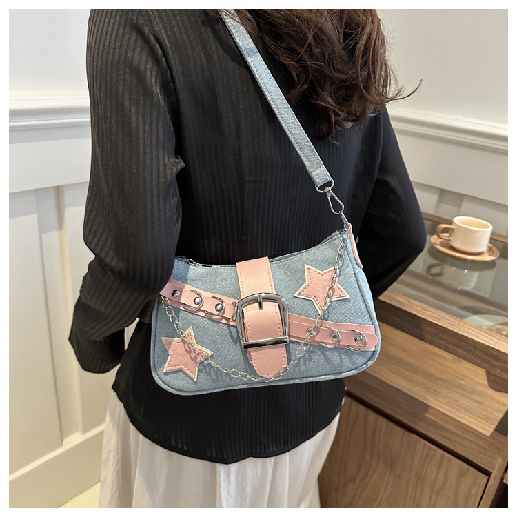 2025 새로운 한국식 언더암 가방 여성 봄 서양식 콘트라스트 컬러 숄더백 캐주얼 독특한 체인 데님 여성용 가방스토어 가기