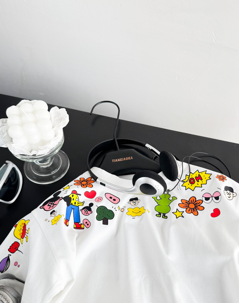 소년 소녀 재미 만화 인쇄 반팔 티셔츠 2025 여름 어린이를위한 새로운 느슨한 면 탑 쿨 캐주얼