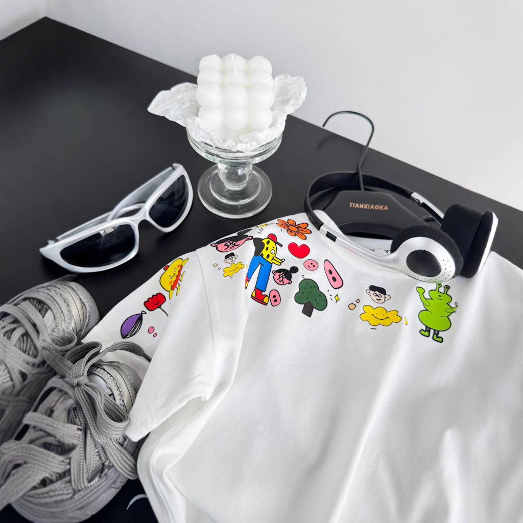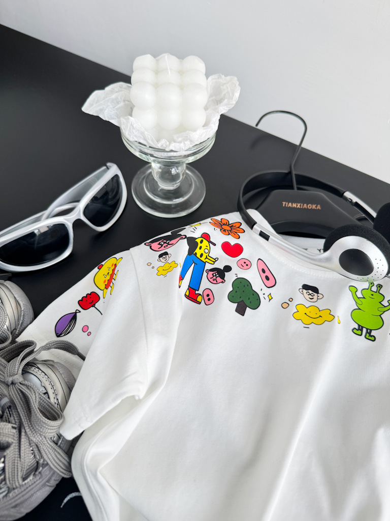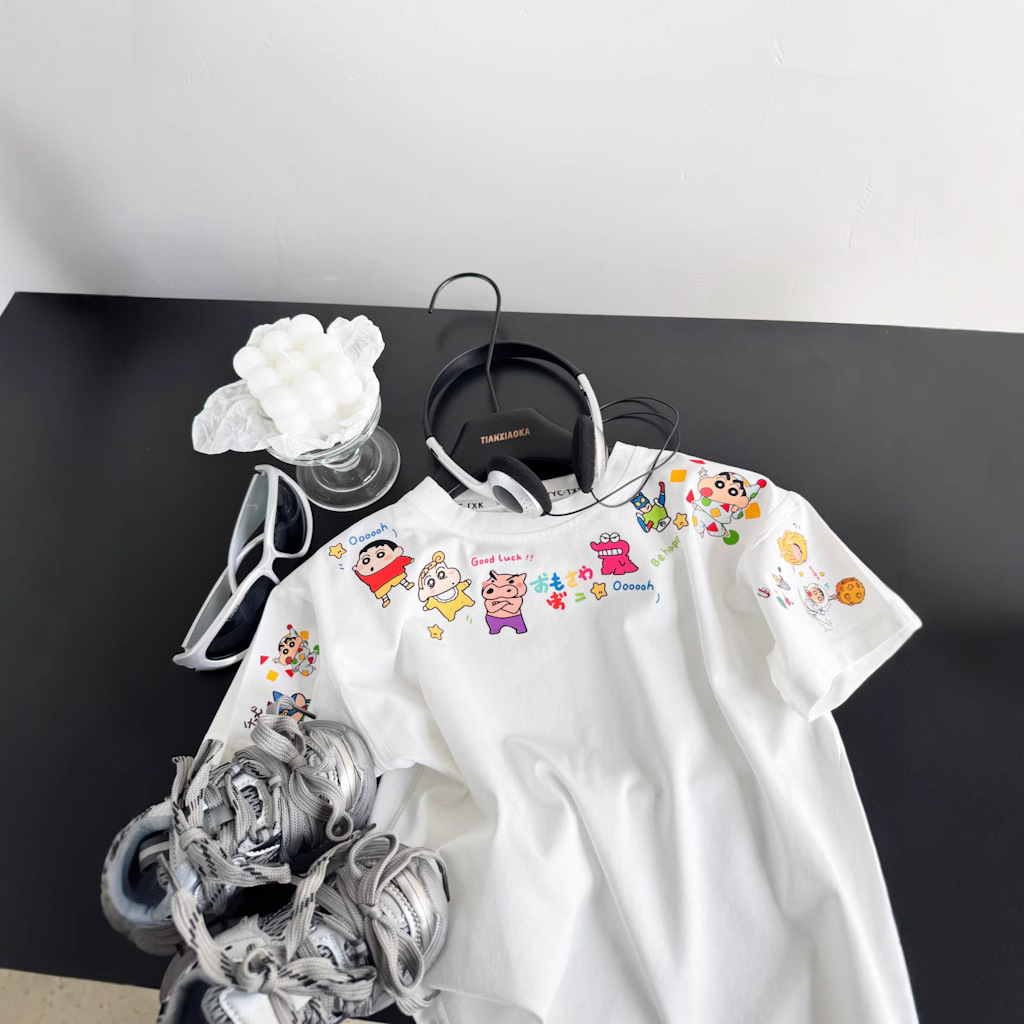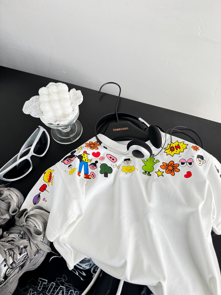 소년 소녀 재미 만화 인쇄 반팔 티셔츠 2025 여름 어린이를위한 새로운 느슨한 면 탑 쿨 캐주얼스토어 가기