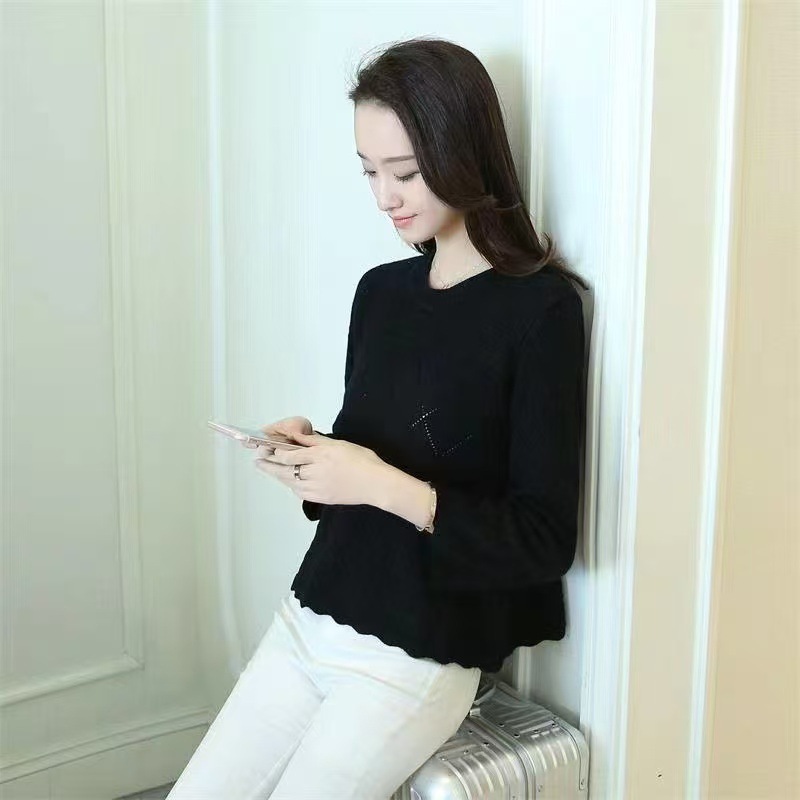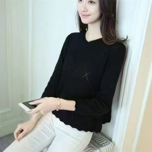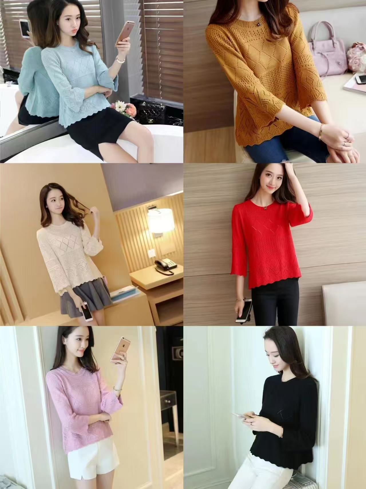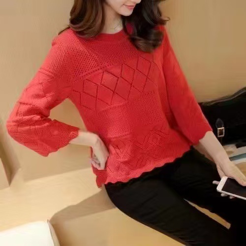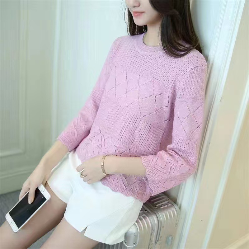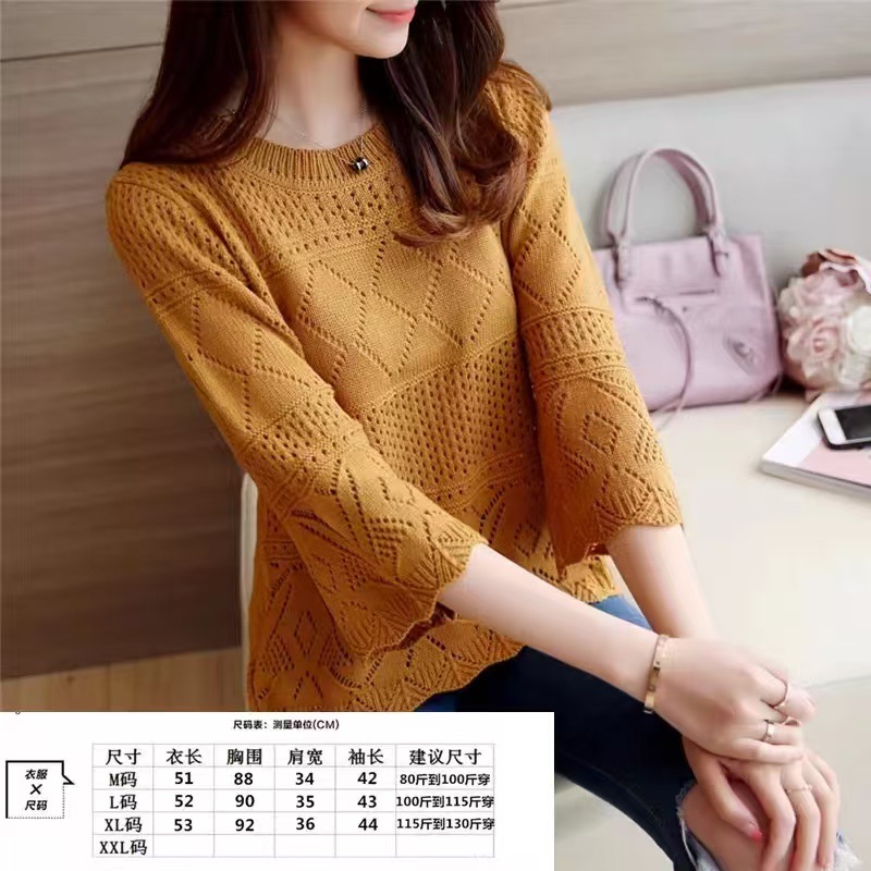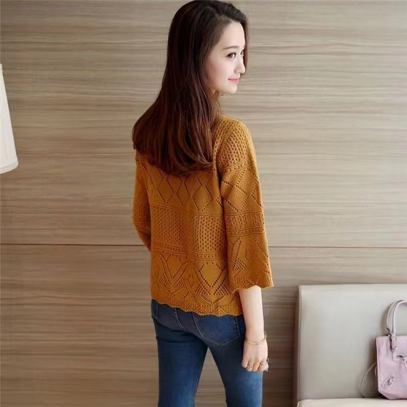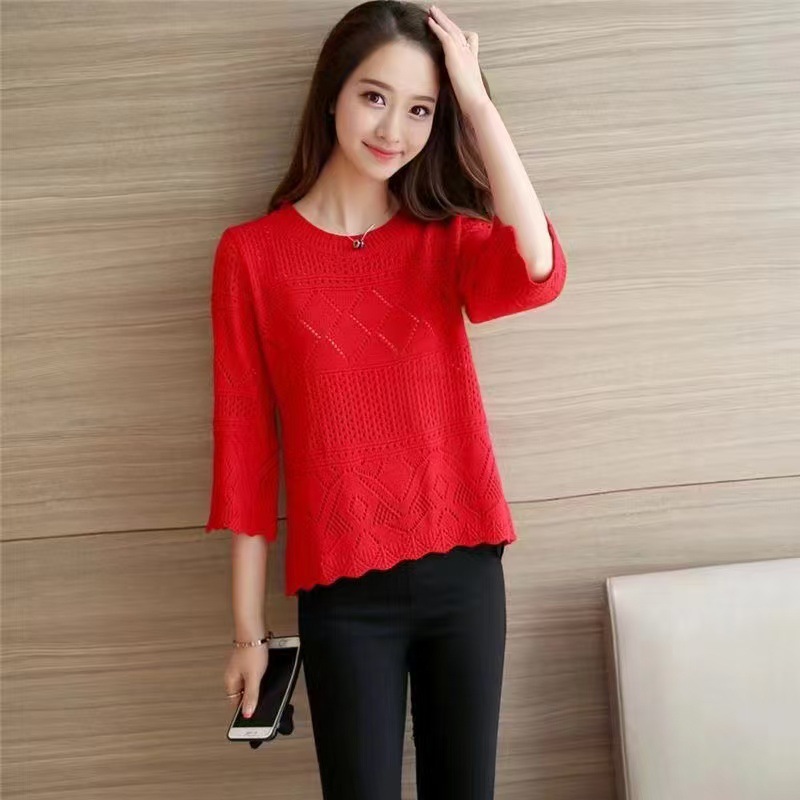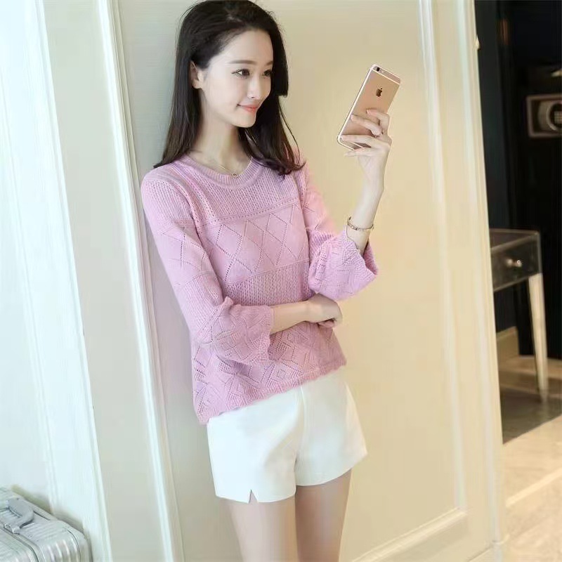 봄과 여름 뿔 소매 풀오버 스웨터 여자 한국식 루즈 미드 슬리브 쇼트 블라우스 올 매치 라운드 넥 할로우 얇은 스웨터
