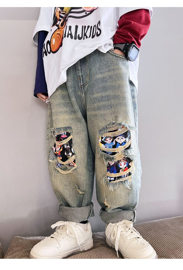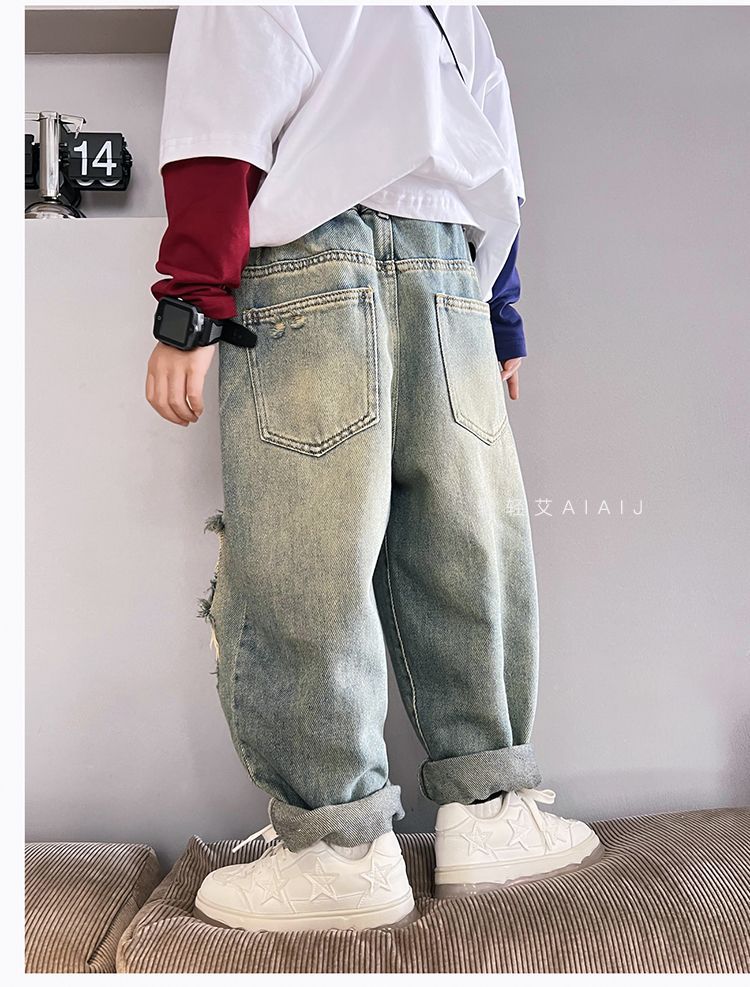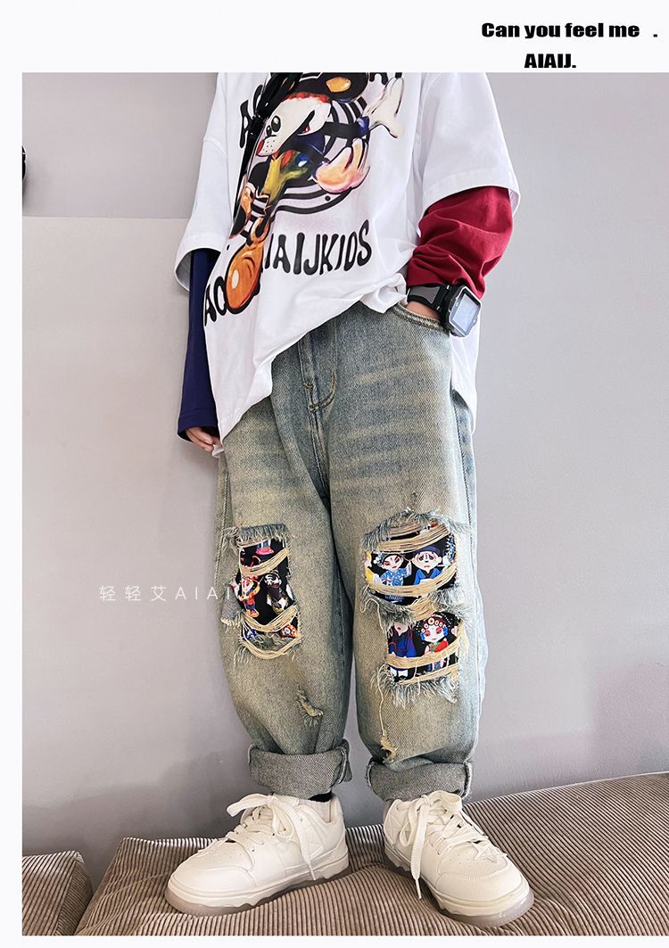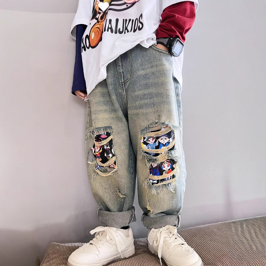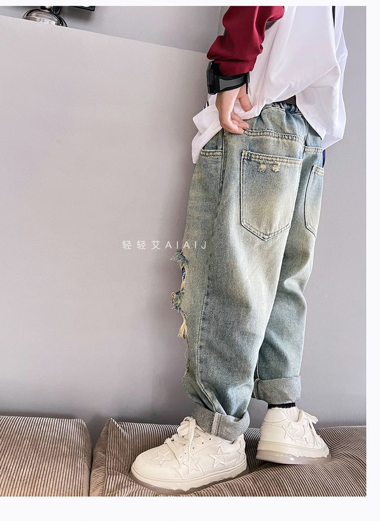 소년 봄 얇은 찢어진 청바지 2025 새로운 스타일 중대형 어린이 개성있는 멋진 스타일 캐주얼 바지 스트레이트 팬츠 유행스토어 가기