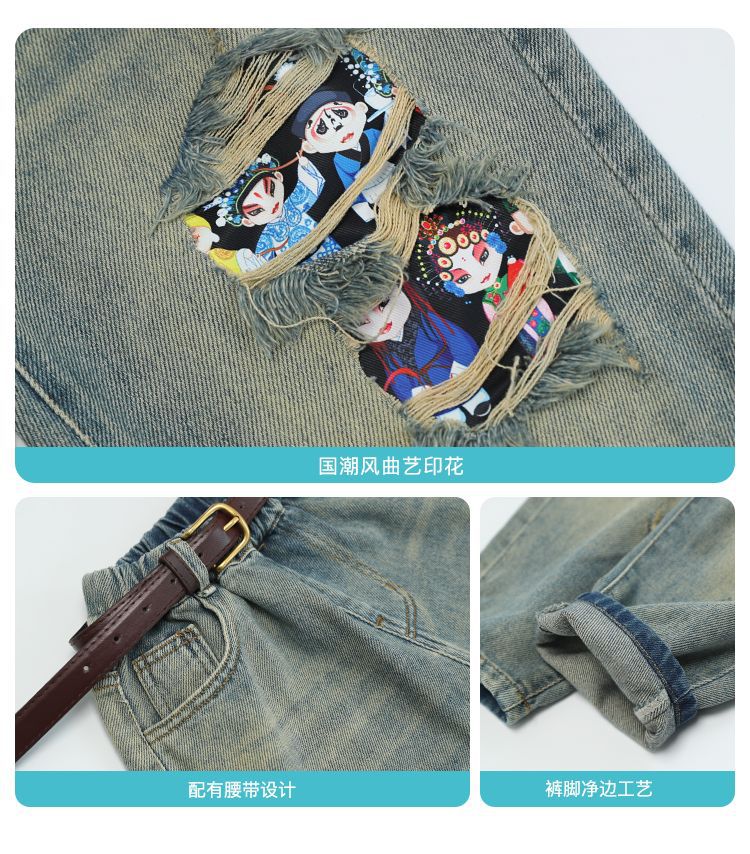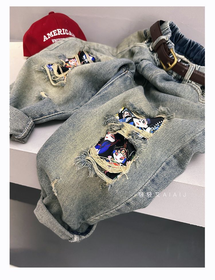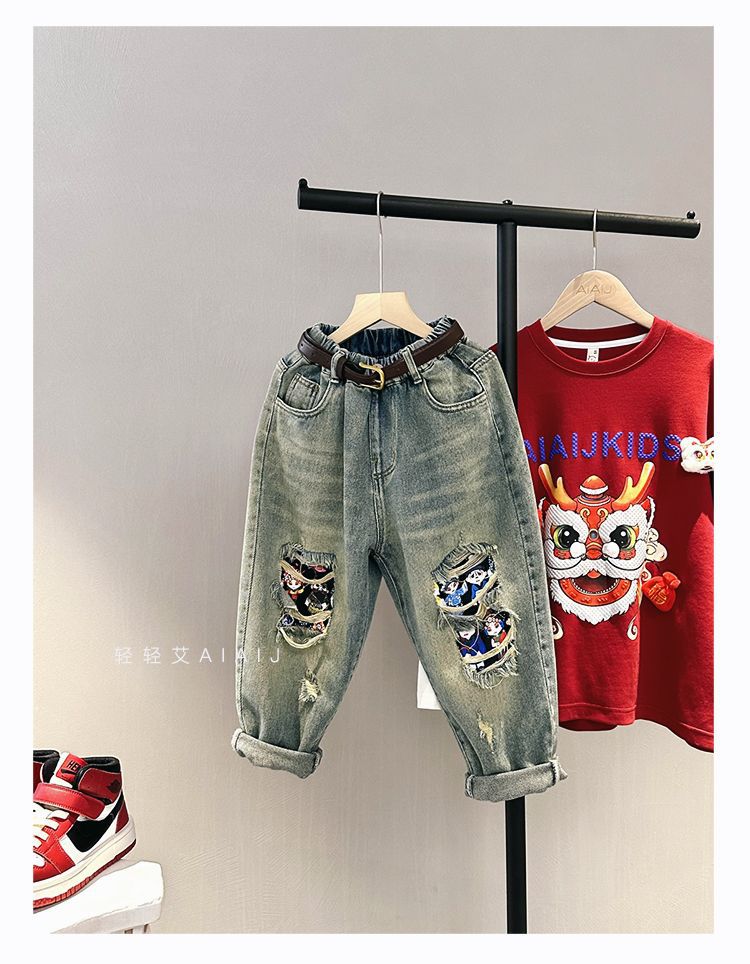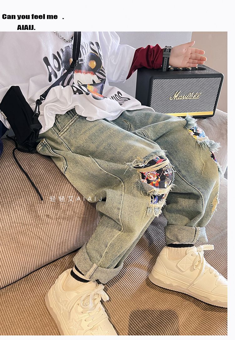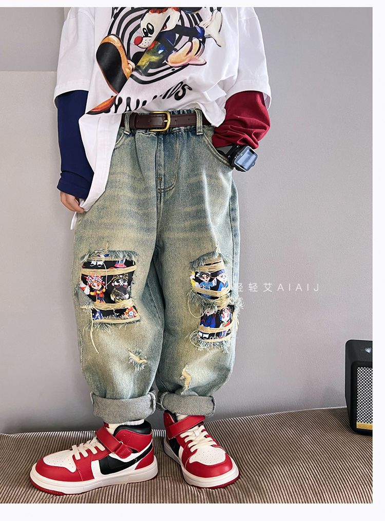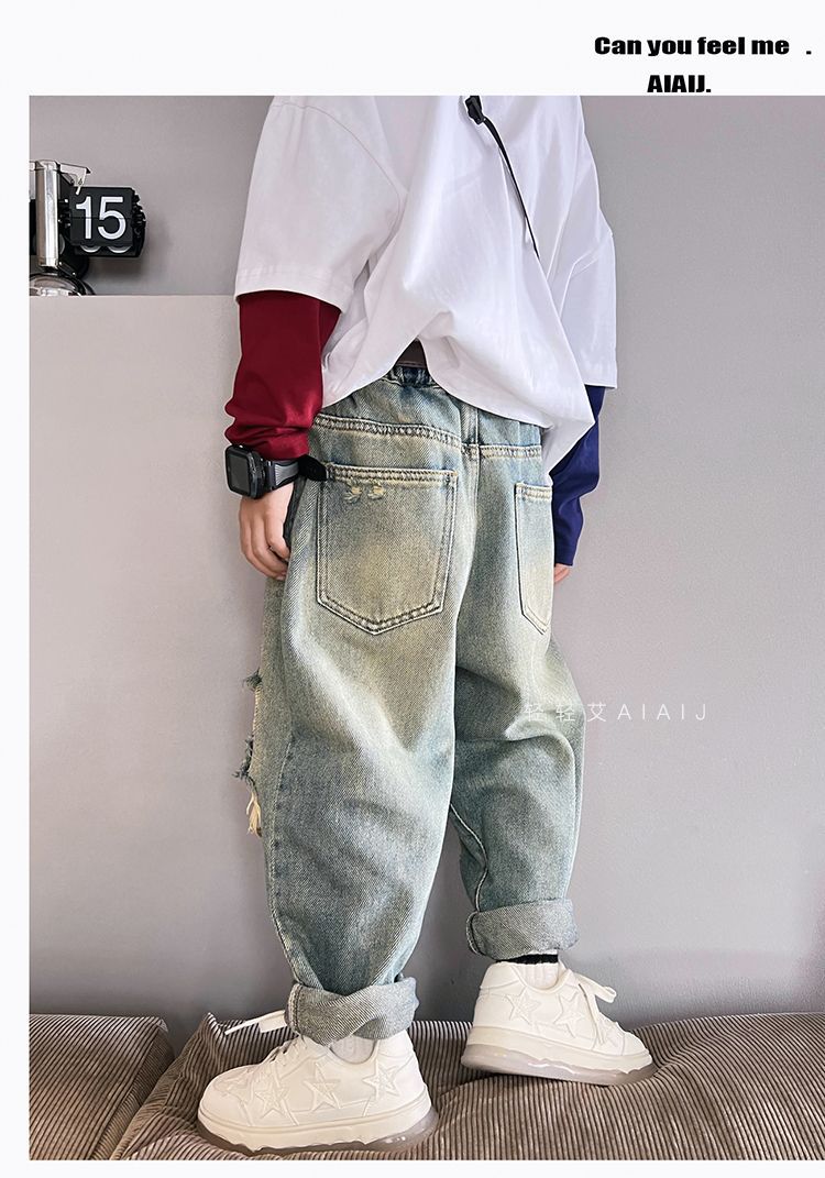 소년 봄 얇은 찢어진 청바지 2025 새로운 스타일 중대형 어린이 개성있는 멋진 스타일 캐주얼 바지 스트레이트 팬츠 유행스토어 가기