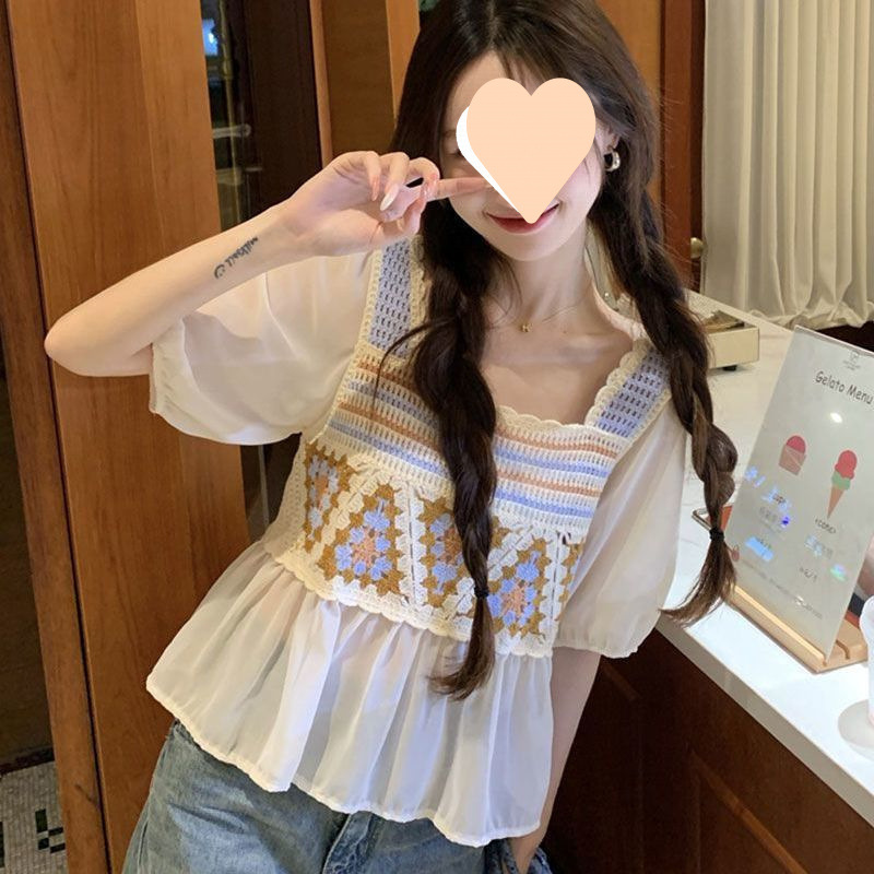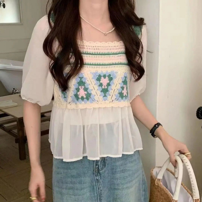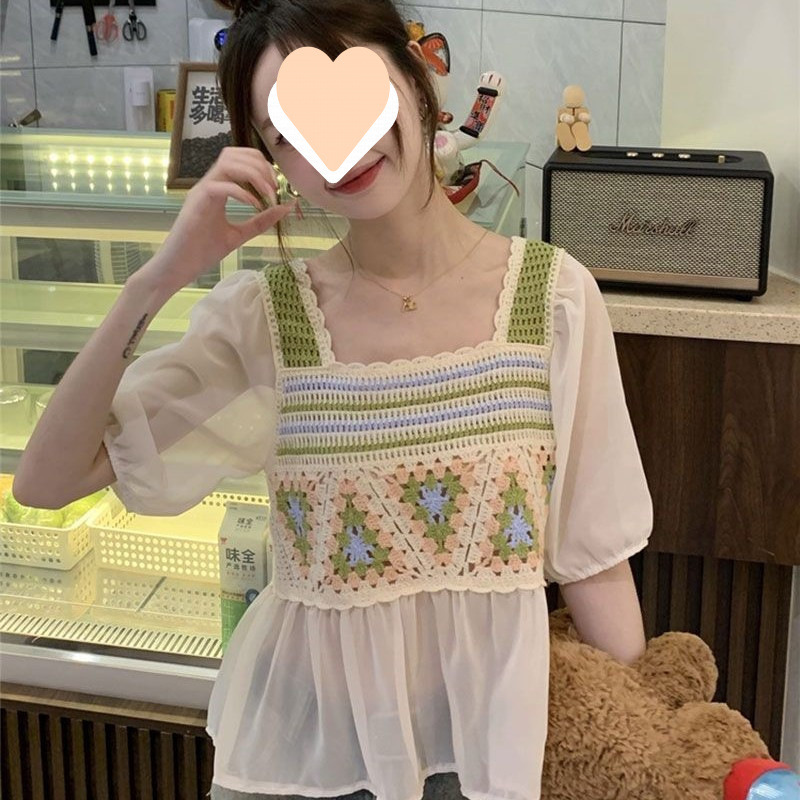 신선하고 달콤한 니트 스티칭 쉬폰 셔츠 빈 콘트라스트 컬러 스티칭 스퀘어 넥 여름 반팔 유행 탑스토어 가기