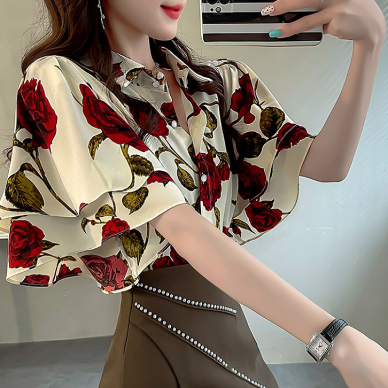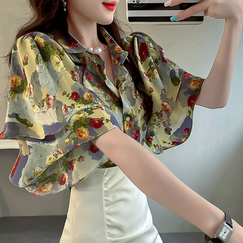 디자인 센스 러플 플로랄 탑 여성의 새로운 반팔 달콤한 쉬폰 셔츠 여성의 여름 느슨한 플러스 사이즈 꽃 셔츠