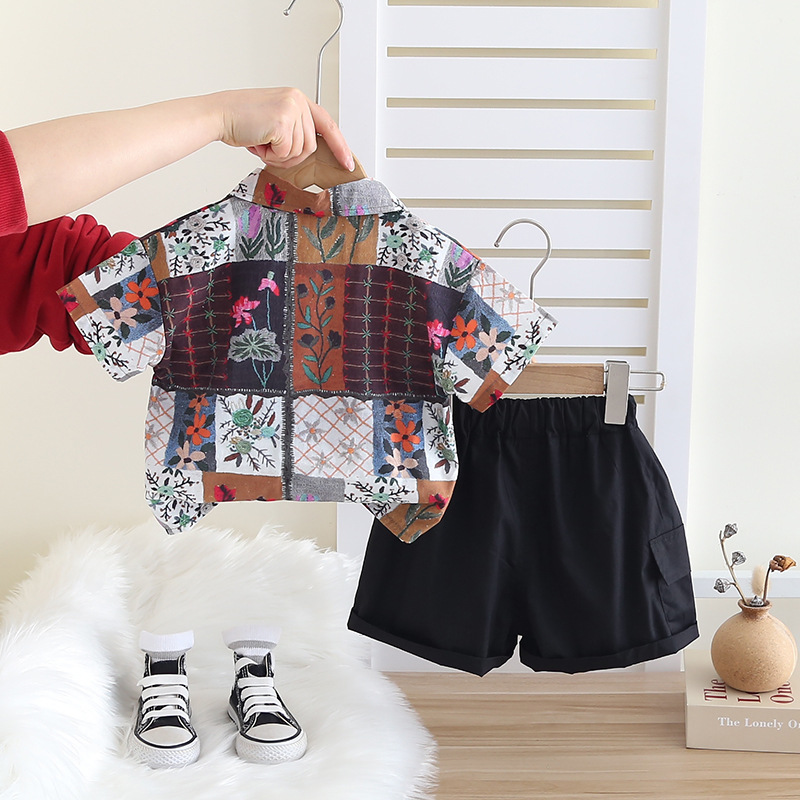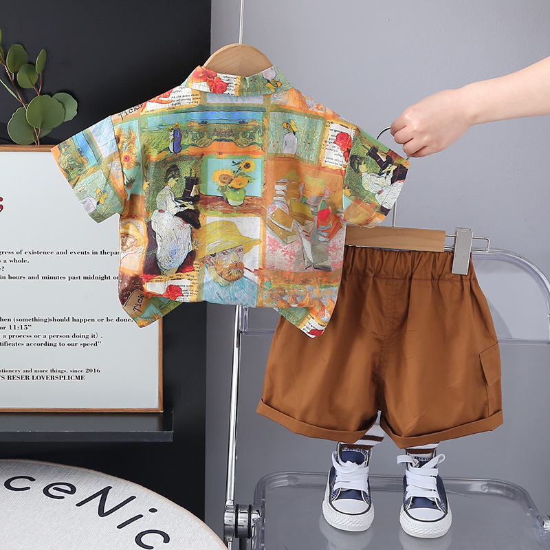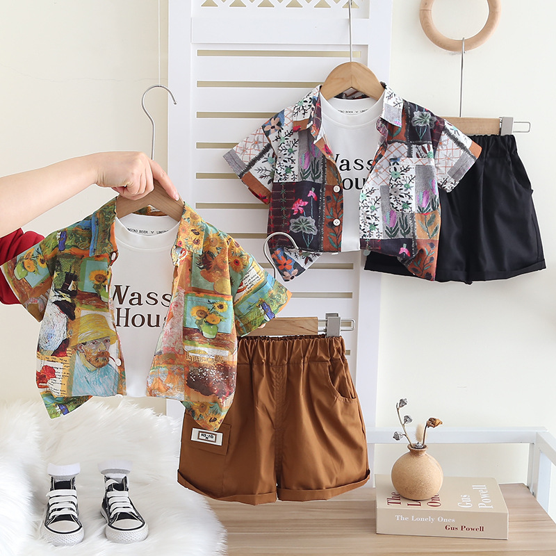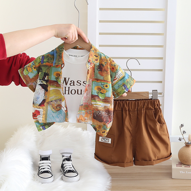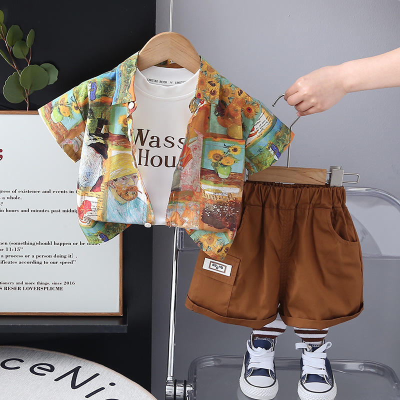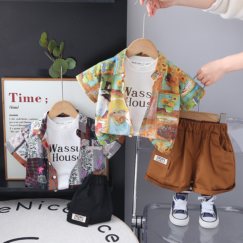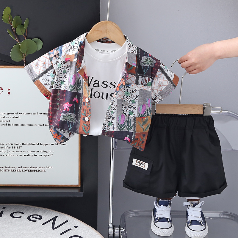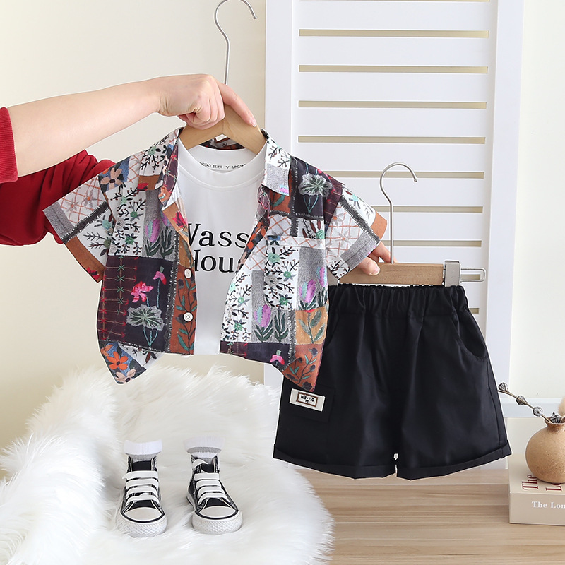 소년의 서양식 셔츠 정장 2025 새로운 어린이 여름 반팔 3 피스 세트 아기 여름 옷 유행 대외 무역