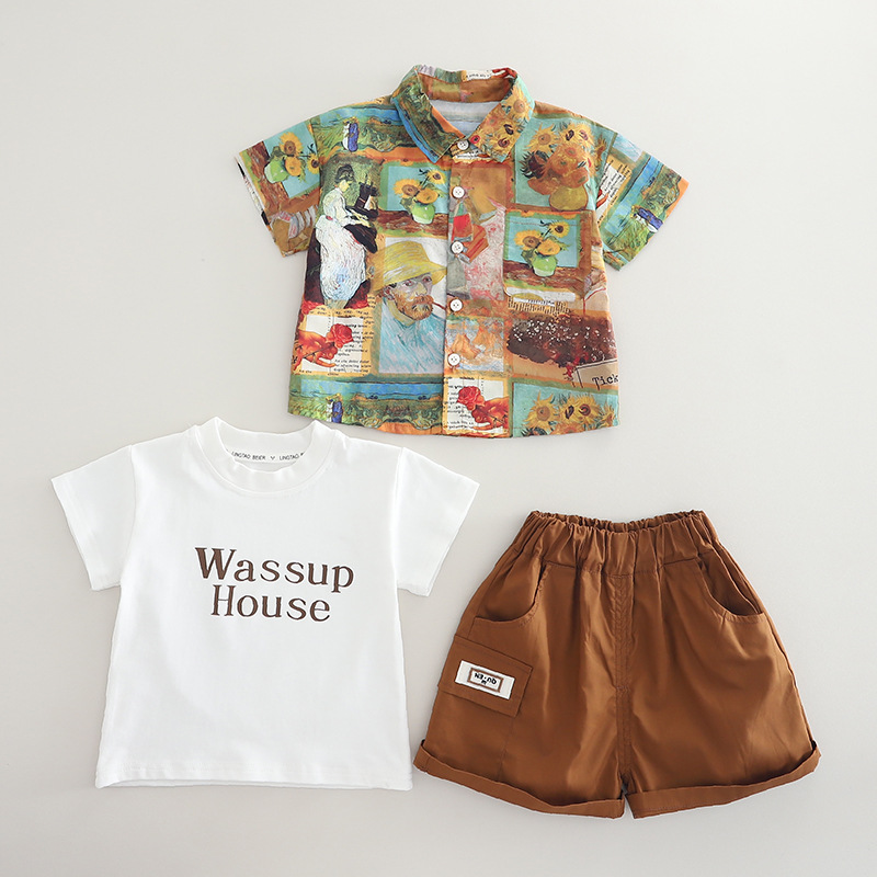 소년의 서양식 셔츠 정장 2025 새로운 어린이 여름 반팔 3 피스 세트 아기 여름 옷 유행 대외 무역스토어 가기