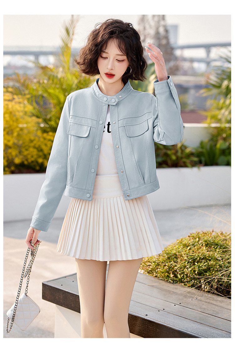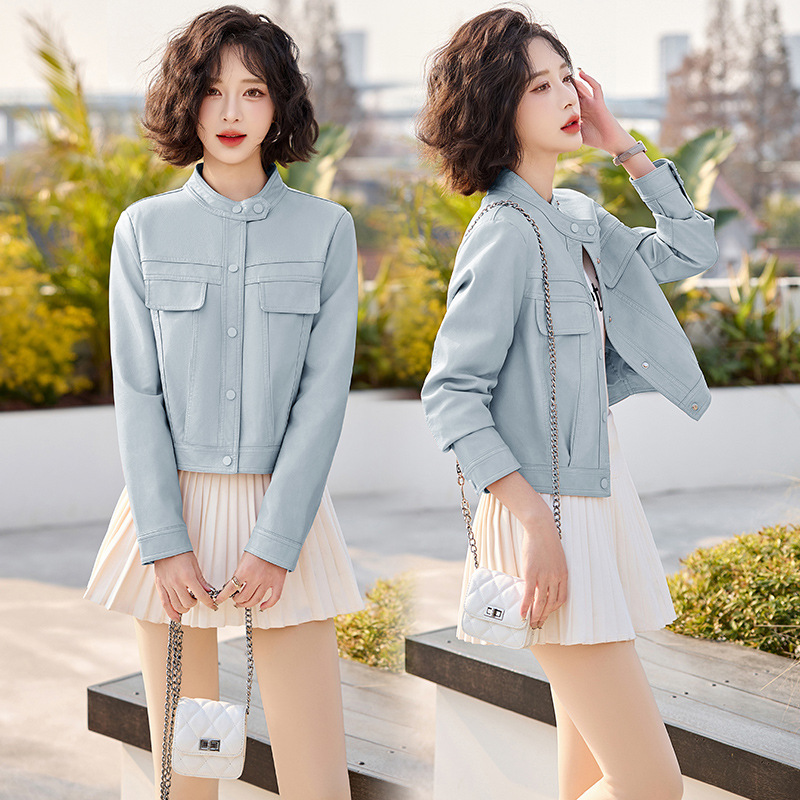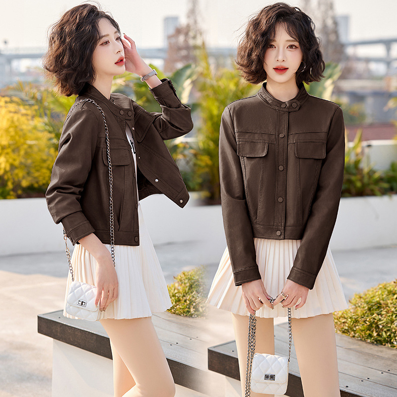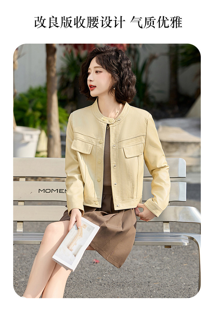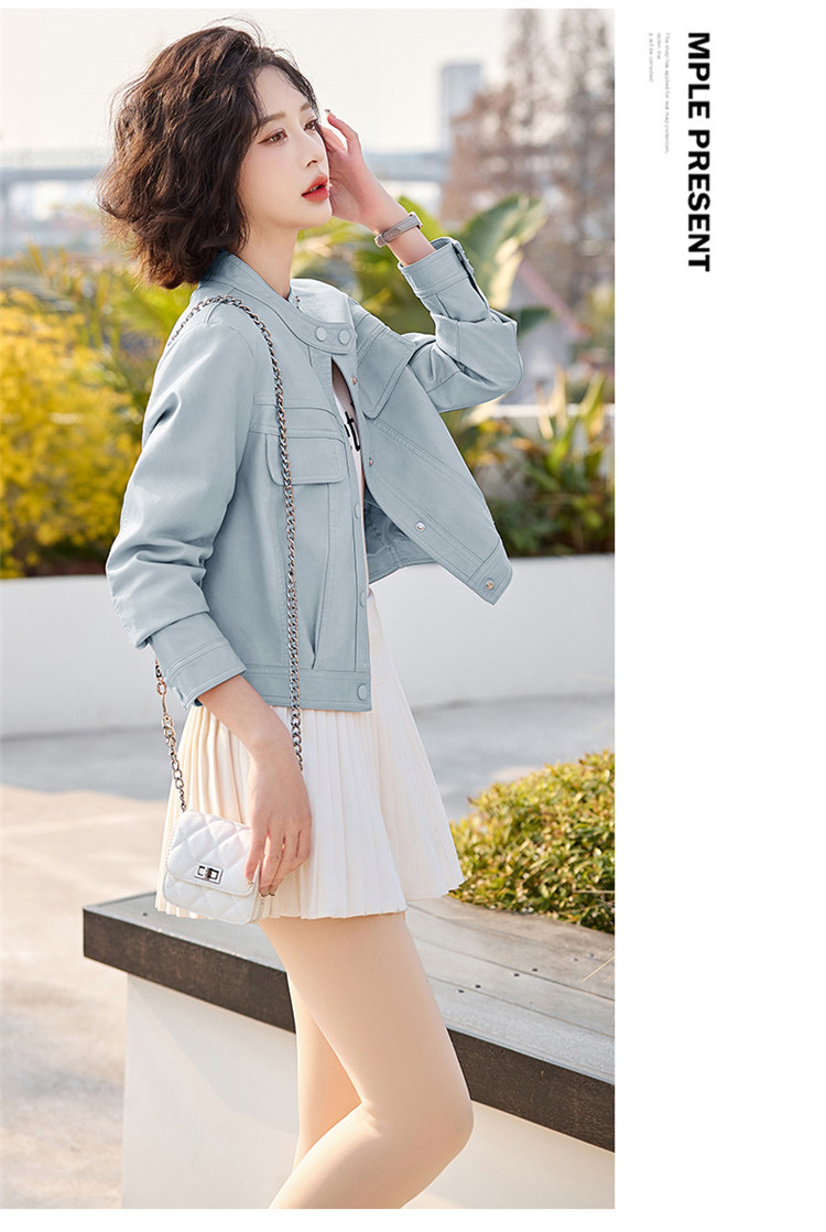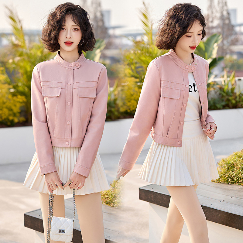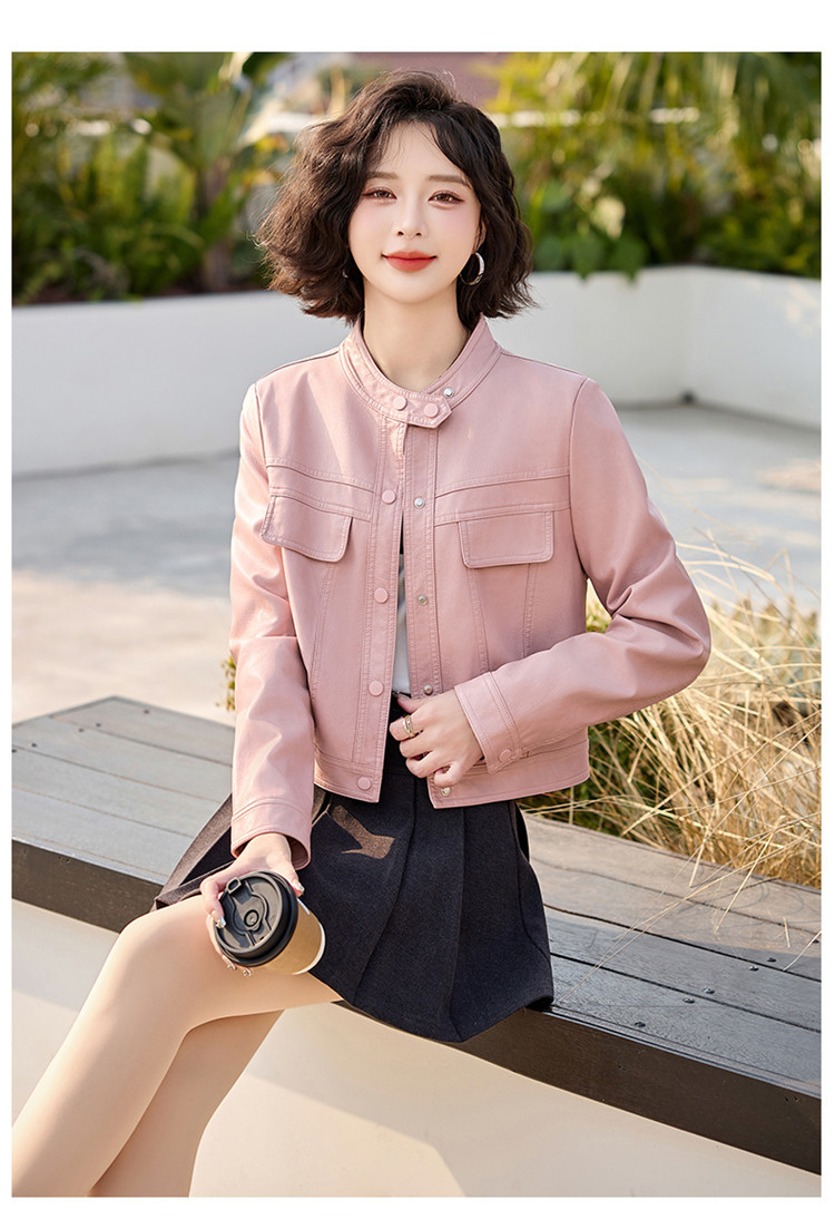 여성용 소형 가죽 자켓 2025 새로운 봄, 가을 작은 짧은 스탠드 칼라 하이 엔드 오토바이 가죽 자켓스토어 가기
