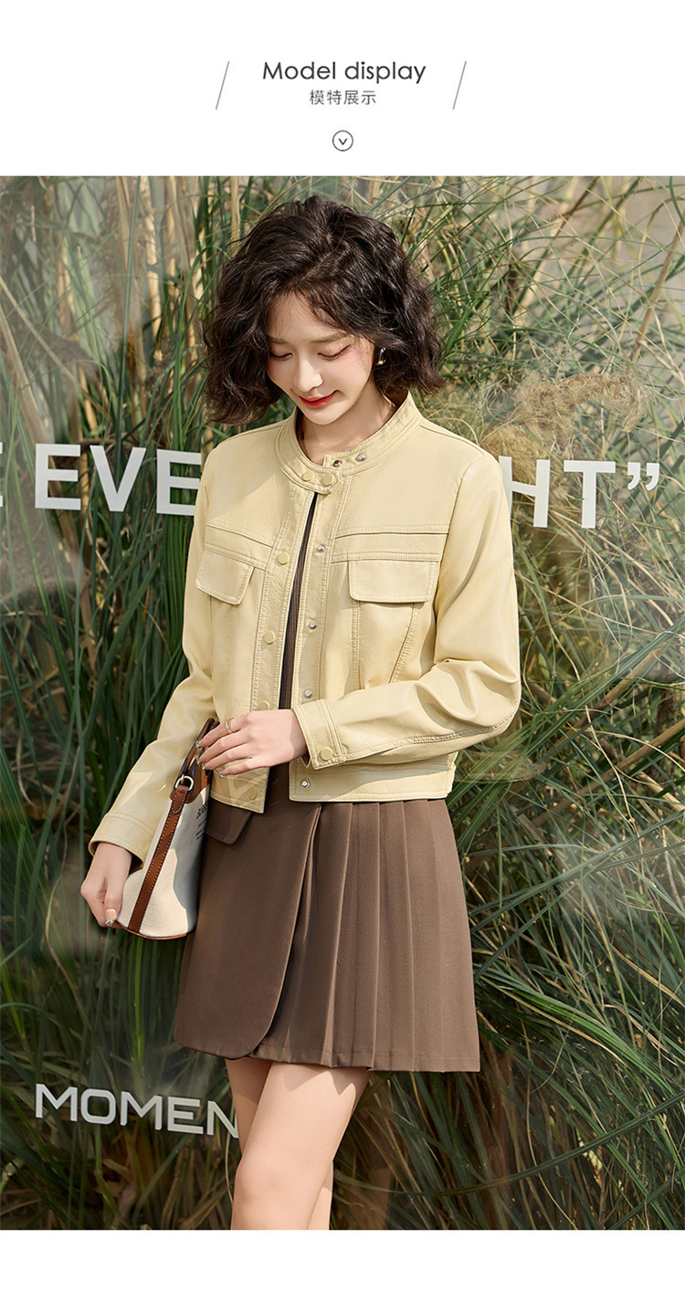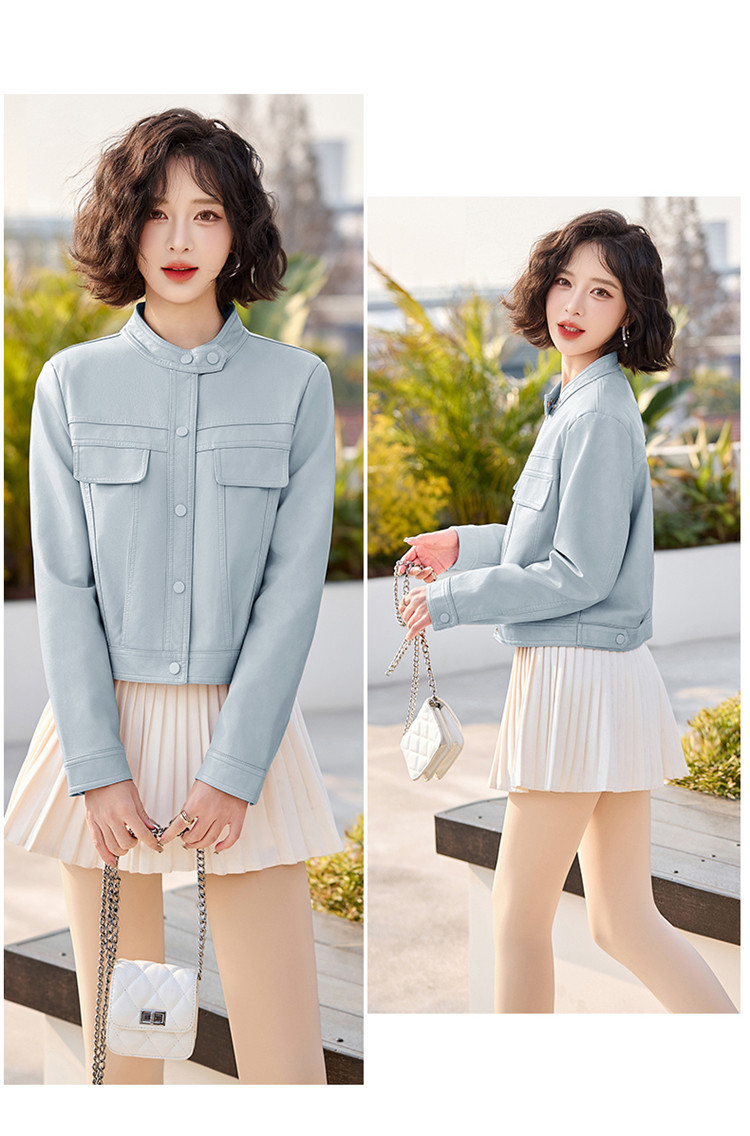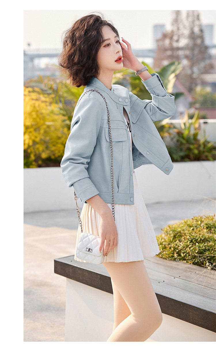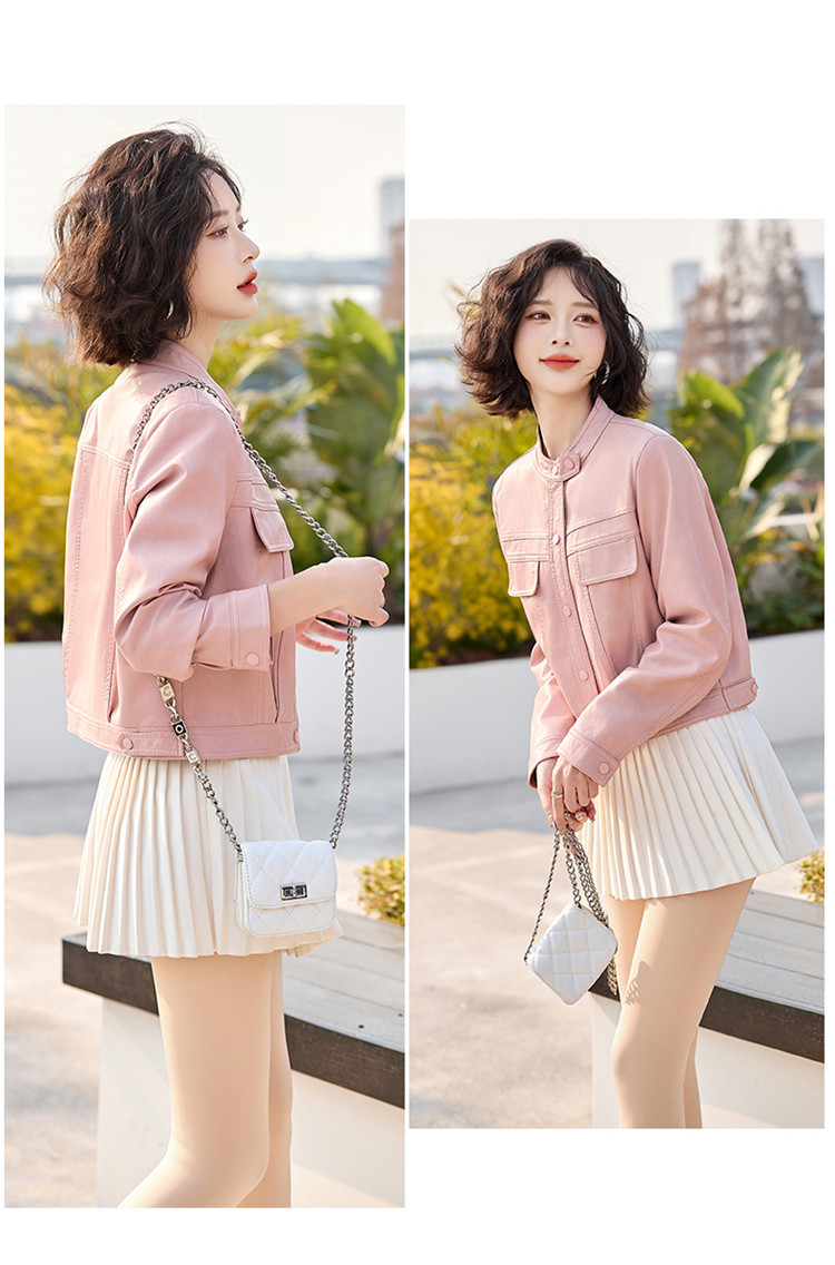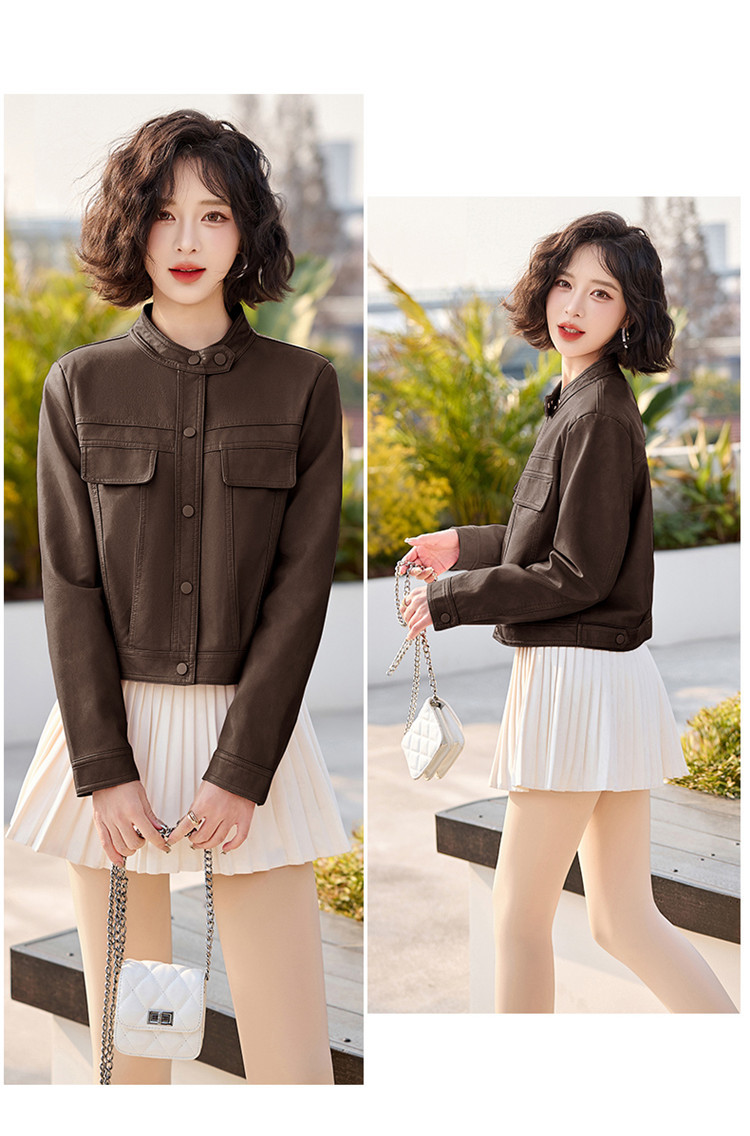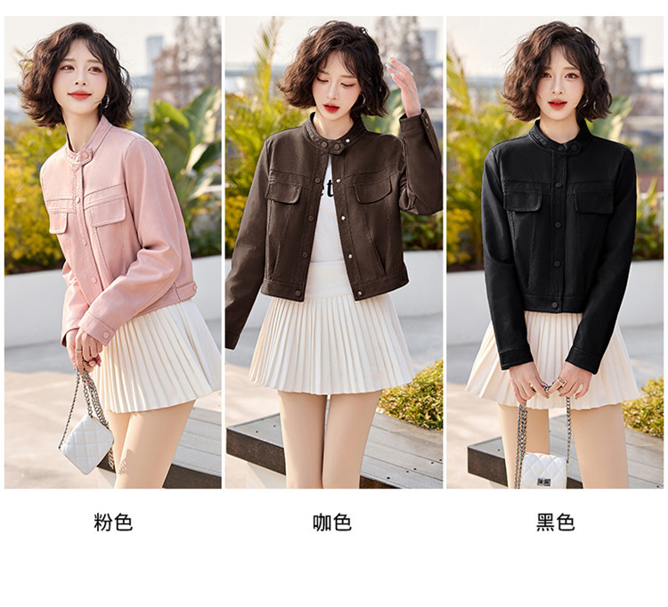 여성용 소형 가죽 자켓 2025 새로운 봄, 가을 작은 짧은 스탠드 칼라 하이 엔드 오토바이 가죽 자켓스토어 가기